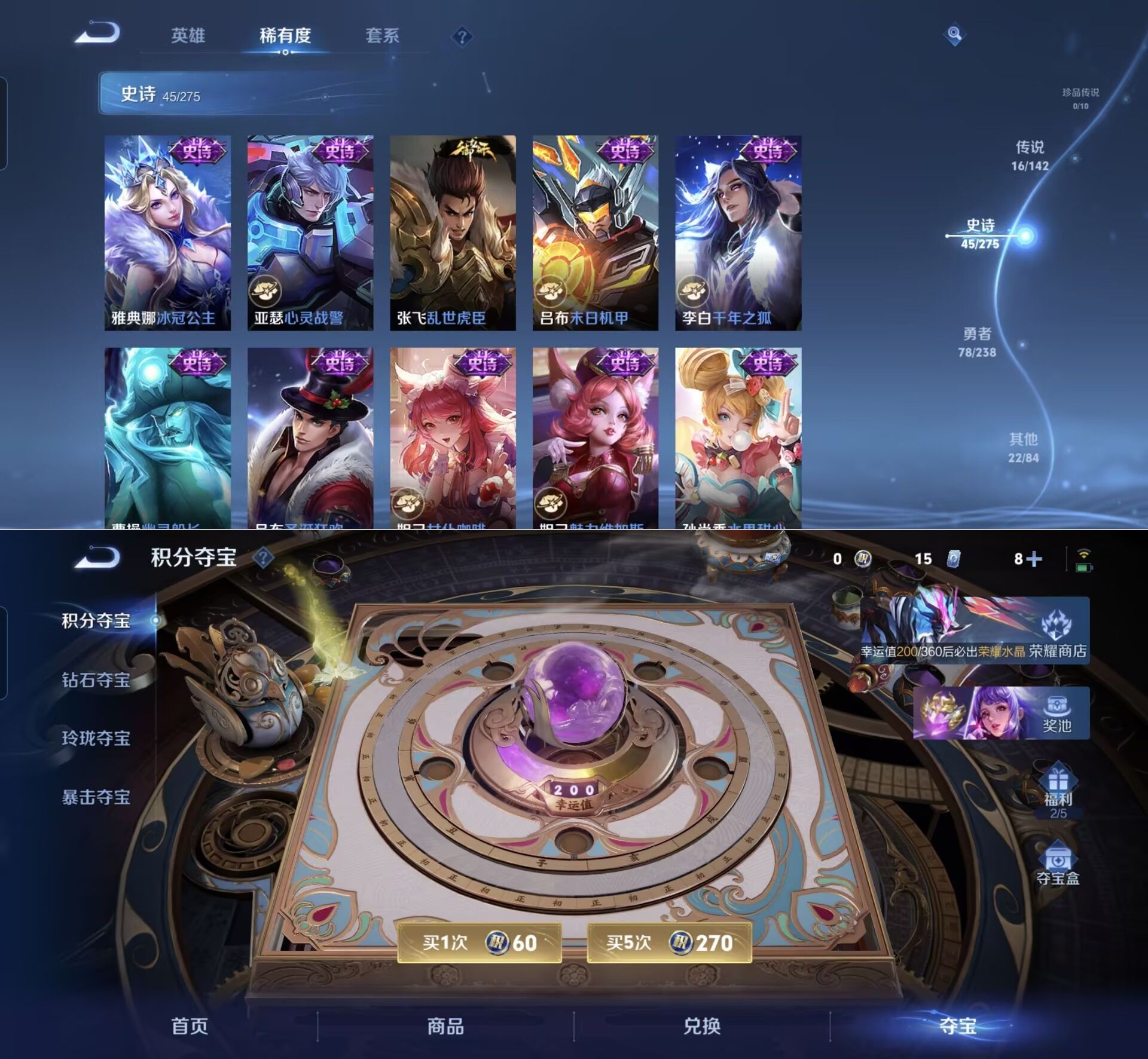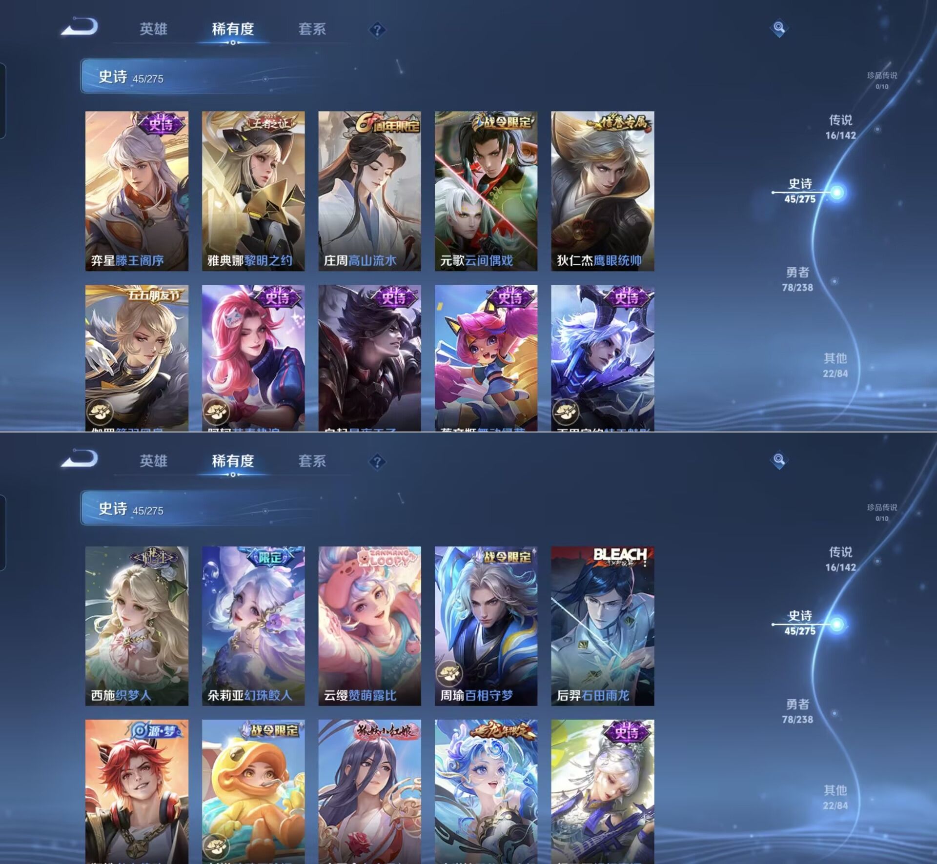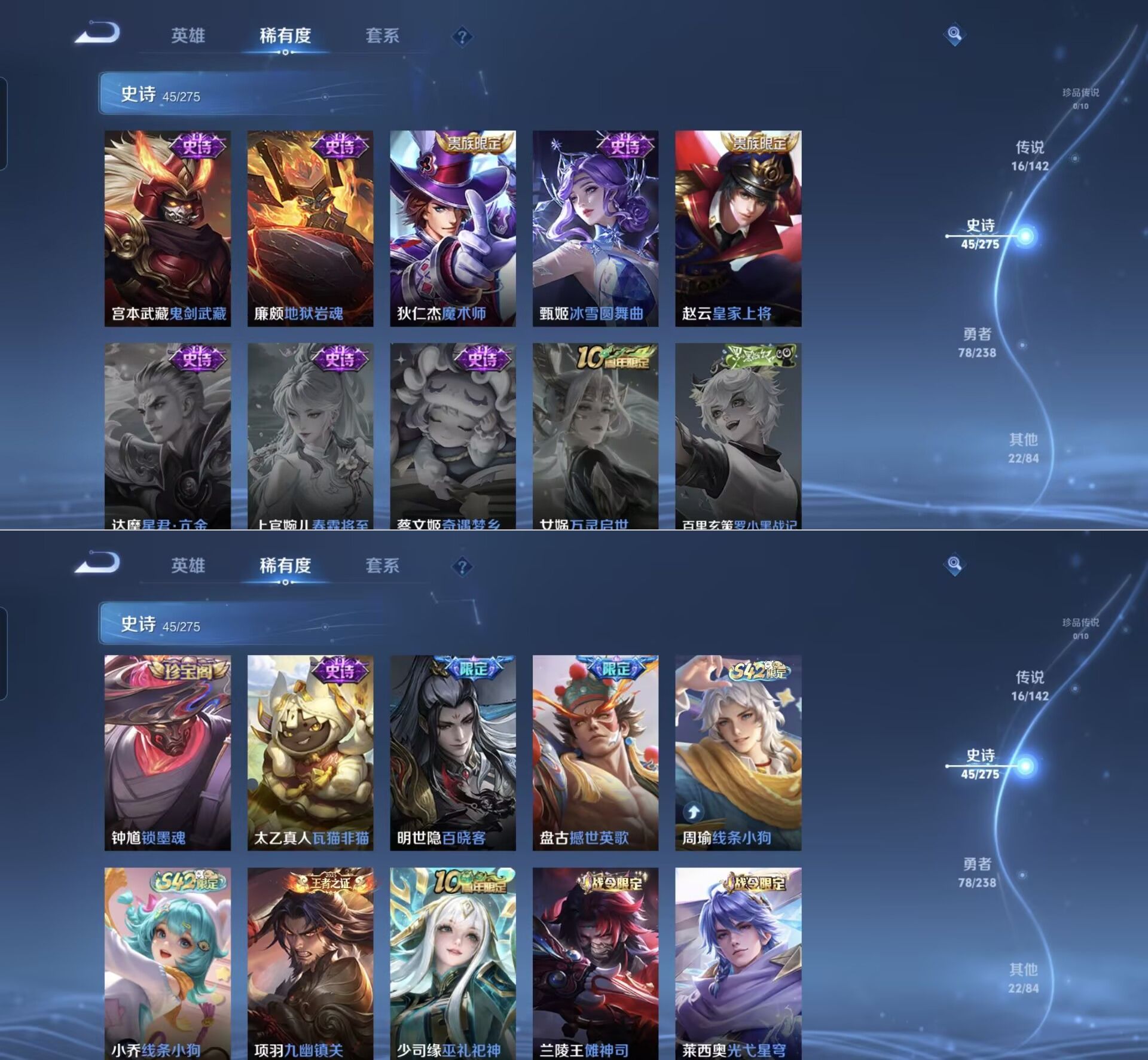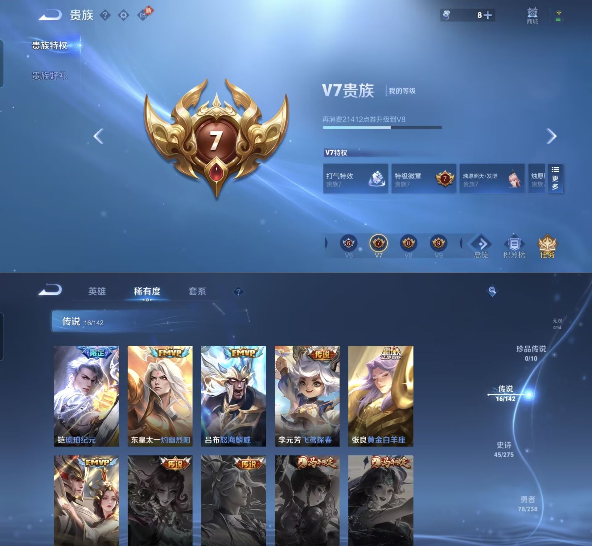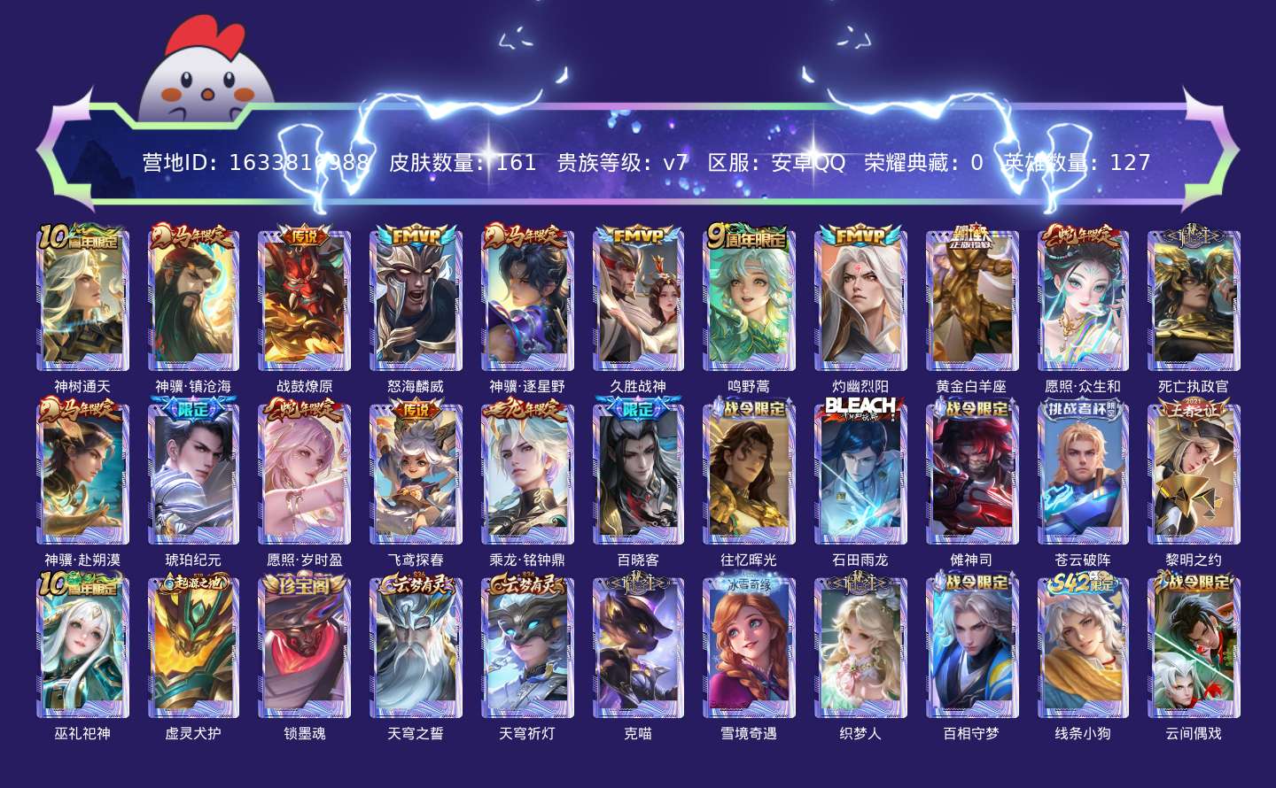 贵族等级:v7皮肤数:161传说品质16 生肖限定7 英雄数:127