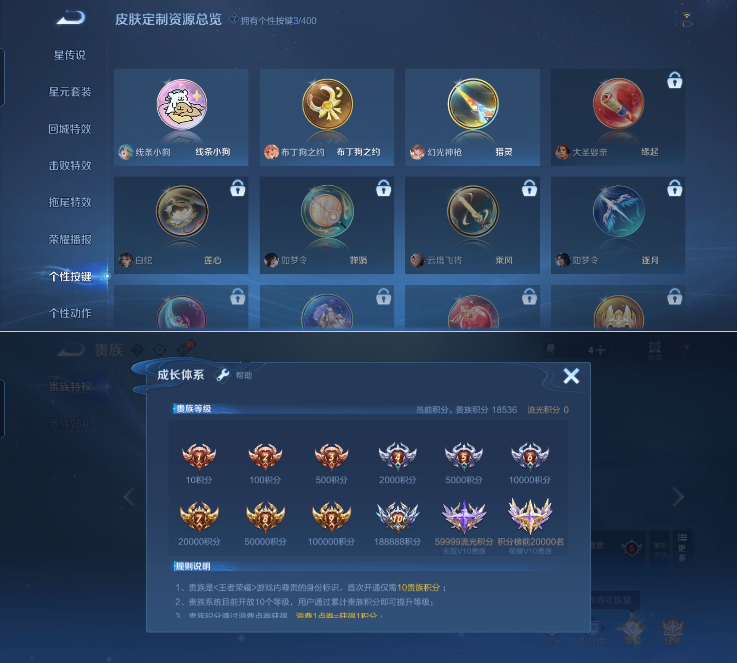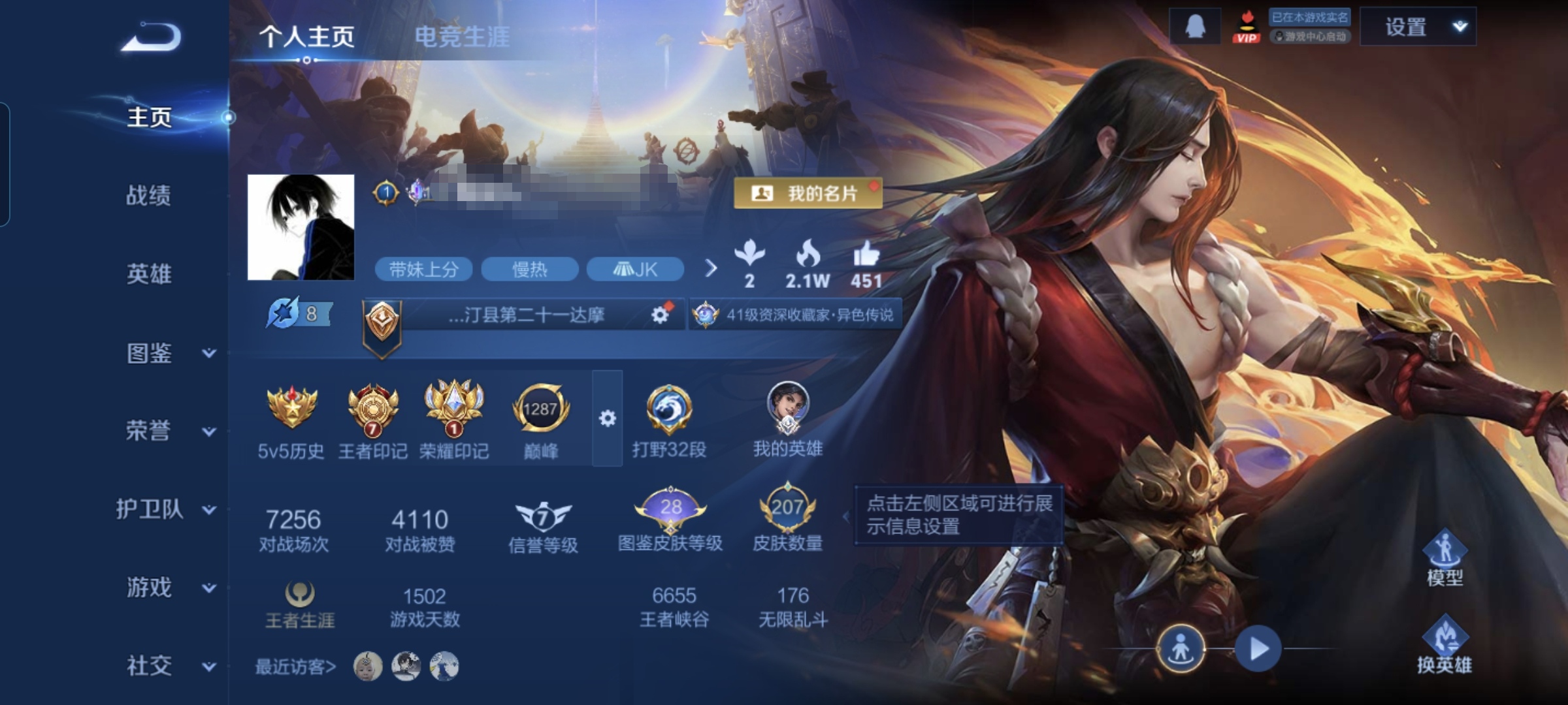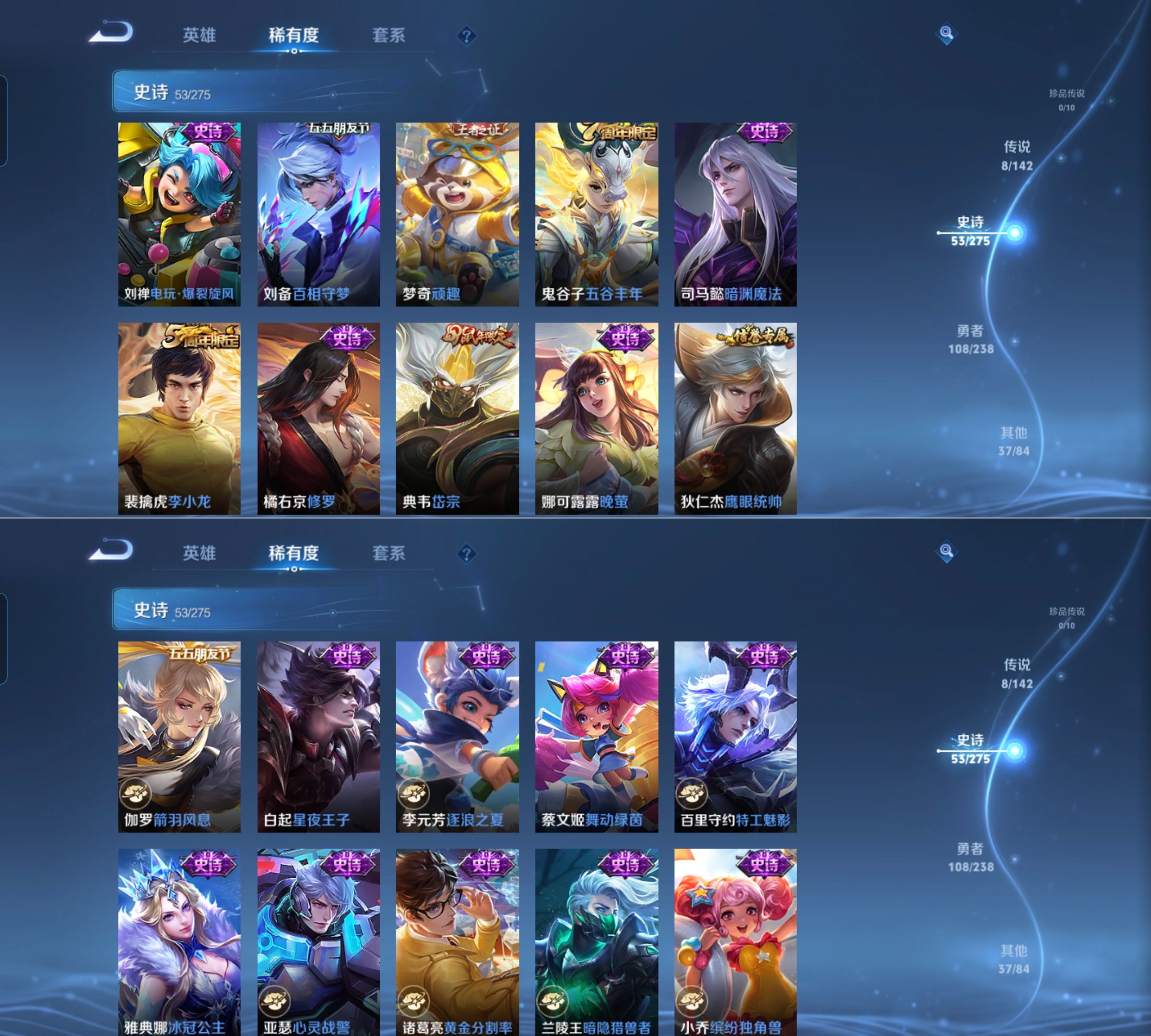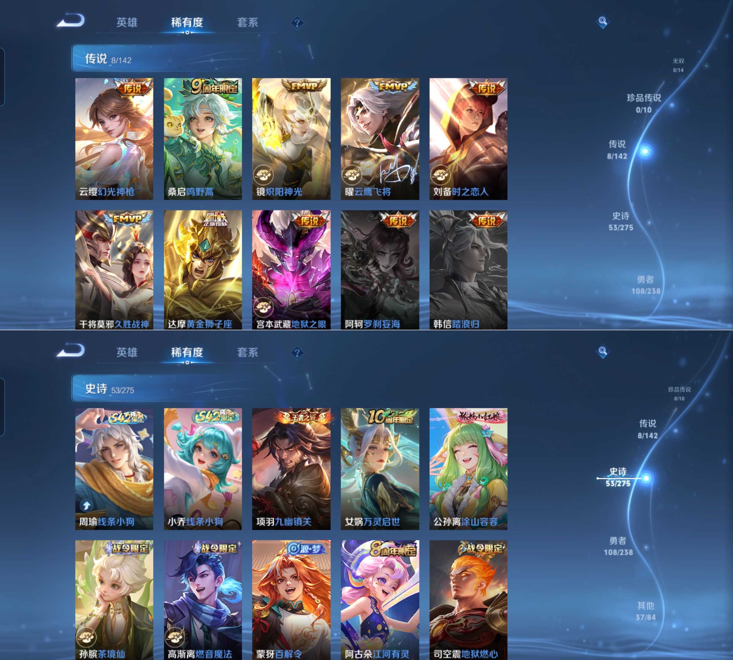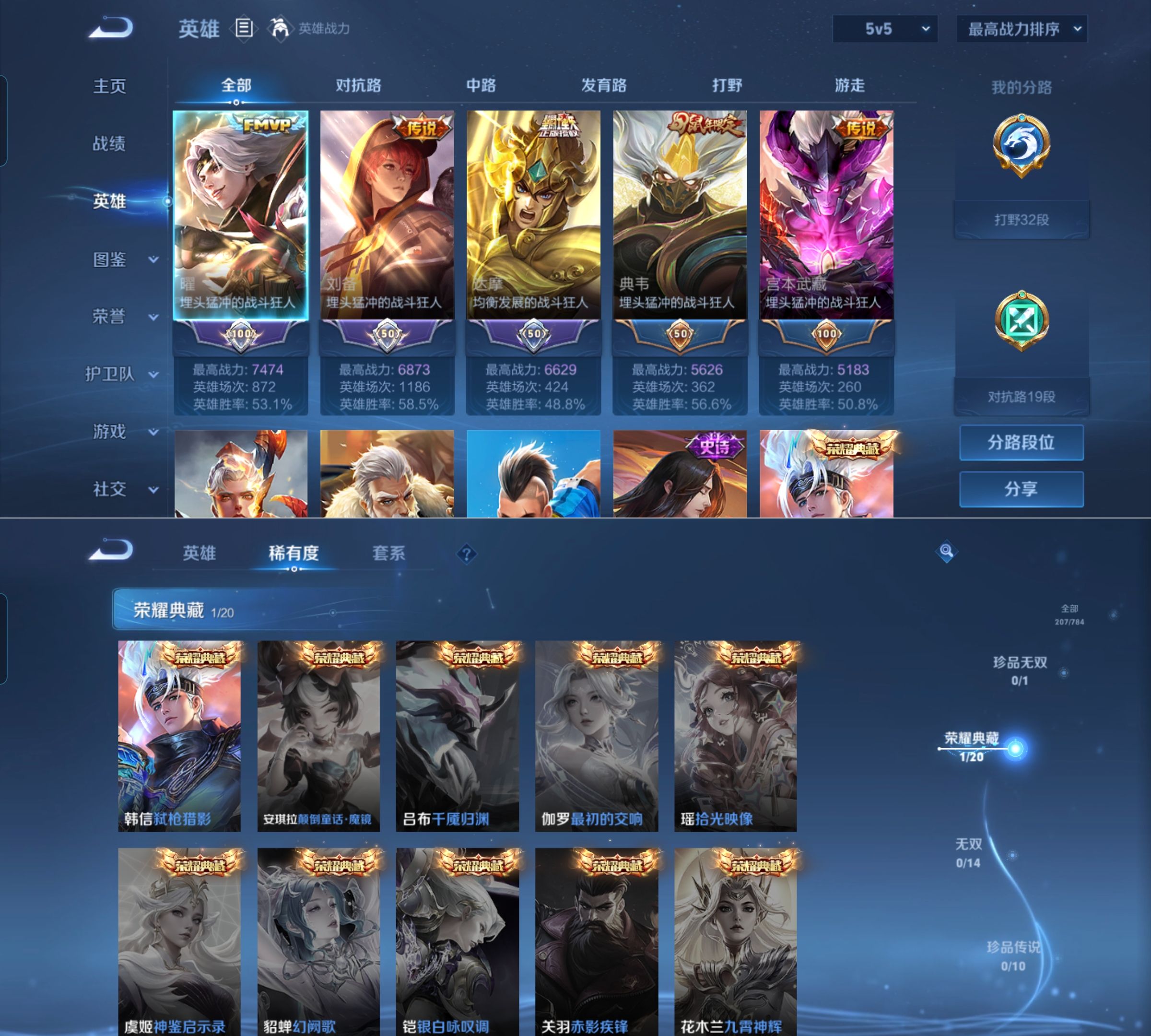 贵族等级:v6皮肤数:207生肖限定1 传说品质8 荣耀典藏1 英雄数:125