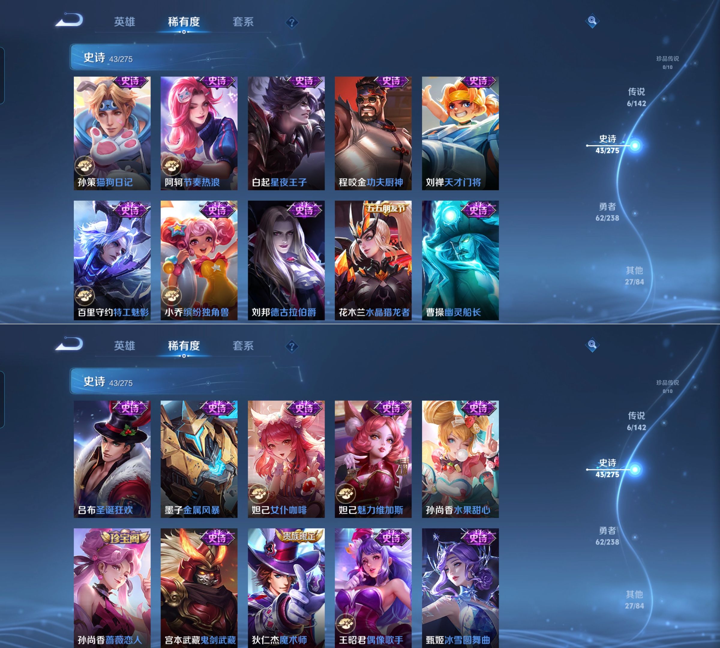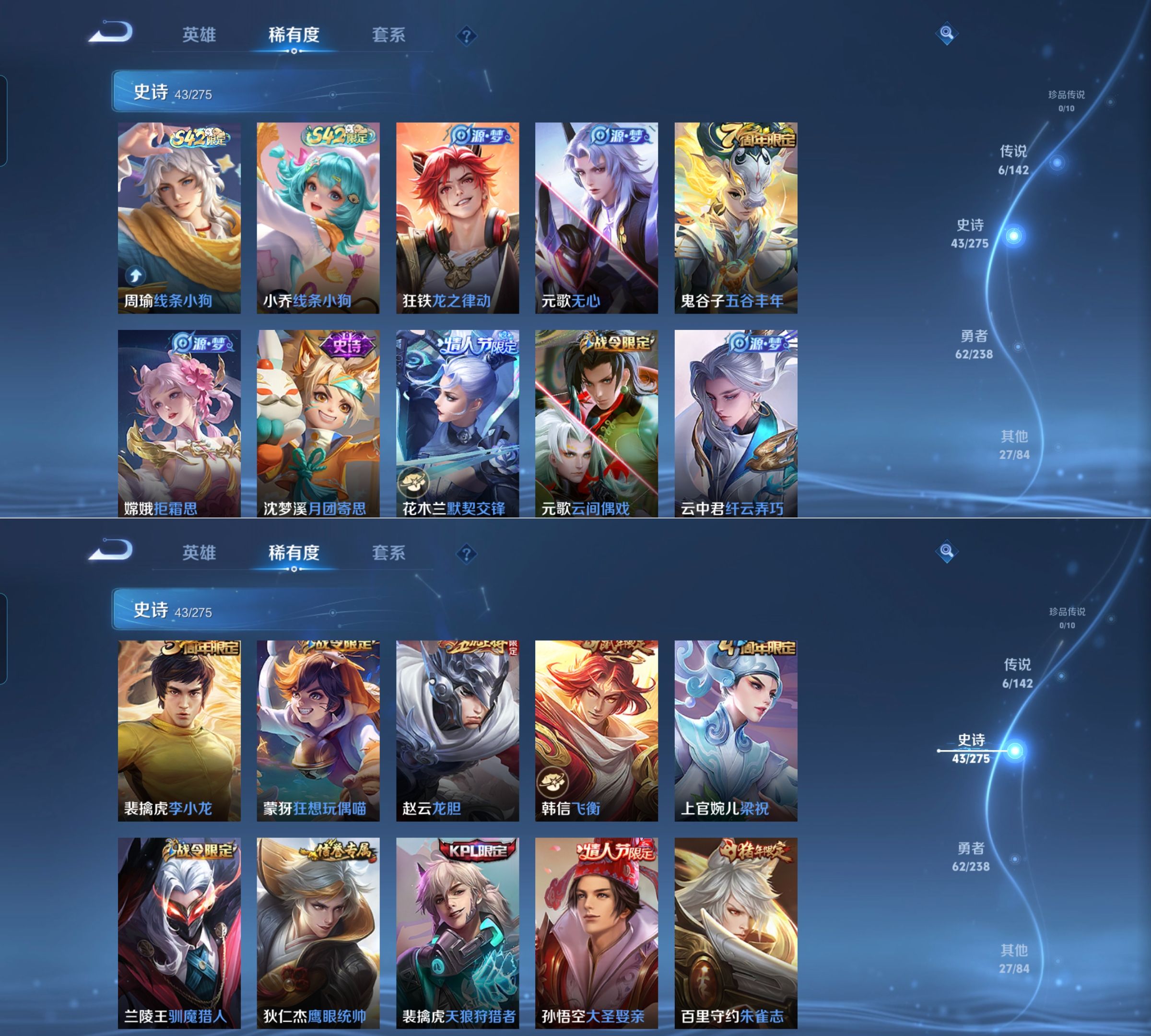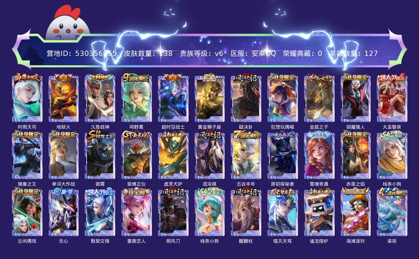 贵族等级:v6皮肤数:138传说品质6 生肖限定3 情人节限定2 英雄数:127