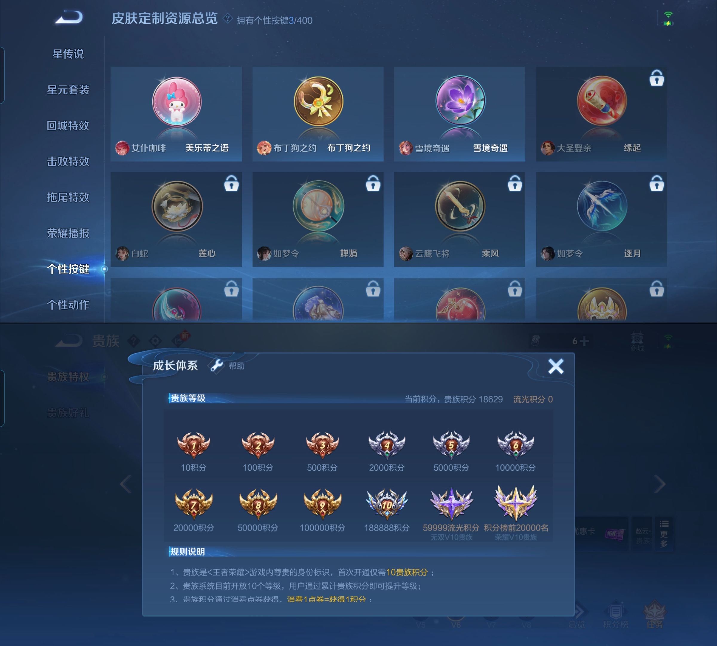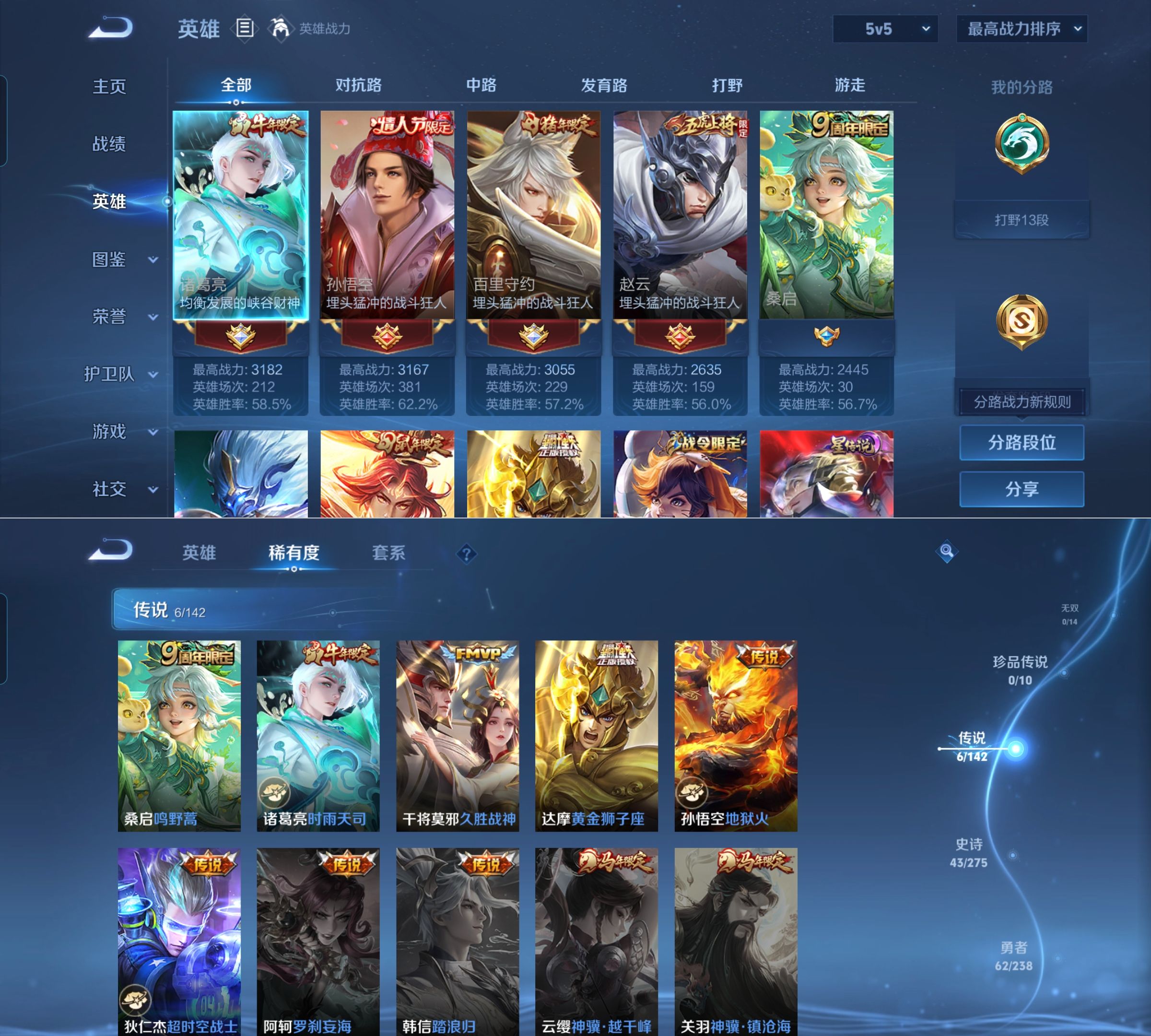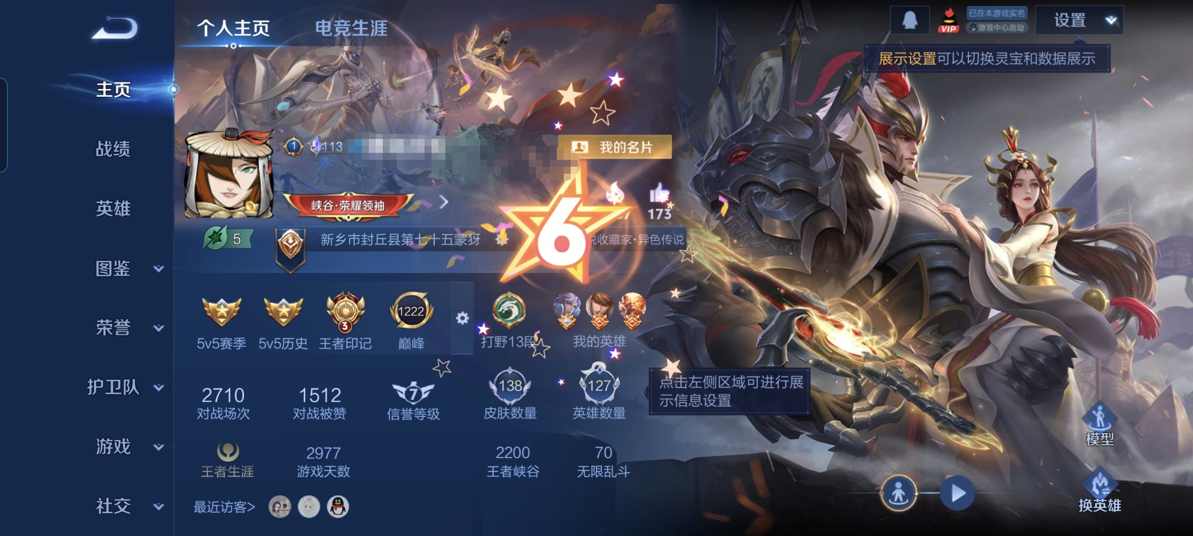 贵族等级:v6皮肤数:138传说品质6 生肖限定3 情人节限定2 英雄数:127
