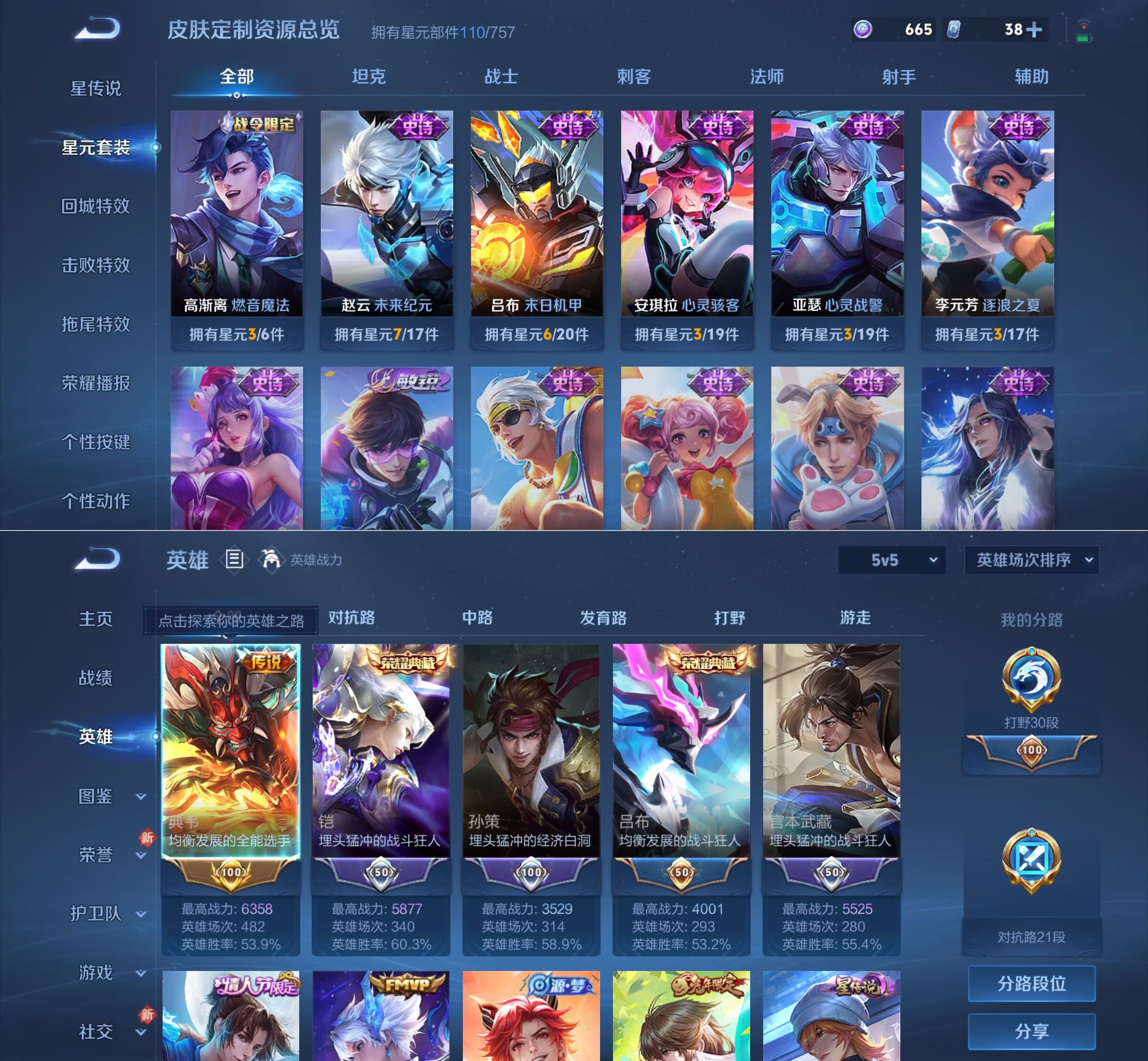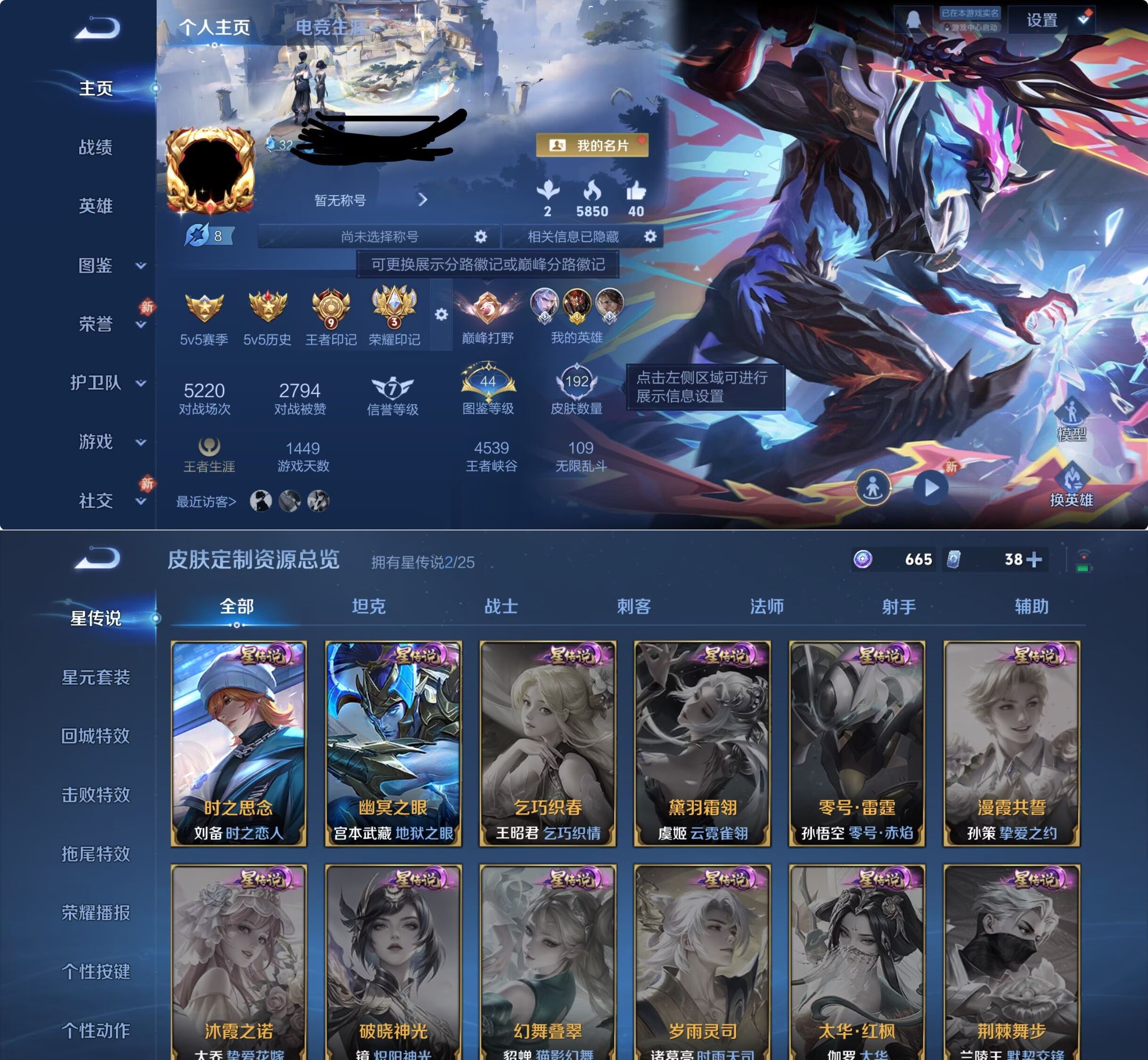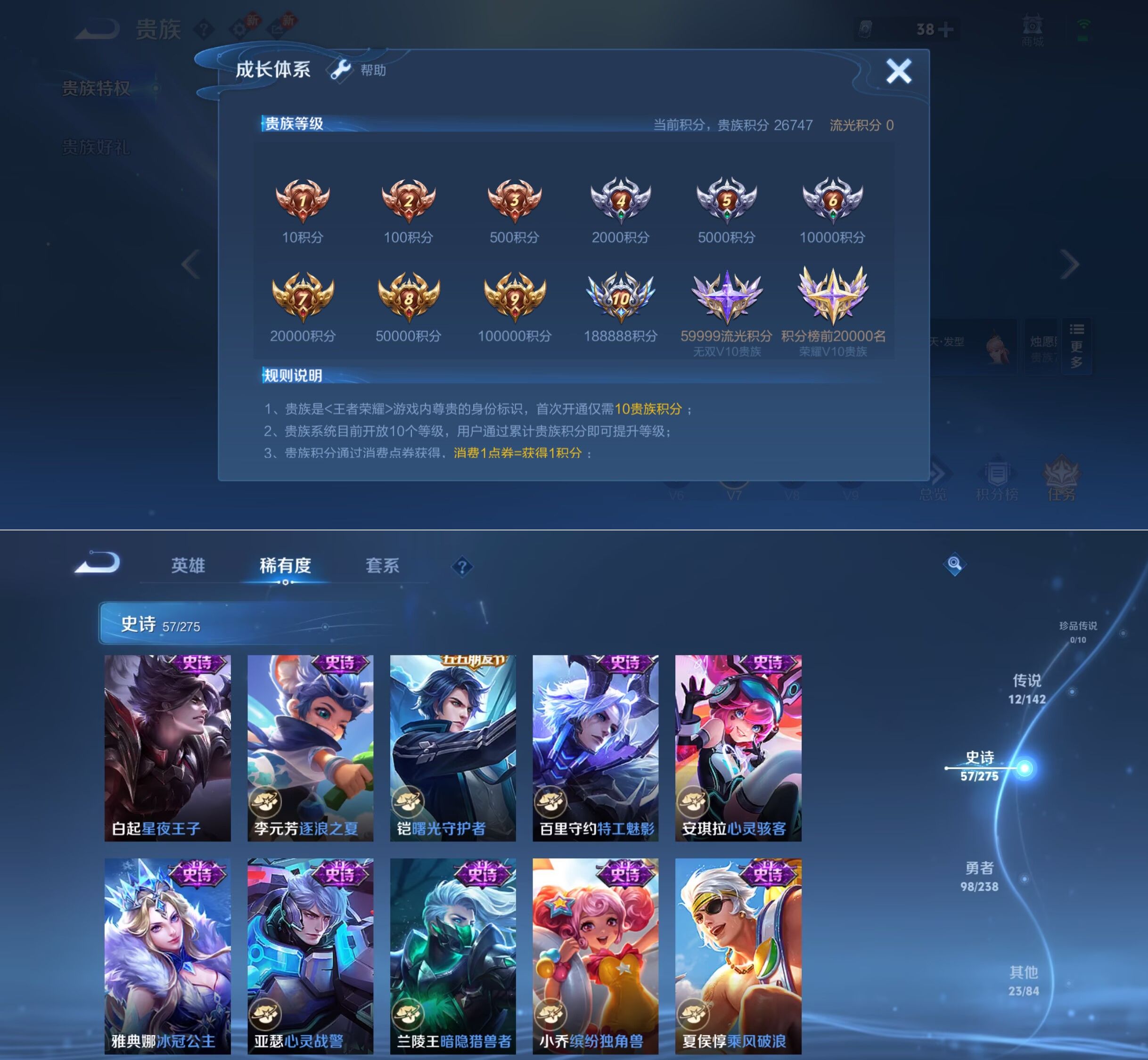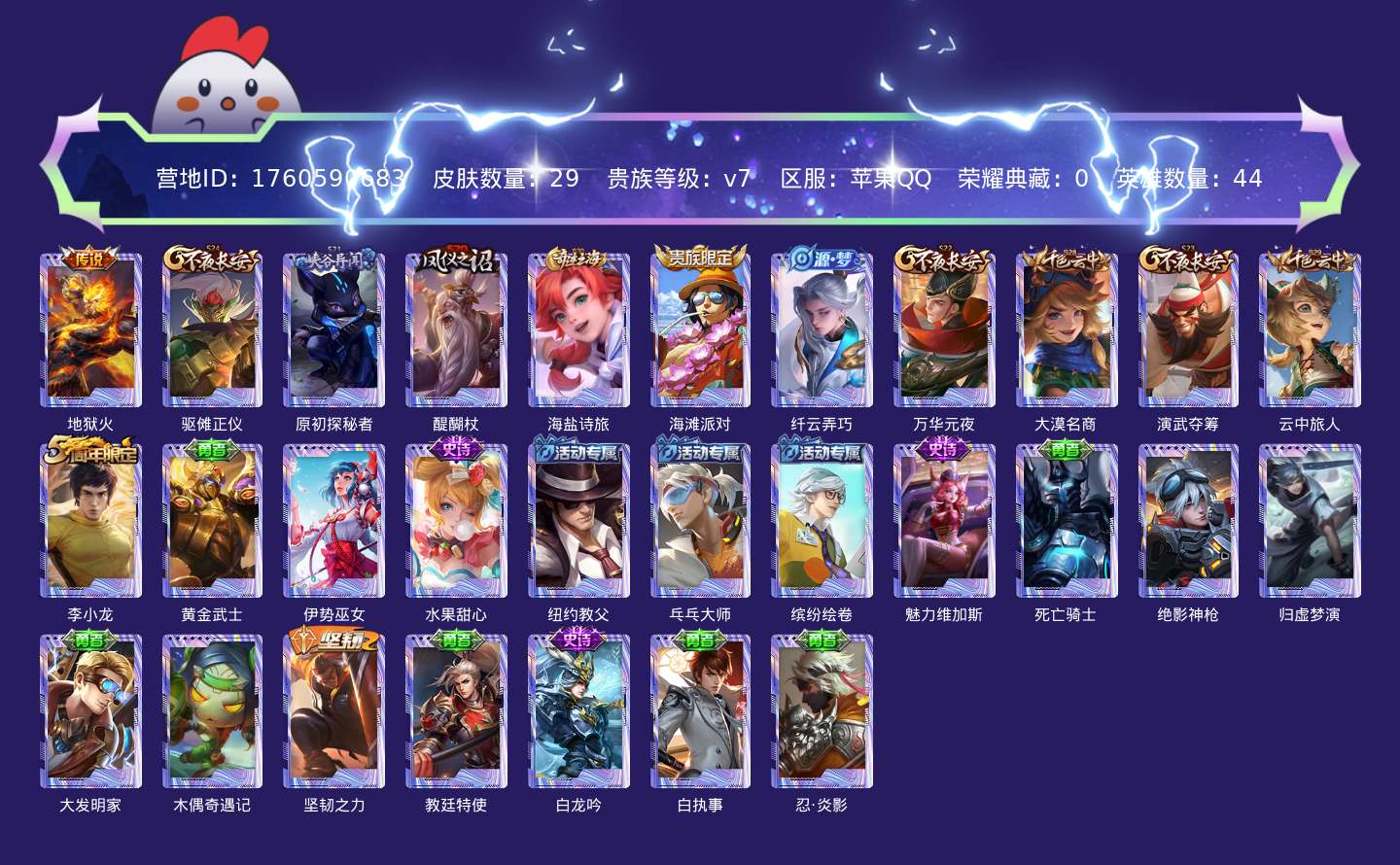 贵族等级:v7皮肤数:29传说品质1 英雄数:44