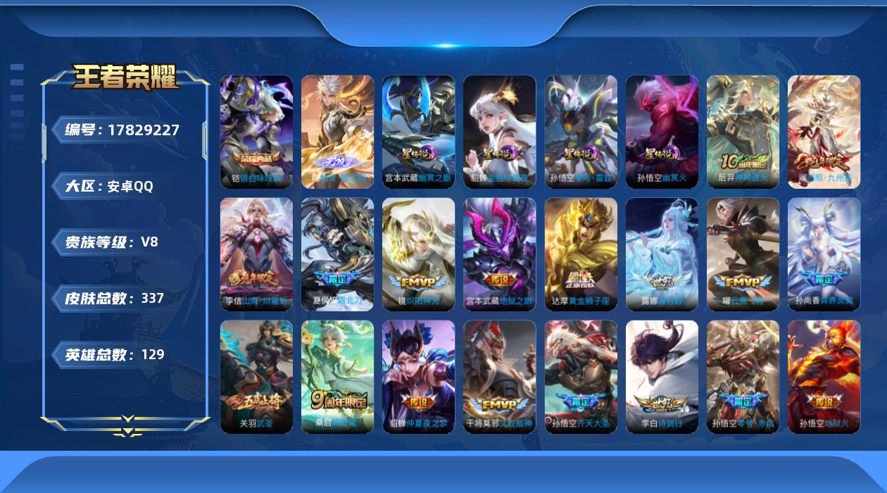 贵族等级:v8皮肤数:337情人节限定1 传说品质20 生肖限定3 无双1 荣耀典藏1 英雄数:129