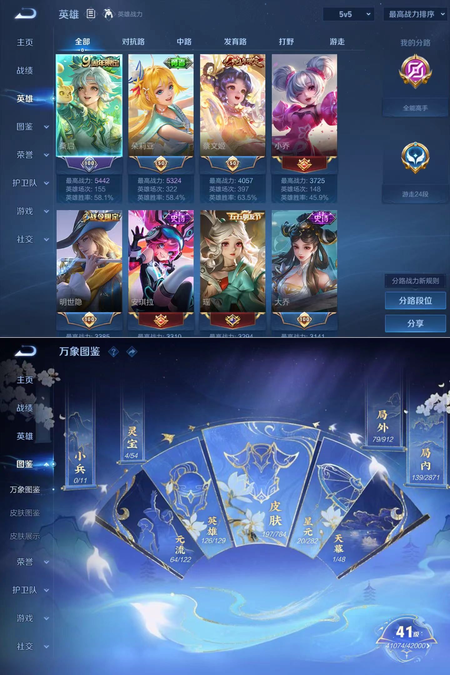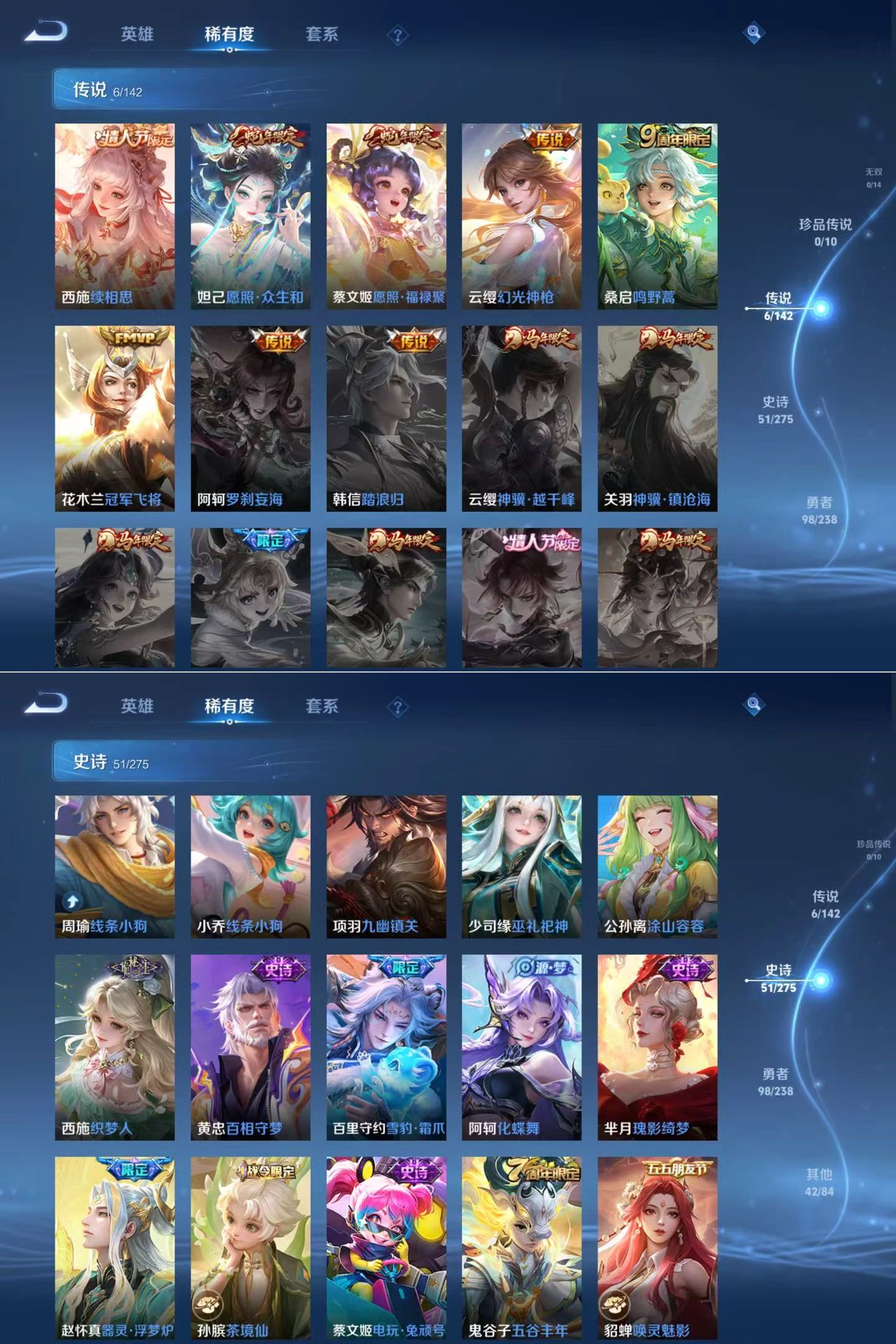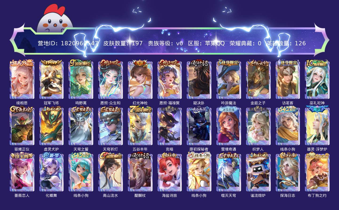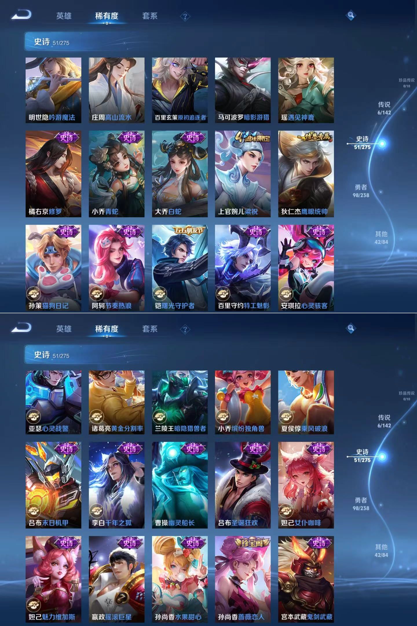 贵族等级:v6皮肤数:197传说品质6 情人节限定1 生肖限定2 英雄数:126
