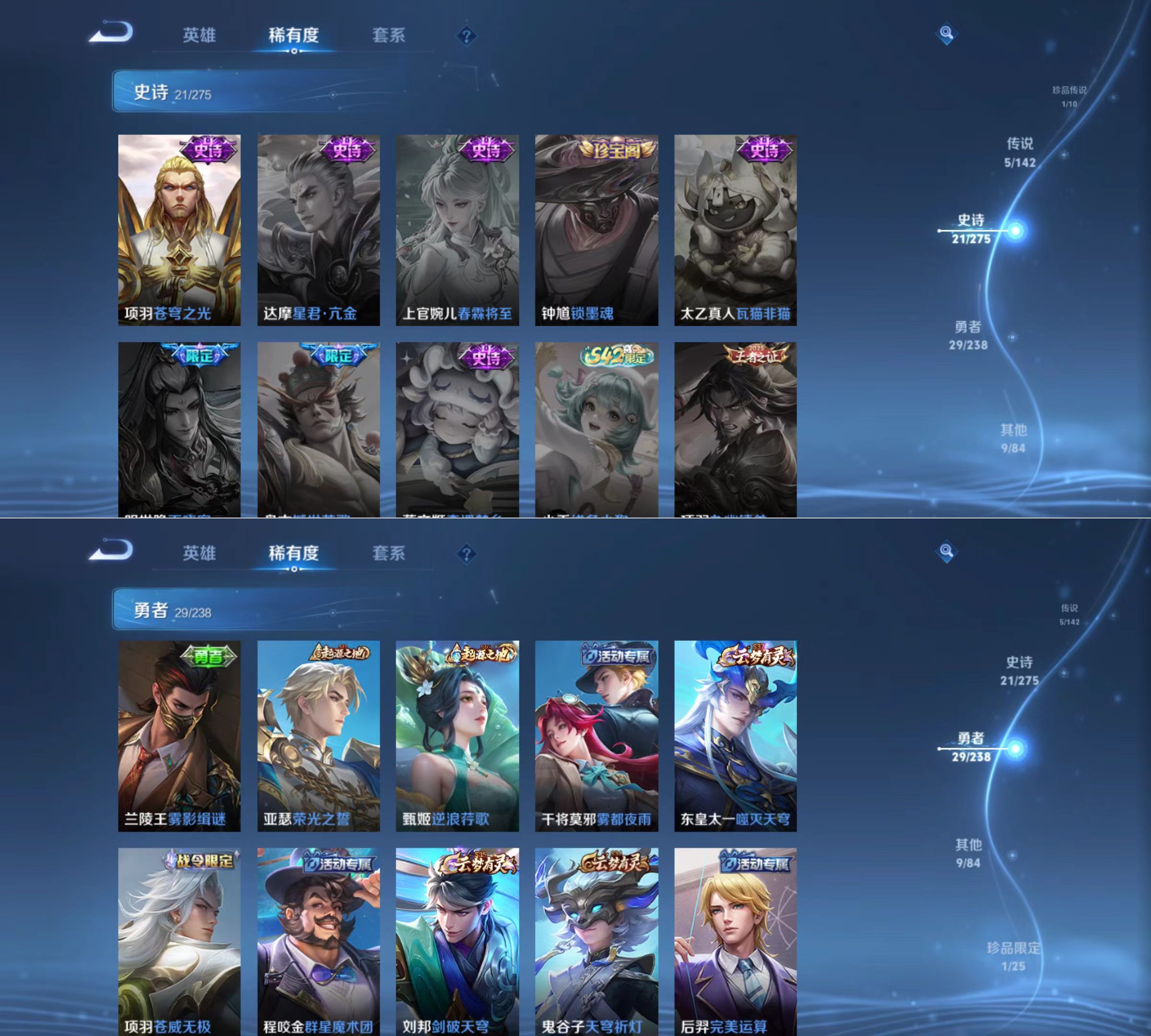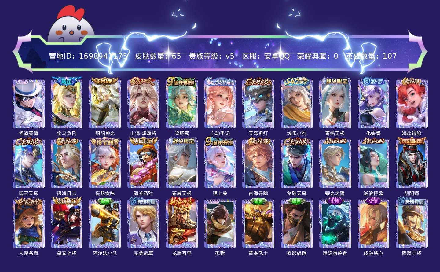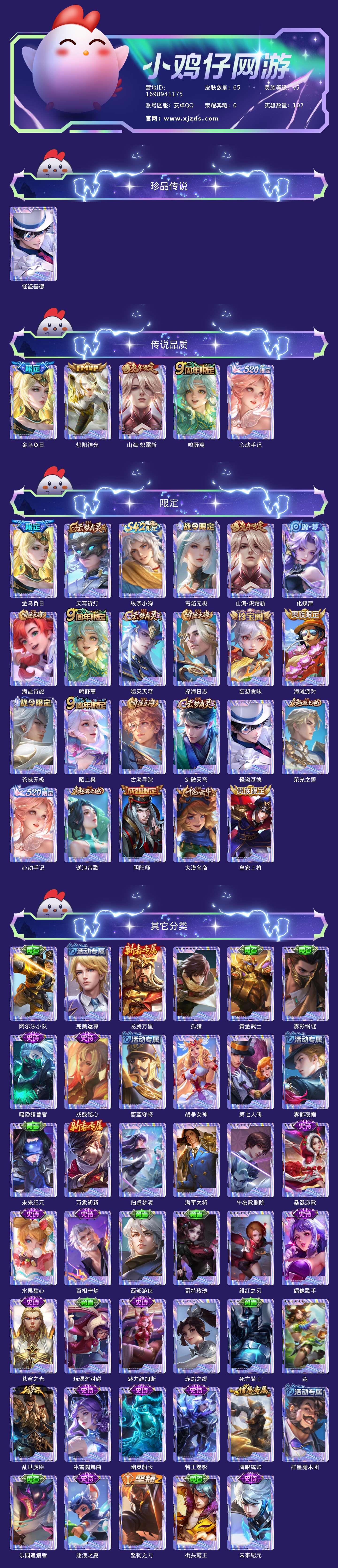 贵族等级:v5皮肤数:65传说品质5 生肖限定1 珍品传说1 英雄数:107