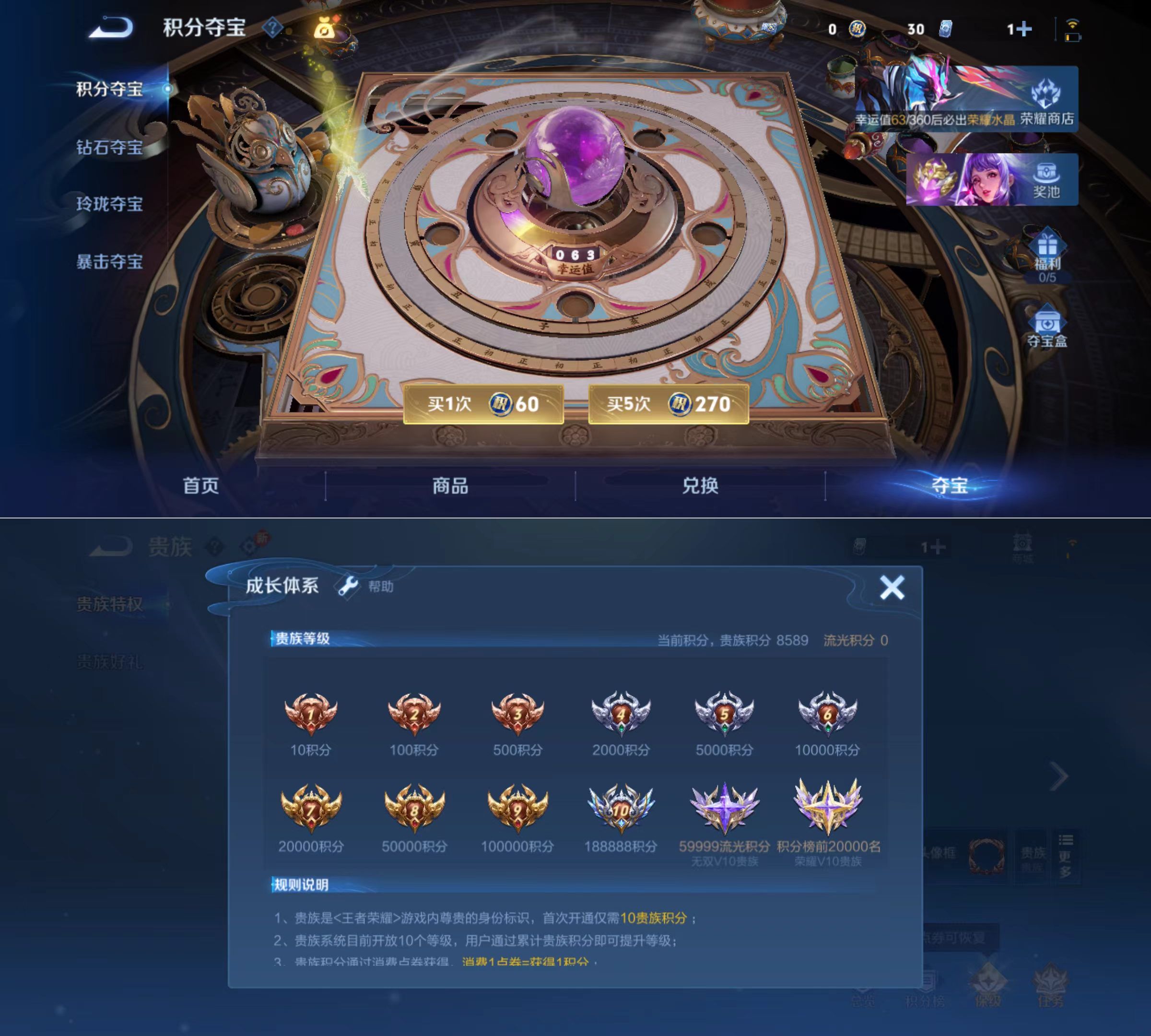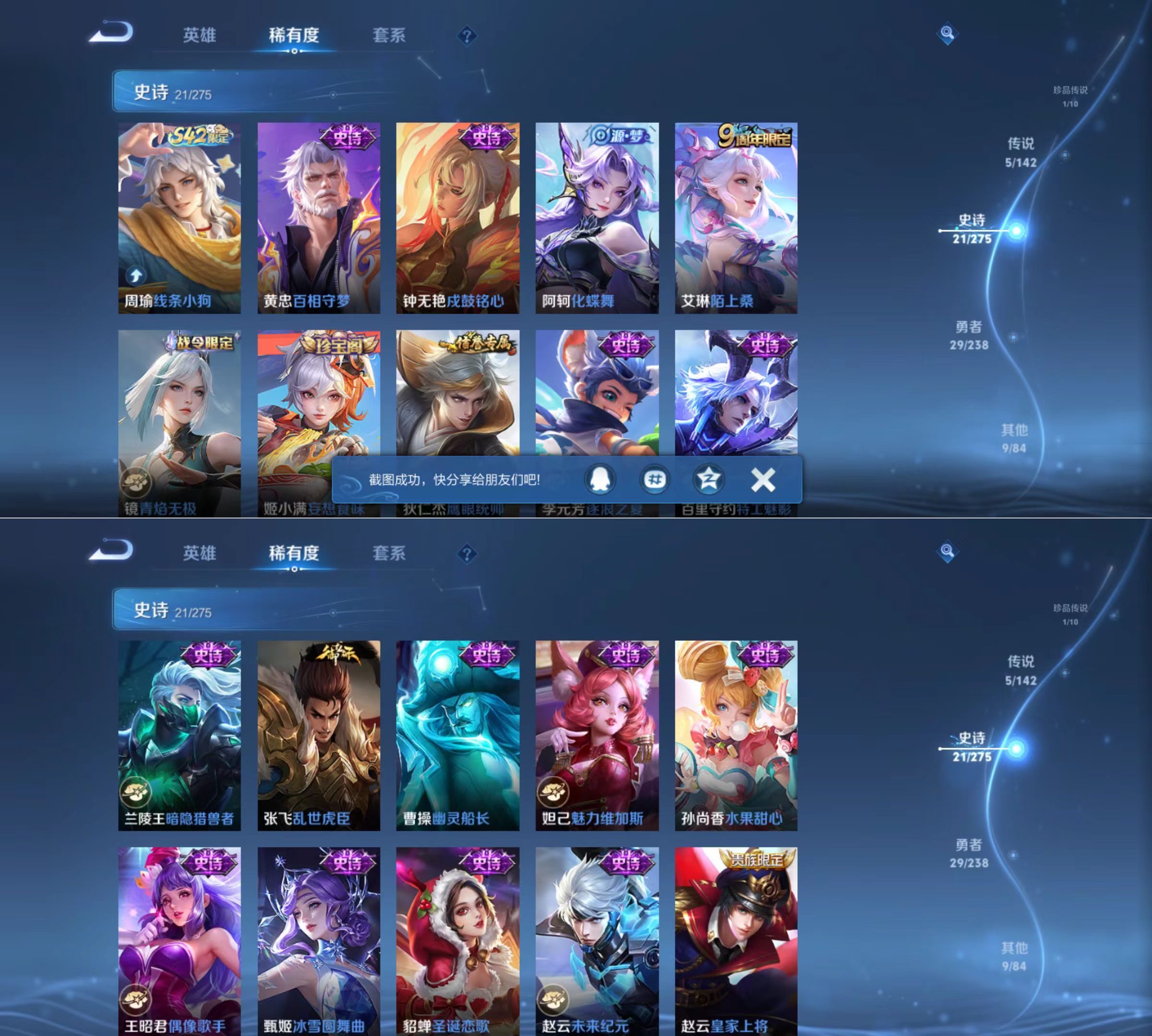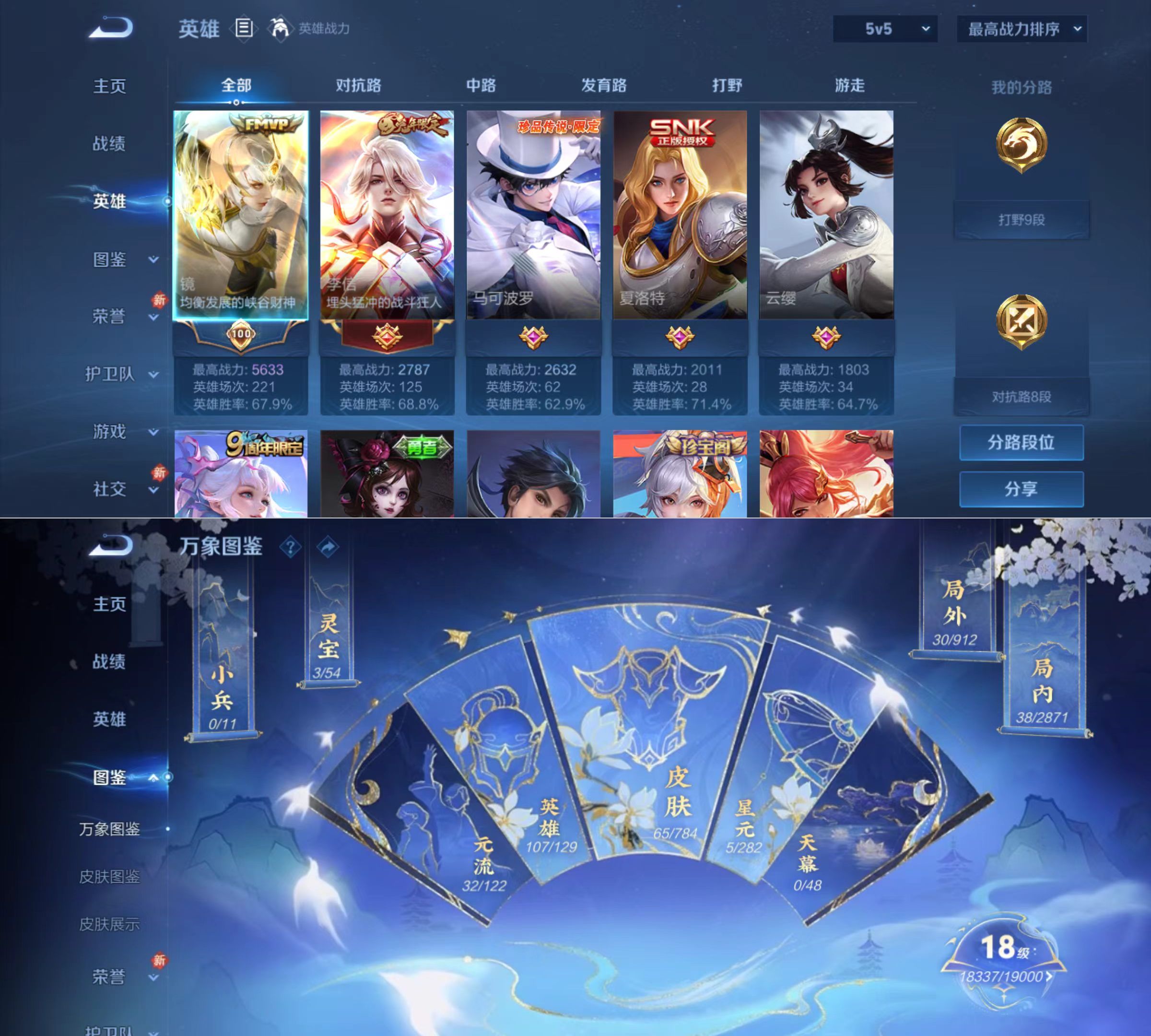 贵族等级:v5皮肤数:65传说品质5 生肖限定1 珍品传说1 英雄数:107