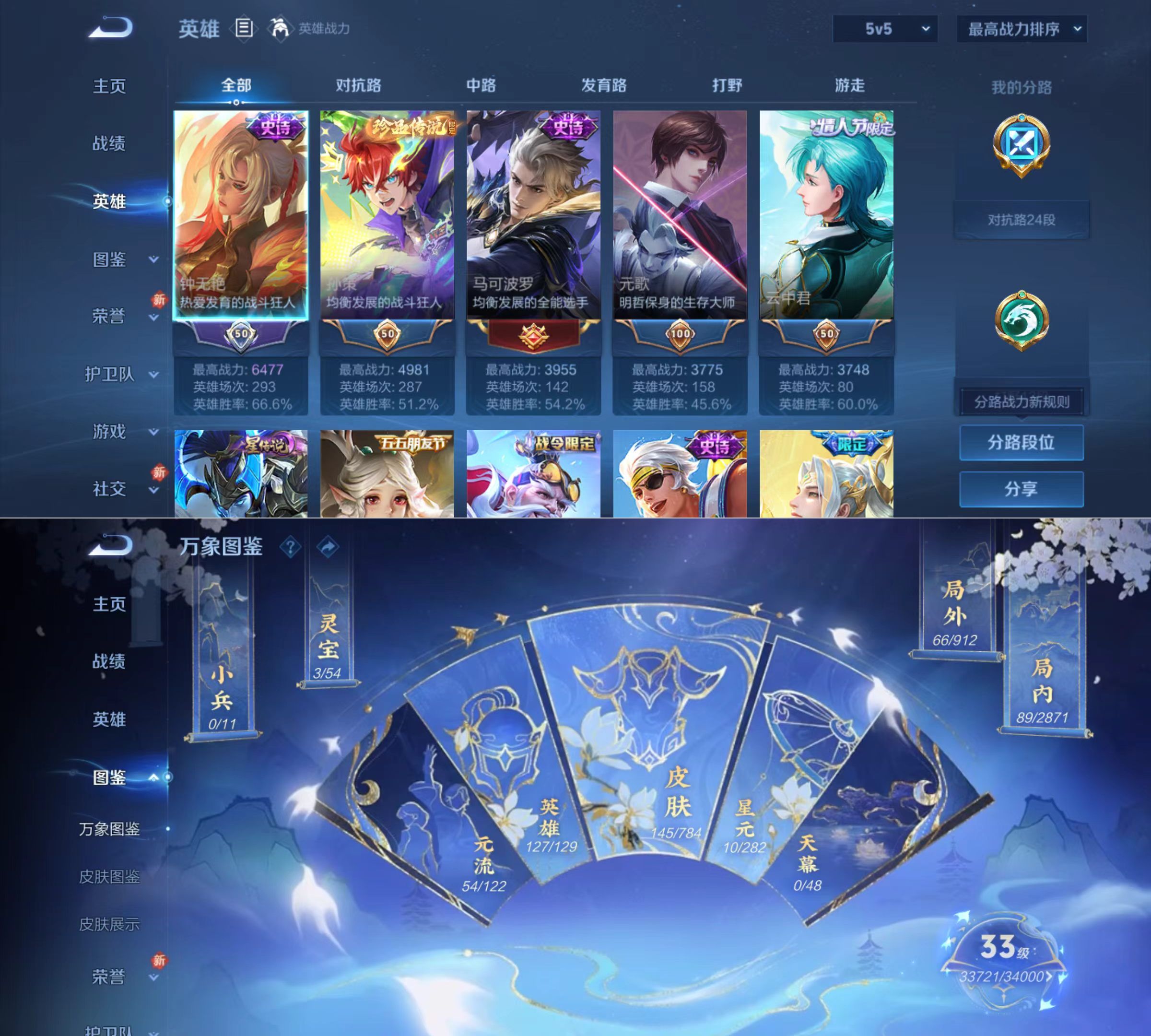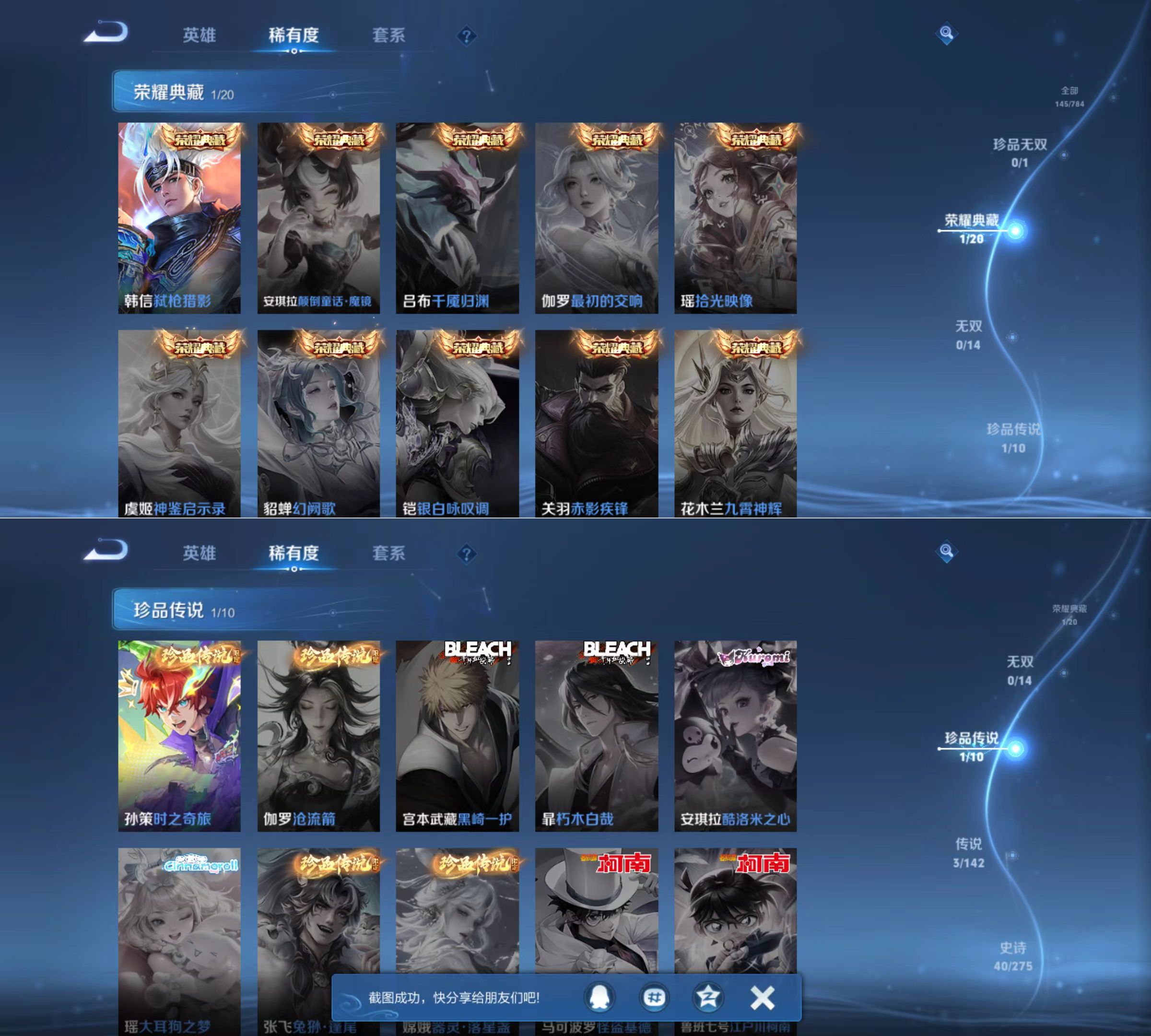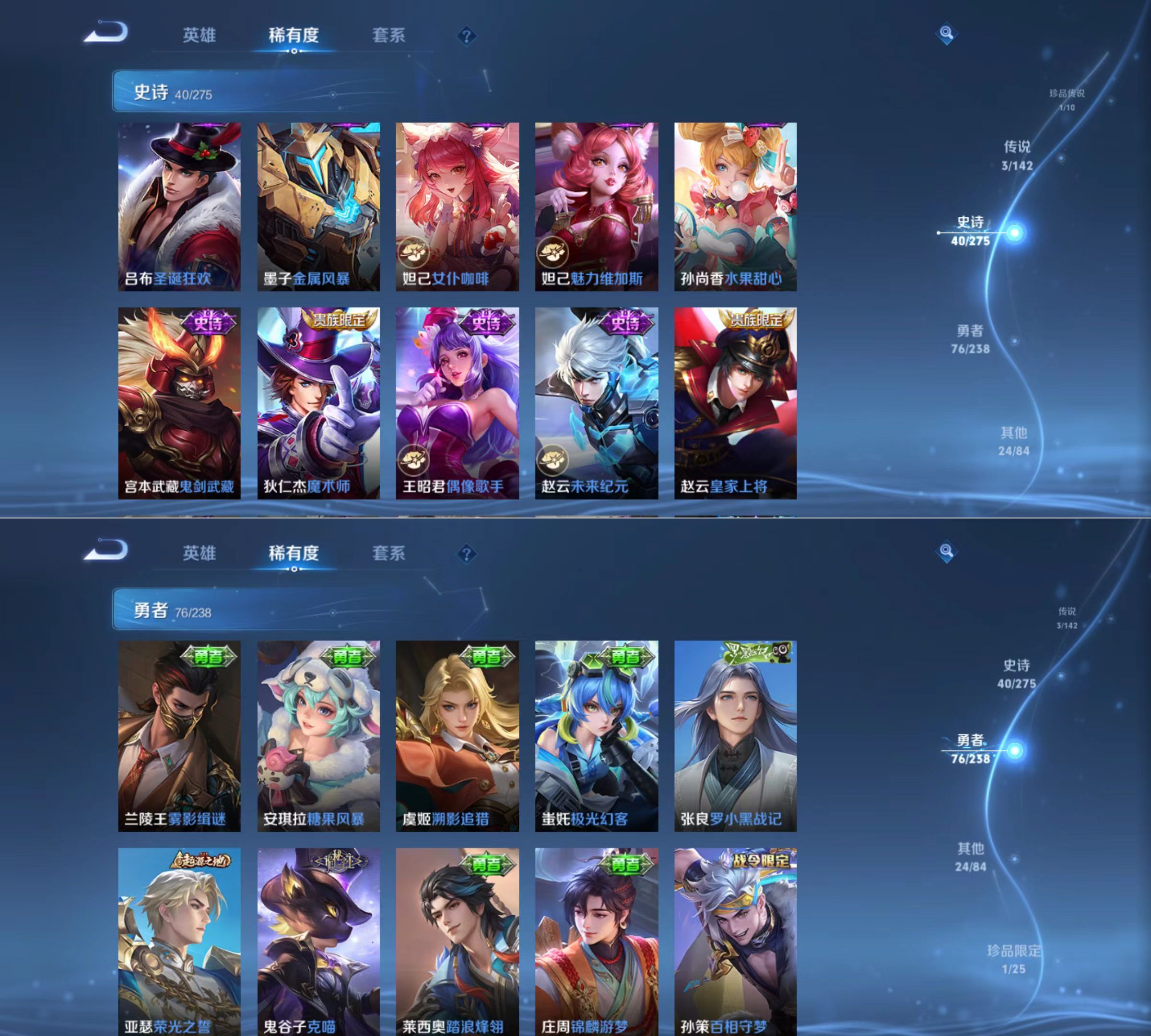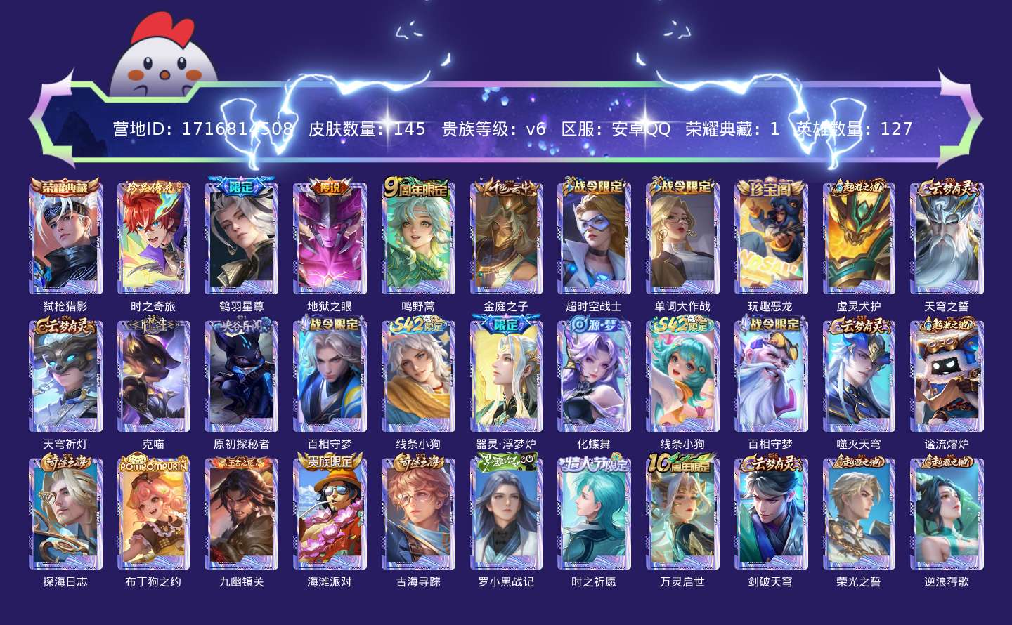 贵族等级:v6皮肤数:145传说品质3 情人节限定1 珍品传说1 荣耀典藏1 英雄数:127