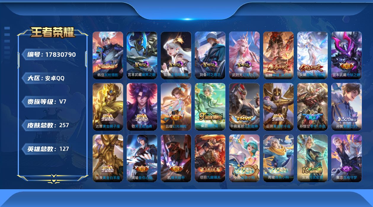 贵族等级:v7皮肤数:257传说品质14 生肖限定4 荣耀典藏1 英雄数:127