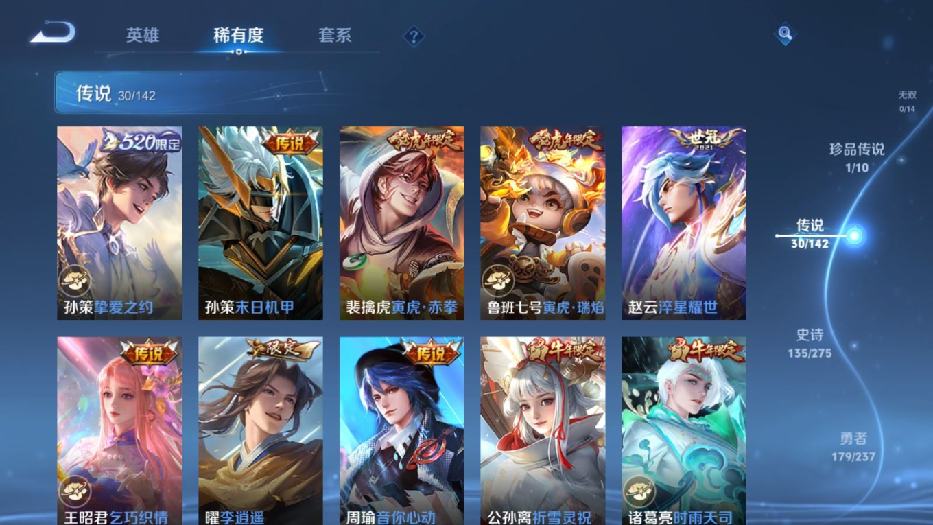 传说品质_后羿_黄金射手座传说品质_后羿_神树通天传说品质_澜_逐花归海传说品质_澜_愿照·九州拓传说品质_诸葛亮_时雨天司传说品质_干将莫邪_久胜战神传说品质_宫本武藏_地狱之眼传说品质_周瑜_音你心动传说品质_花木兰_冠军飞将传说品质_李信_山海·炽霜斩传说品质_孙尚香_末日机甲传说品质_桑启_鸣野蒿传说品质_女娲_愿照·千秋盛传说品质_马可波罗_深海之息传说品质_云缨_幻光神枪传说品质_李白_凤求凰传说品质_公孙离_祈雪灵祝传说品质_曜_云鹰飞将传说品质_曜_李逍遥 传说品质_孙策_末日机甲传说品质_孙策_挚爱之约传说品质_孙策_乘龙·淬吴钩传说品质_狄仁杰_超时空战士传说品质_狄仁杰_神骥·赴朔漠传说品质_鲁班七号_寅虎·瑞焰传说品质_虞姬_云霓雀翎传说品质_虞姬_启明星使传说品质_赵云_淬星耀世传说品质_裴擒虎_寅虎·赤拳传说品质_王昭君_乞巧织情