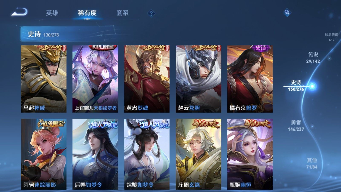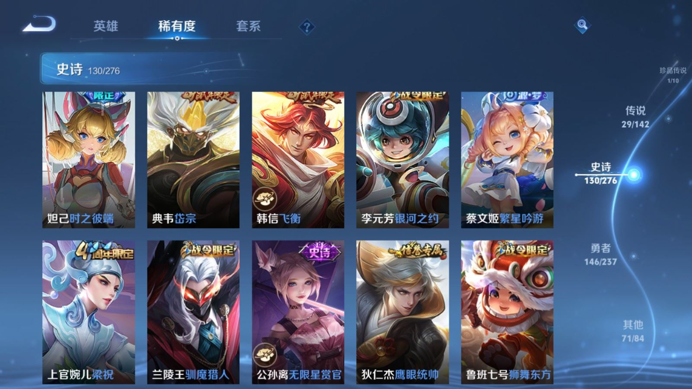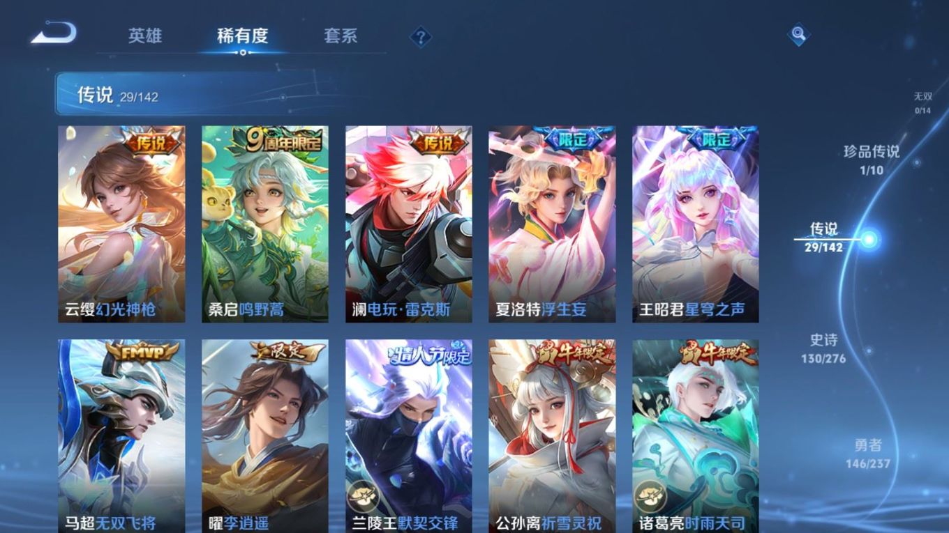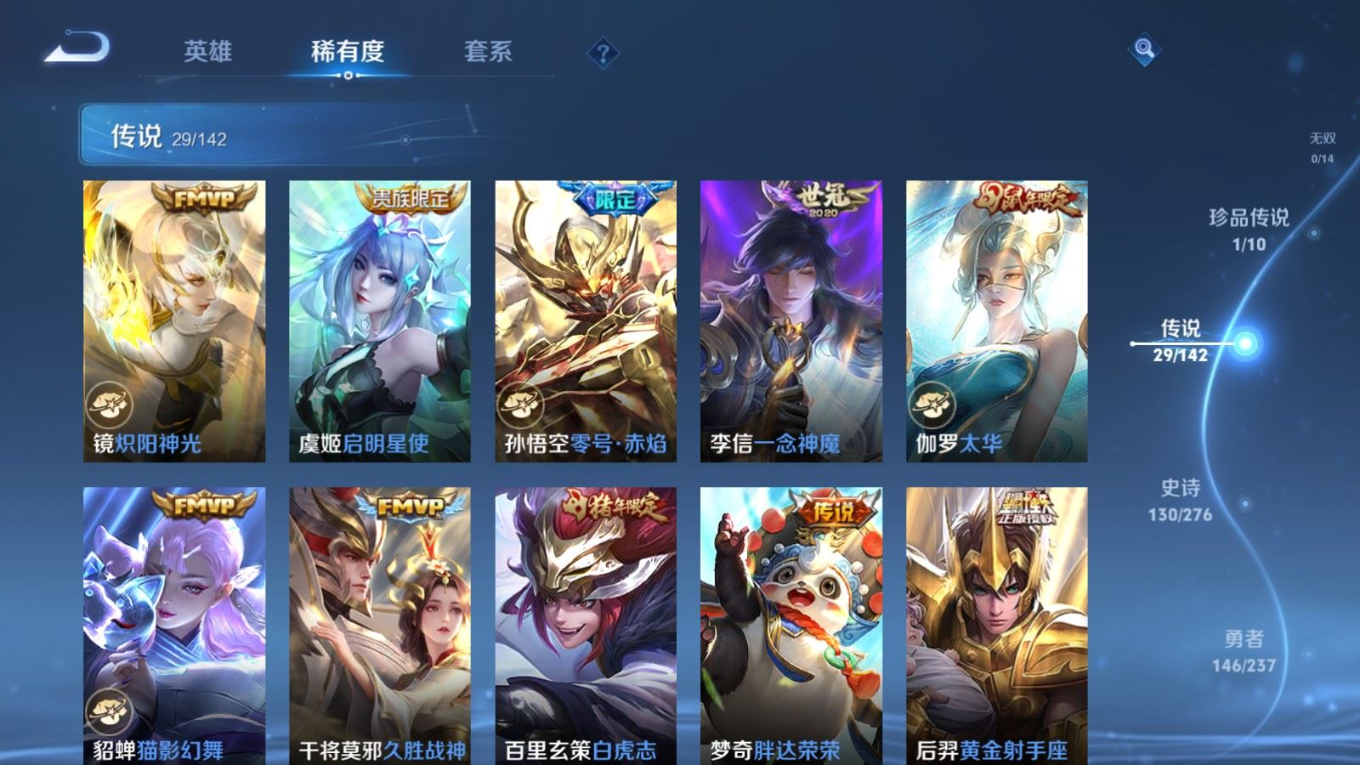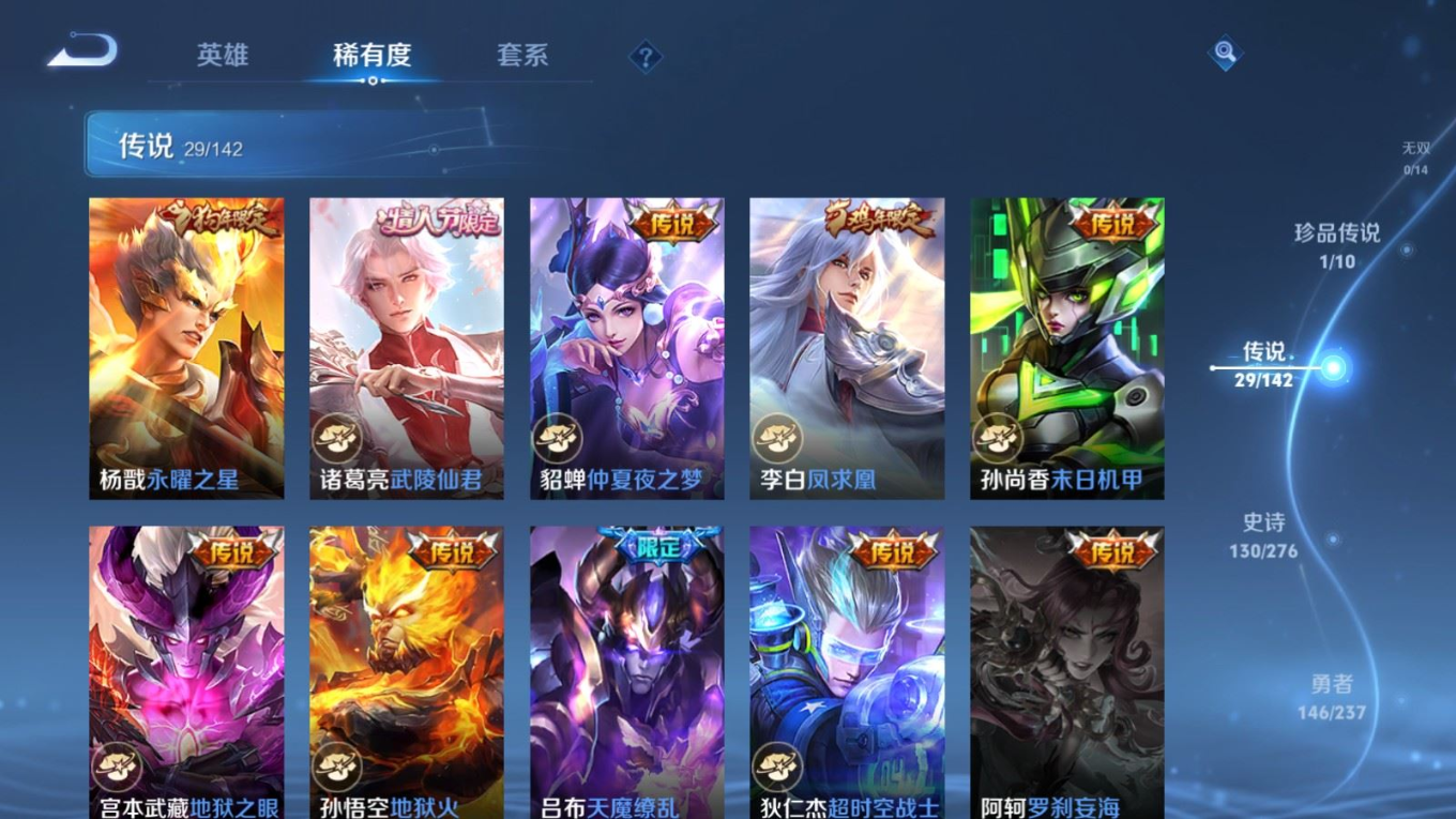 传说品质_后羿_黄金射手座传说品质_澜_电玩·雷克斯传说品质_诸葛亮_武陵仙君传说品质_诸葛亮_时雨天司传说品质_兰陵王_默契交锋传说品质_孙悟空_零号·赤焰传说品质_孙悟空_地狱火传说品质_吕布_天魔缭乱传说品质_马超_无双飞将传说品质_杨戬_永曜之星传说品质_干将莫邪_久胜战神传说品质_宫本武藏_地狱之眼传说品质_镜_炽阳神光传说品质_貂蝉_猫影幻舞传说品质_貂蝉_仲夏夜之梦传说品质_李信_一念神魔传说品质_孙尚香_末日机甲传说品质_梦奇_胖达荣荣传说品质_桑启_鸣野蒿传说品质_王昭君_星穹之声传说品质_云缨_幻光神枪传说品质_李白_凤求凰传说品质_公孙离_祈雪灵祝传说品质_伽罗_太华传说品质_夏洛特_浮生妄传说品质_曜_李逍遥 传说品质_狄仁杰_超时空战士传说品质_虞姬_启明星使传说品质_百里玄策_白虎志