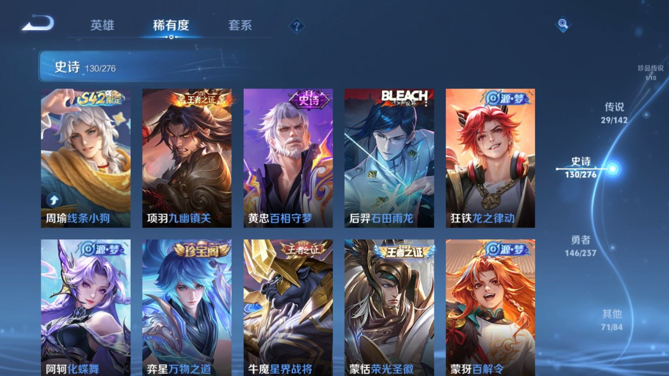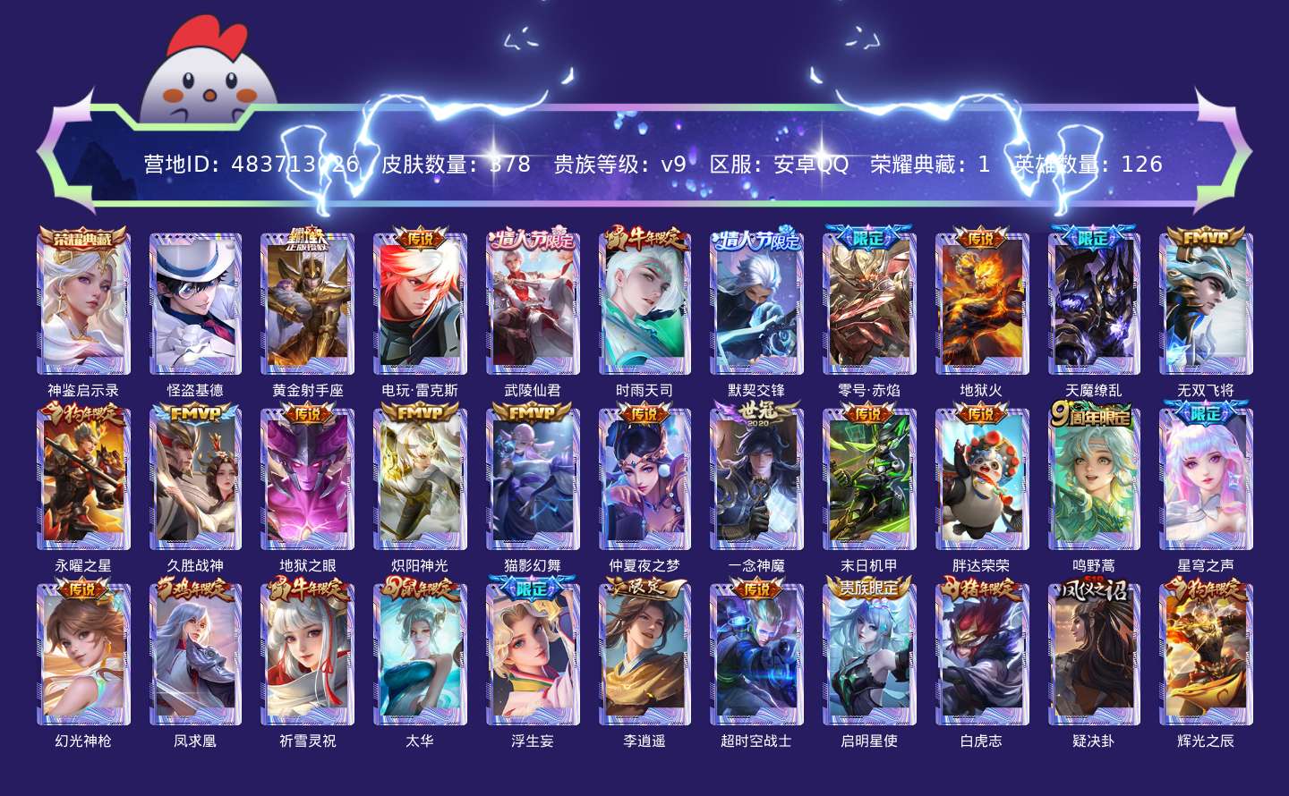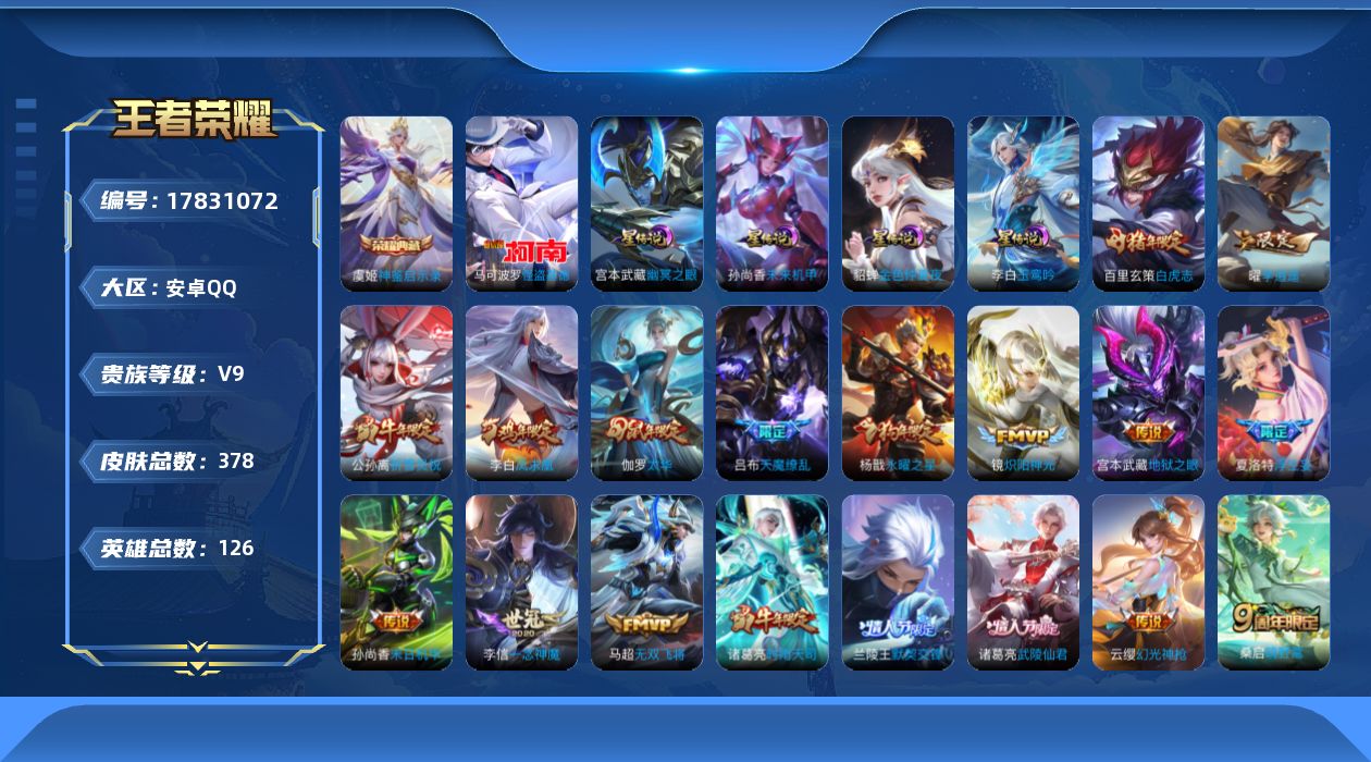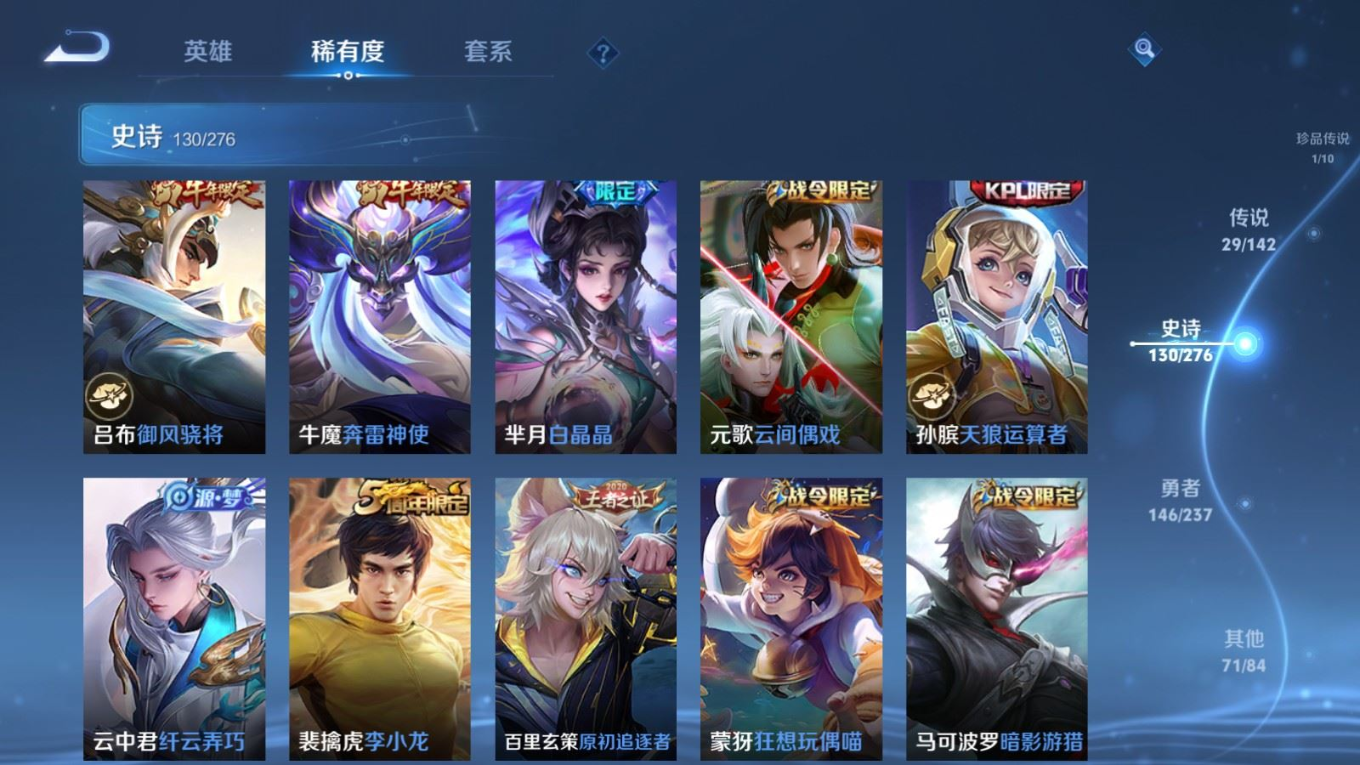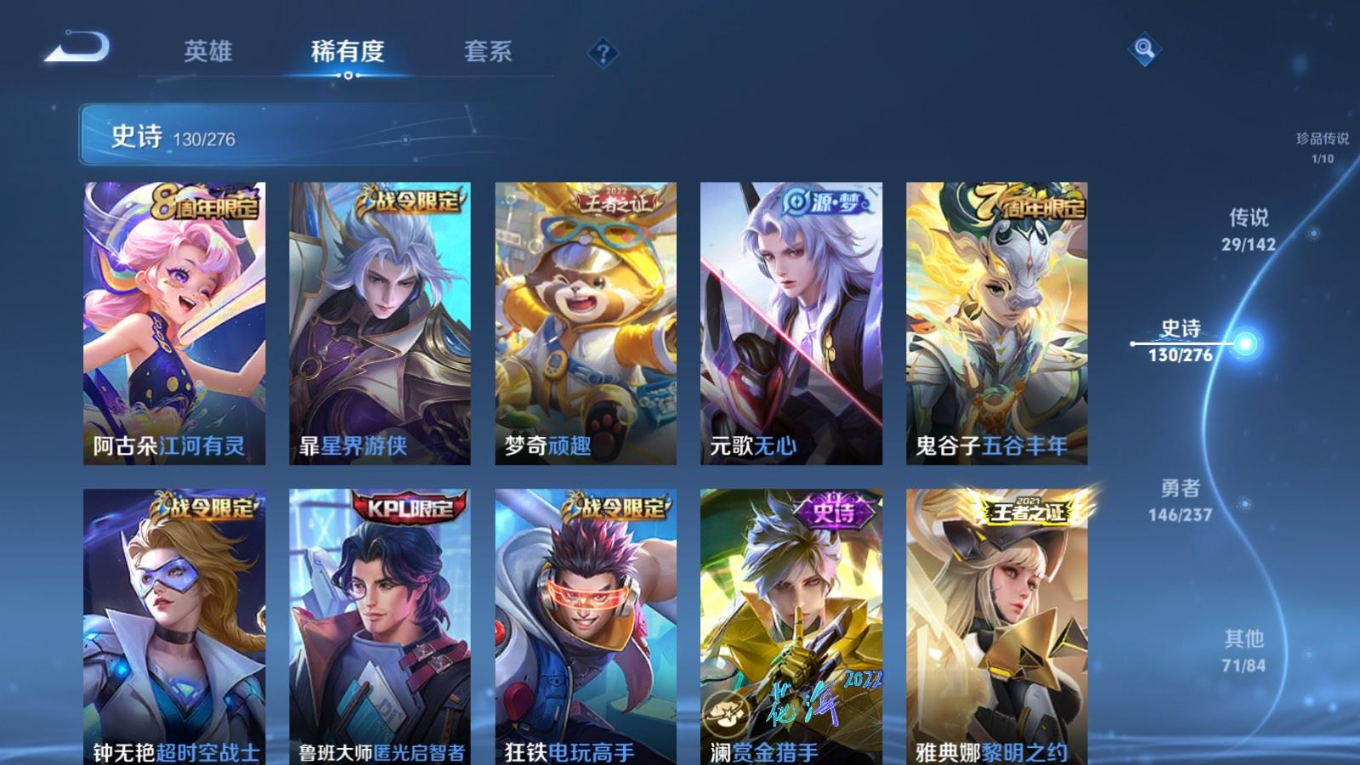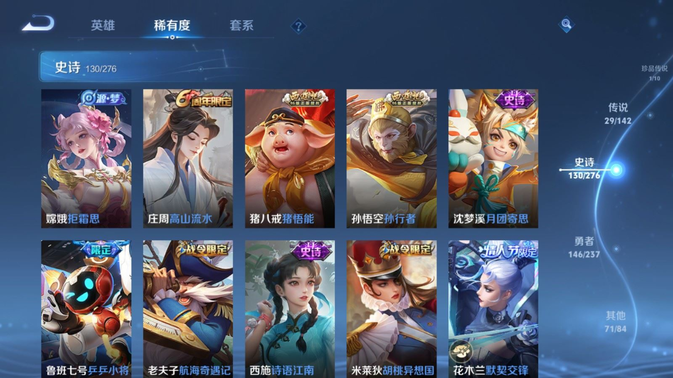 传说品质_后羿_黄金射手座传说品质_澜_电玩·雷克斯传说品质_诸葛亮_武陵仙君传说品质_诸葛亮_时雨天司传说品质_兰陵王_默契交锋传说品质_孙悟空_零号·赤焰传说品质_孙悟空_地狱火传说品质_吕布_天魔缭乱传说品质_马超_无双飞将传说品质_杨戬_永曜之星传说品质_干将莫邪_久胜战神传说品质_宫本武藏_地狱之眼传说品质_镜_炽阳神光传说品质_貂蝉_猫影幻舞传说品质_貂蝉_仲夏夜之梦传说品质_李信_一念神魔传说品质_孙尚香_末日机甲传说品质_梦奇_胖达荣荣传说品质_桑启_鸣野蒿传说品质_王昭君_星穹之声传说品质_云缨_幻光神枪传说品质_李白_凤求凰传说品质_公孙离_祈雪灵祝传说品质_伽罗_太华传说品质_夏洛特_浮生妄传说品质_曜_李逍遥 传说品质_狄仁杰_超时空战士传说品质_虞姬_启明星使传说品质_百里玄策_白虎志