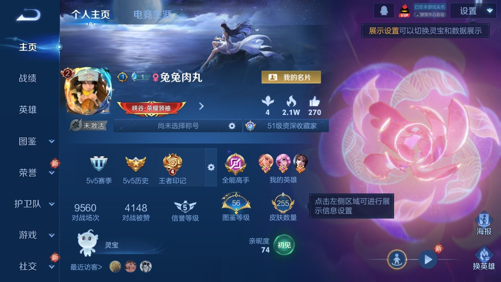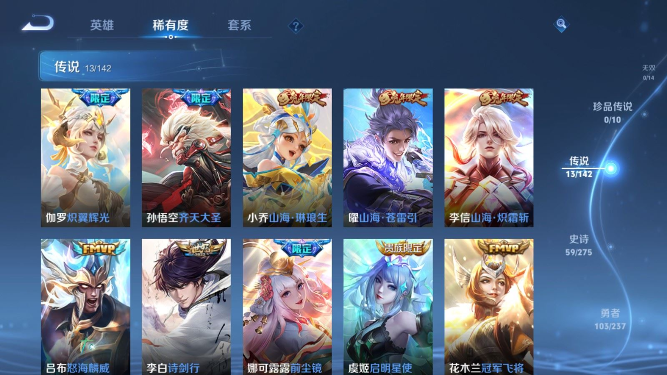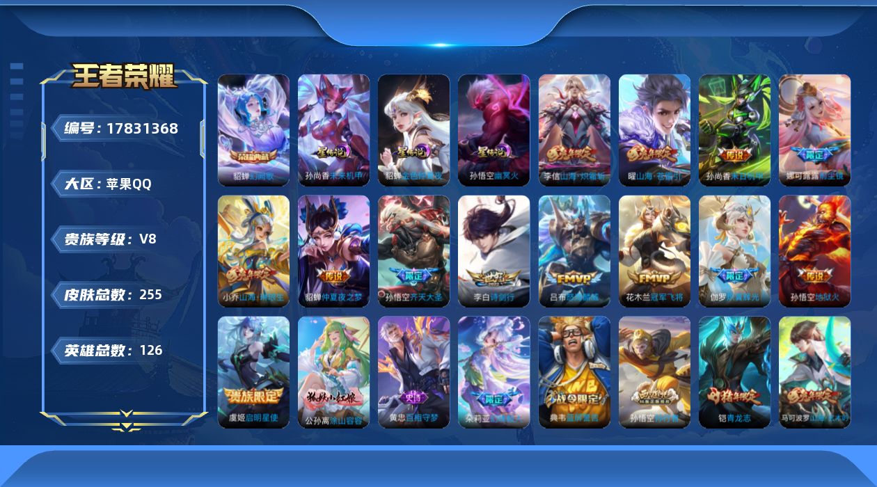 贵族等级:v8皮肤数:255传说品质13 生肖限定8 荣耀典藏1 英雄数:126