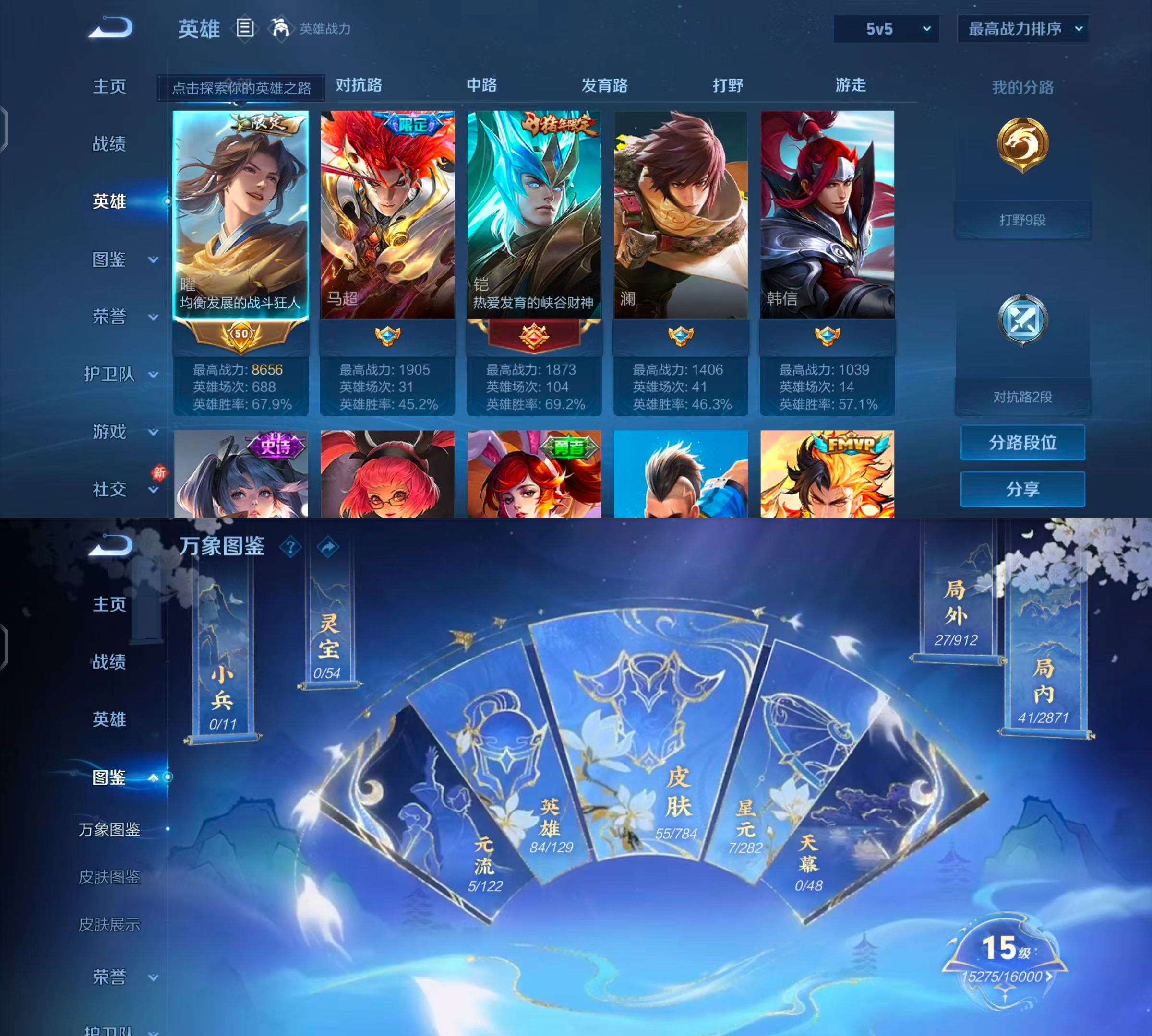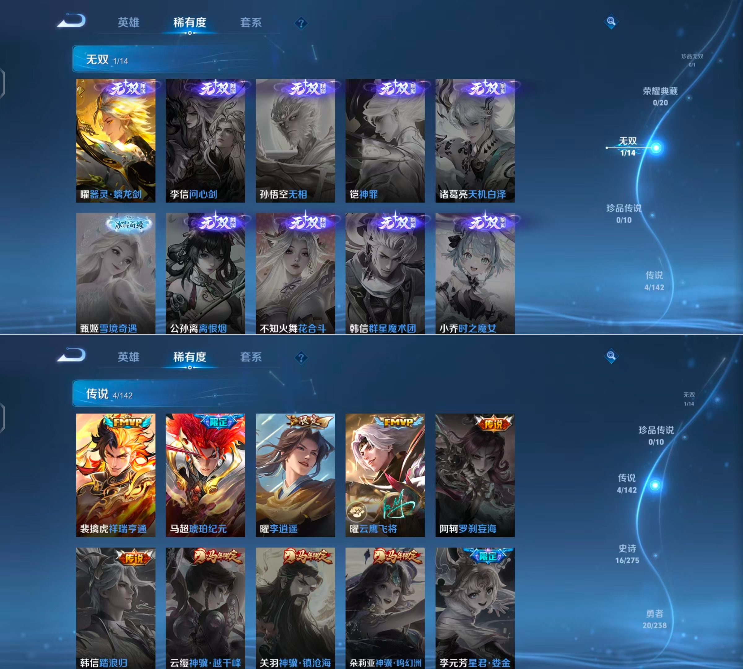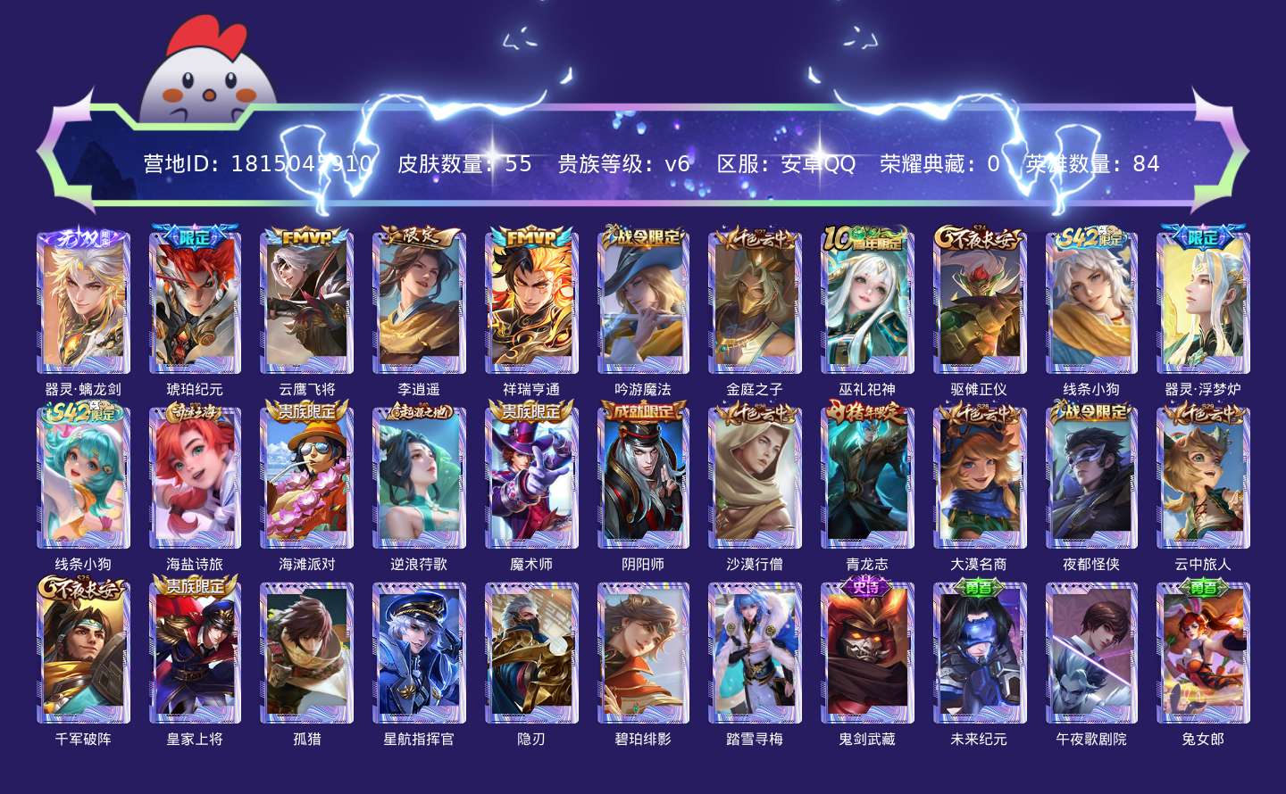 贵族等级:v6皮肤数:55传说品质4 无双1 生肖限定1 英雄数:84