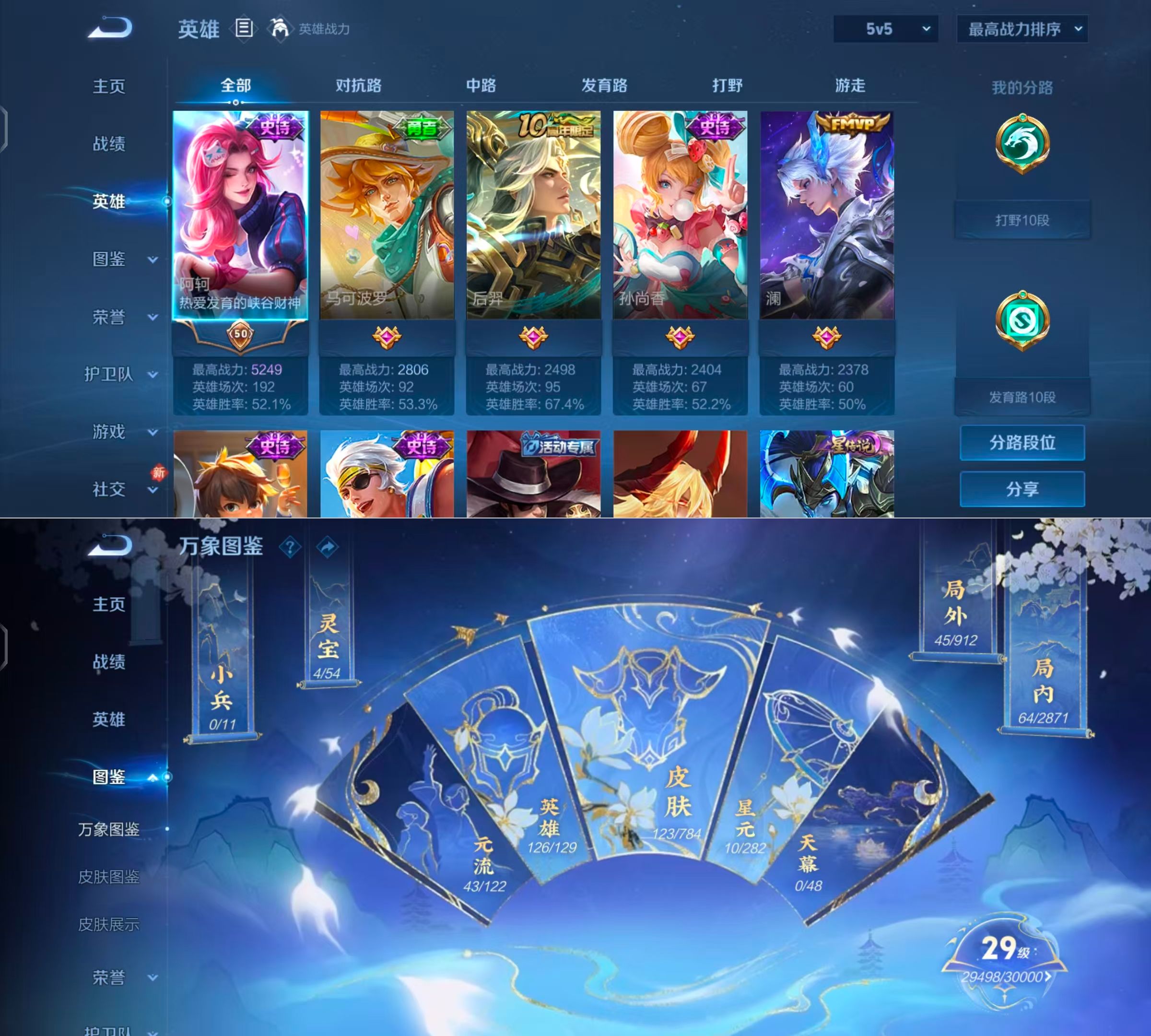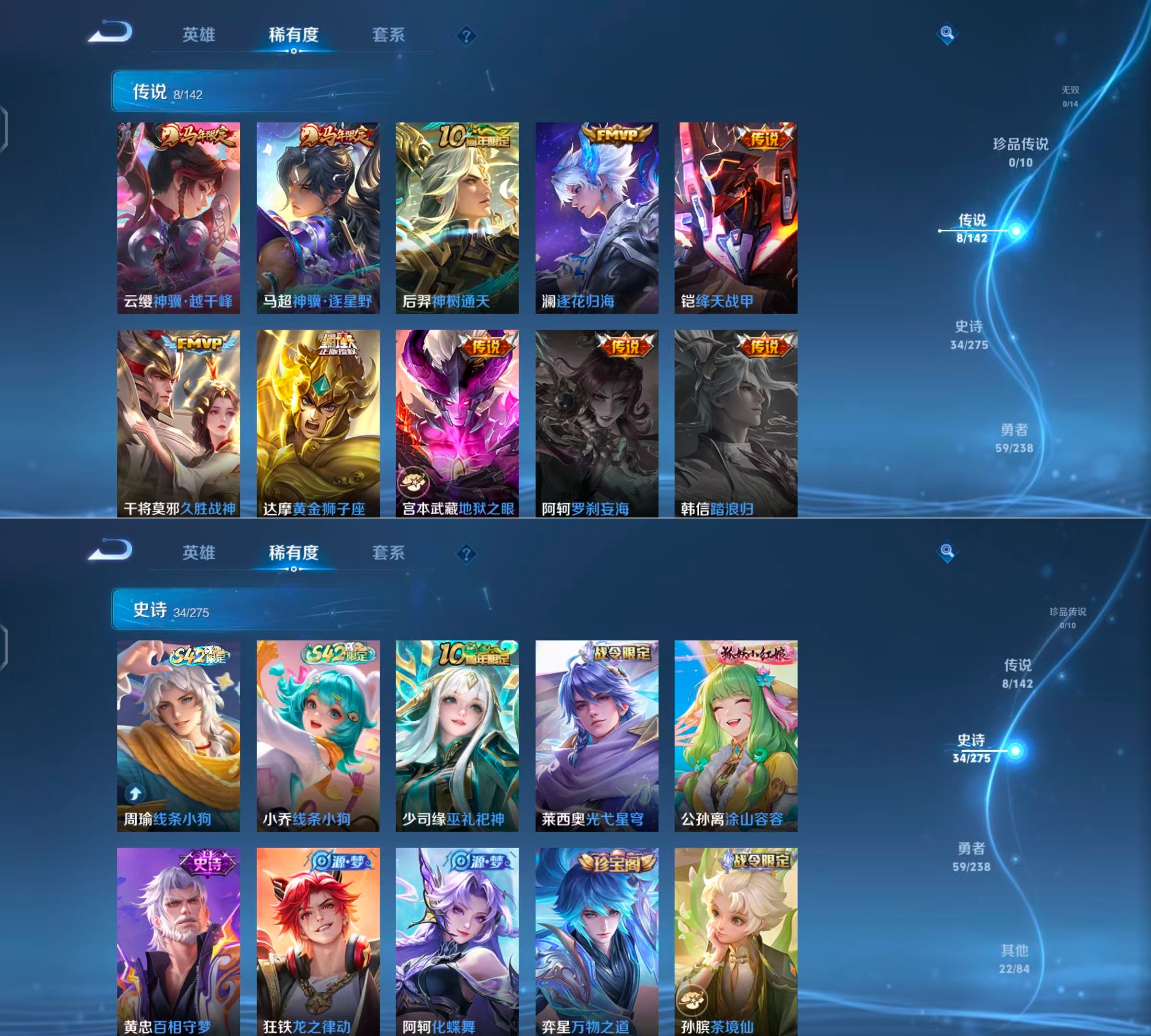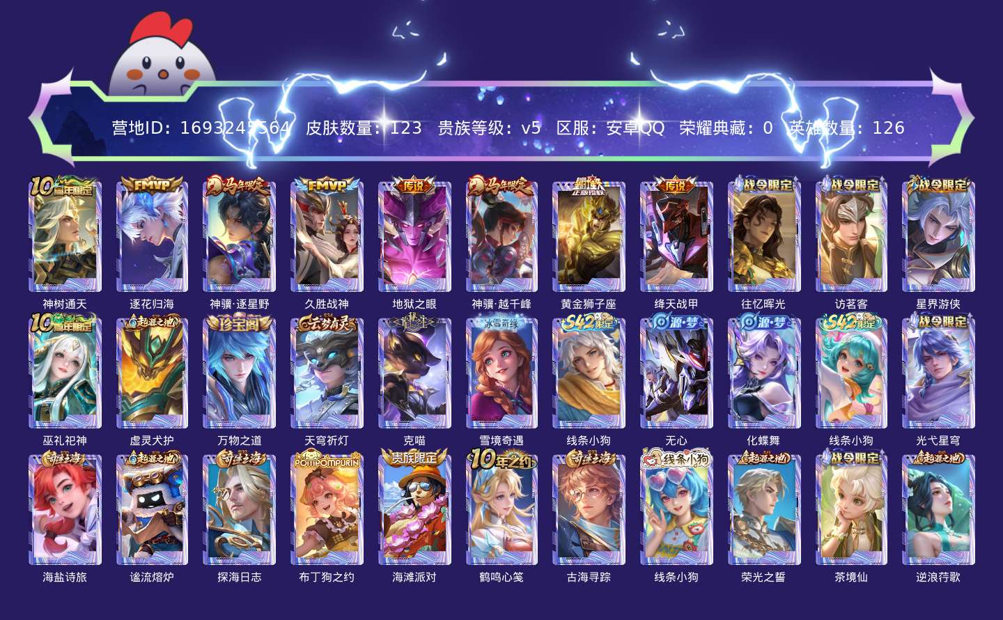 贵族等级:v5皮肤数:123传说品质8 生肖限定2 英雄数:126
