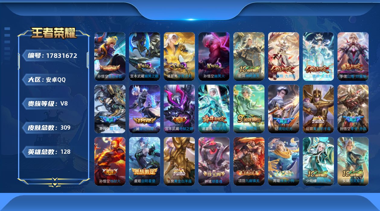 贵族等级:v8皮肤数:309传说品质15 生肖限定5 情人节限定2 荣耀典藏1 英雄数:128
