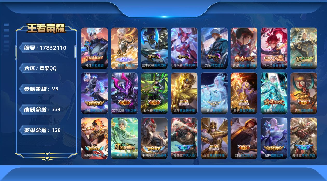 贵族等级:v8皮肤数:334传说品质23 情人节限定5 生肖限定5 无双1 荣耀典藏1 英雄数:128