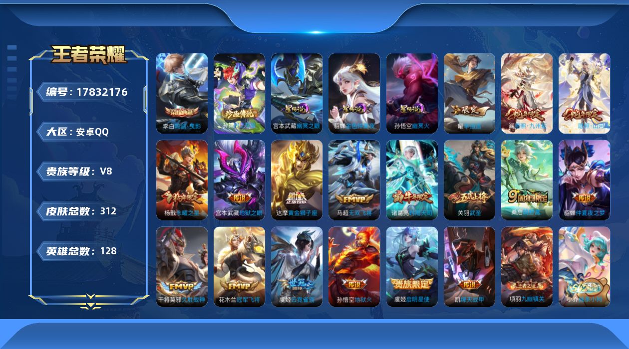 贵族等级:v8皮肤数:312传说品质17 生肖限定9 荣耀典藏1 珍品传说1 英雄数:128