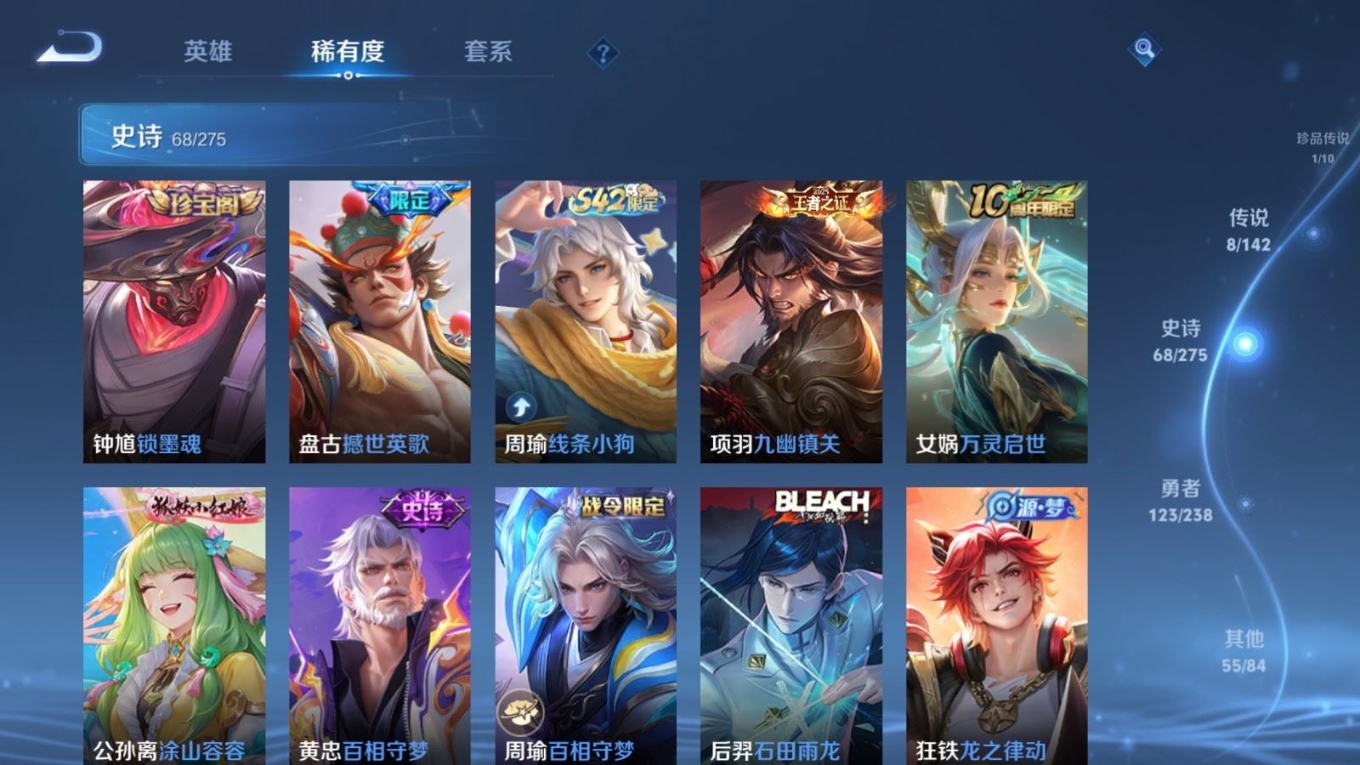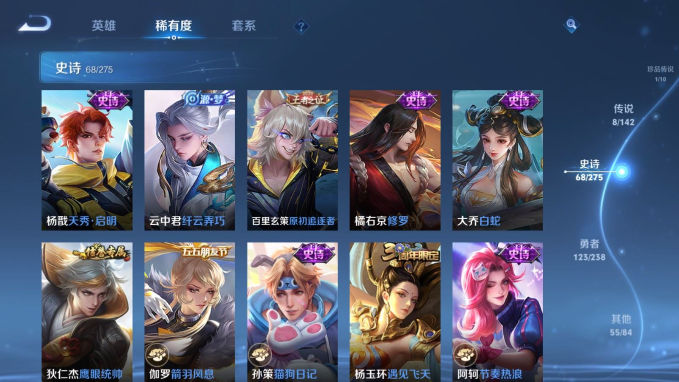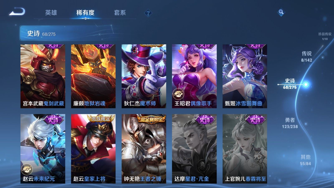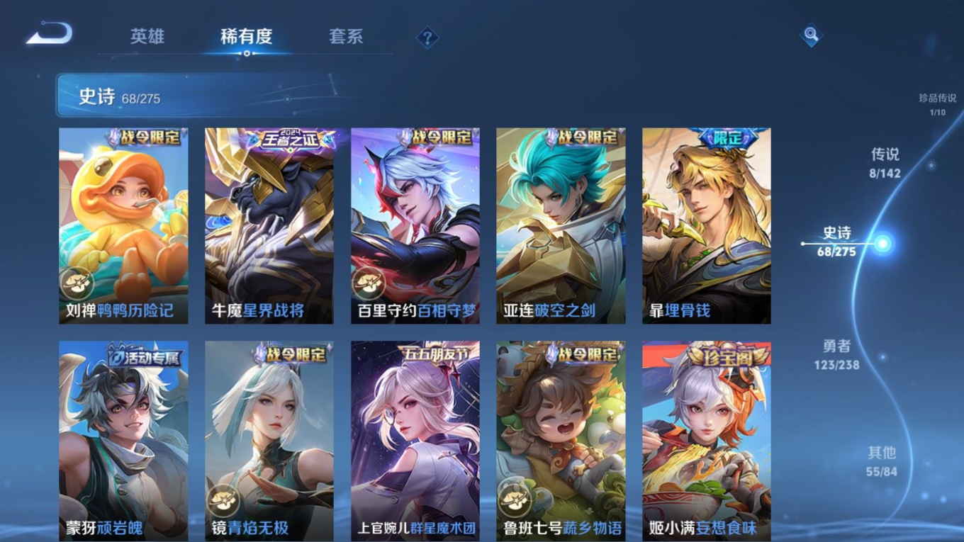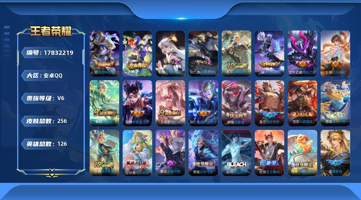 贵族等级:v6皮肤数:256传说品质8 珍品传说1 荣耀典藏1 英雄数:126