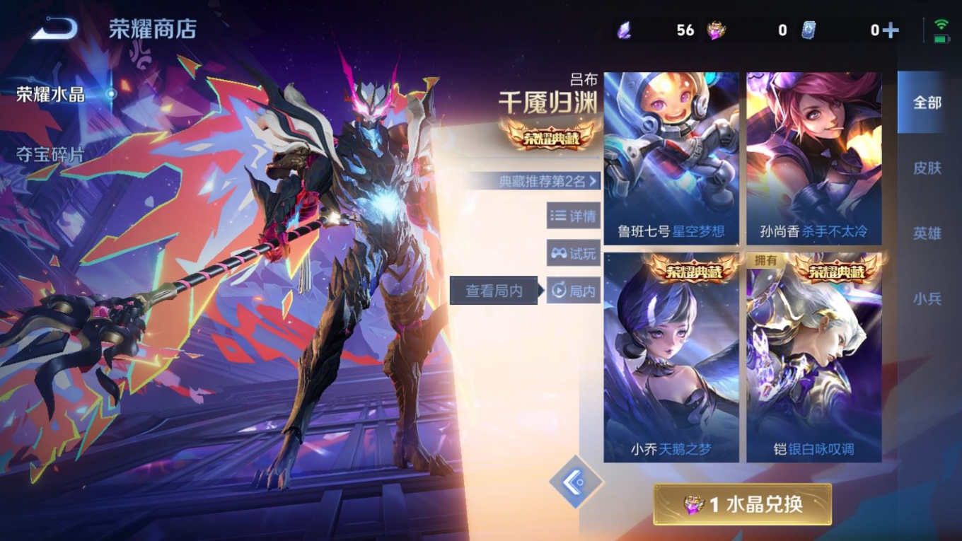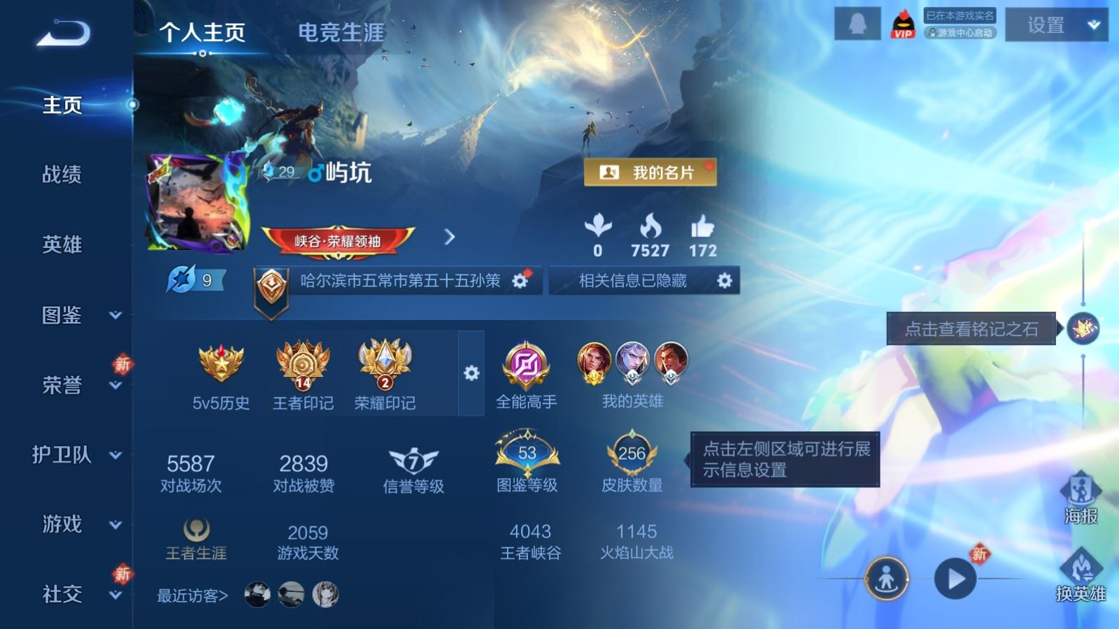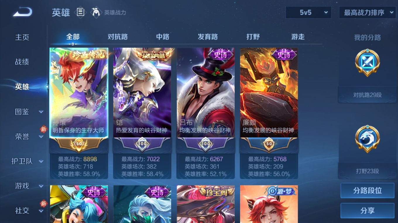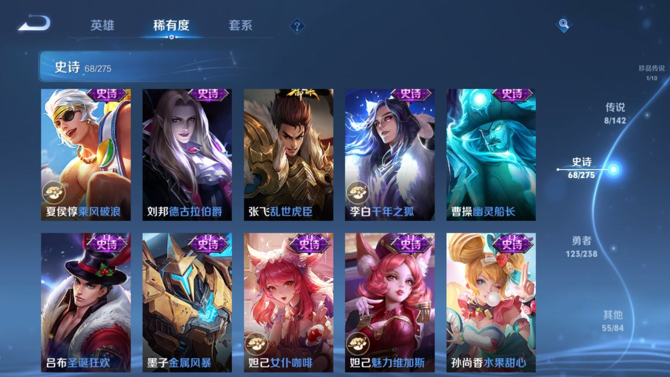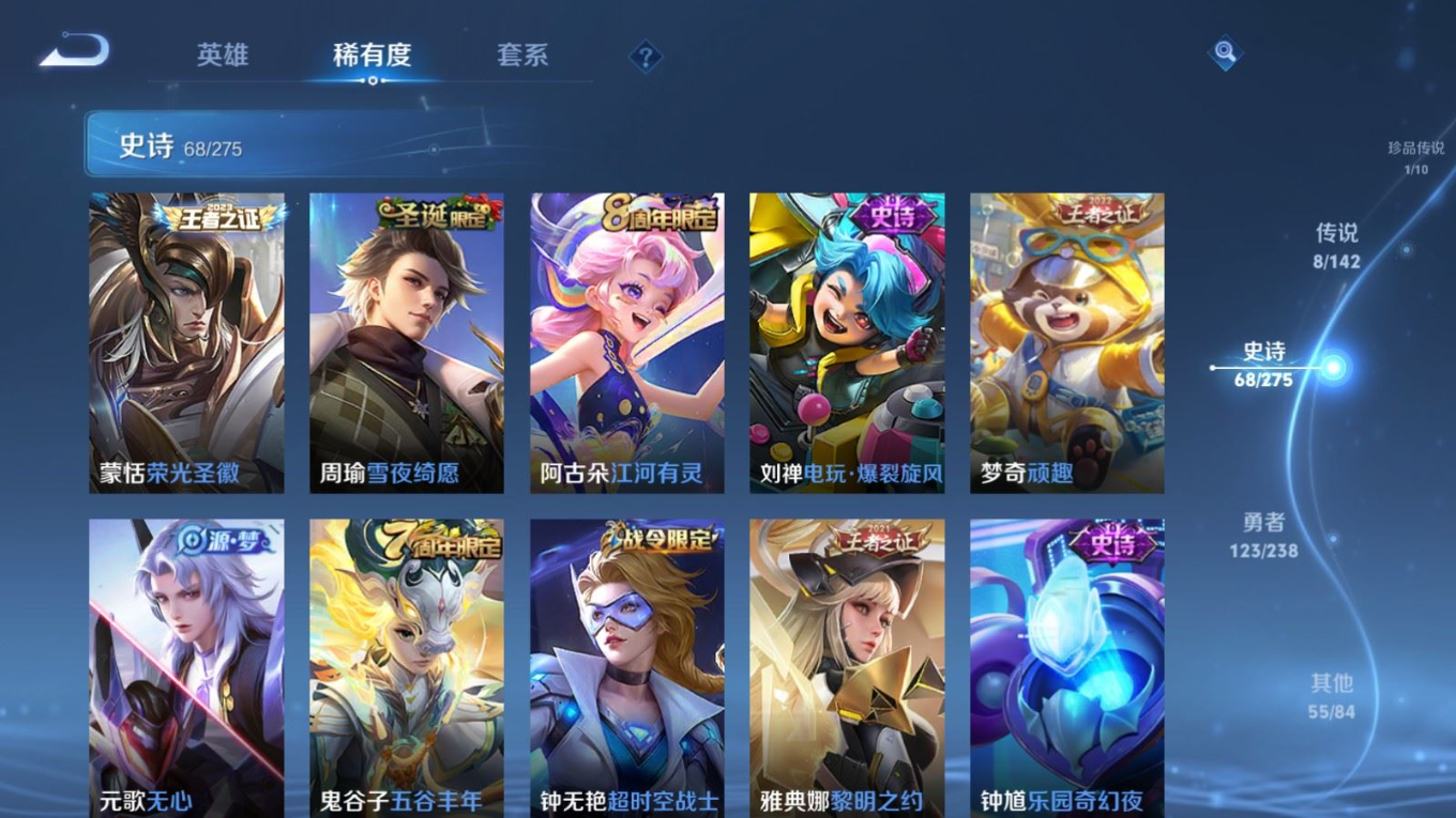 贵族等级:v6皮肤数:256传说品质8 珍品传说1 荣耀典藏1 英雄数:126