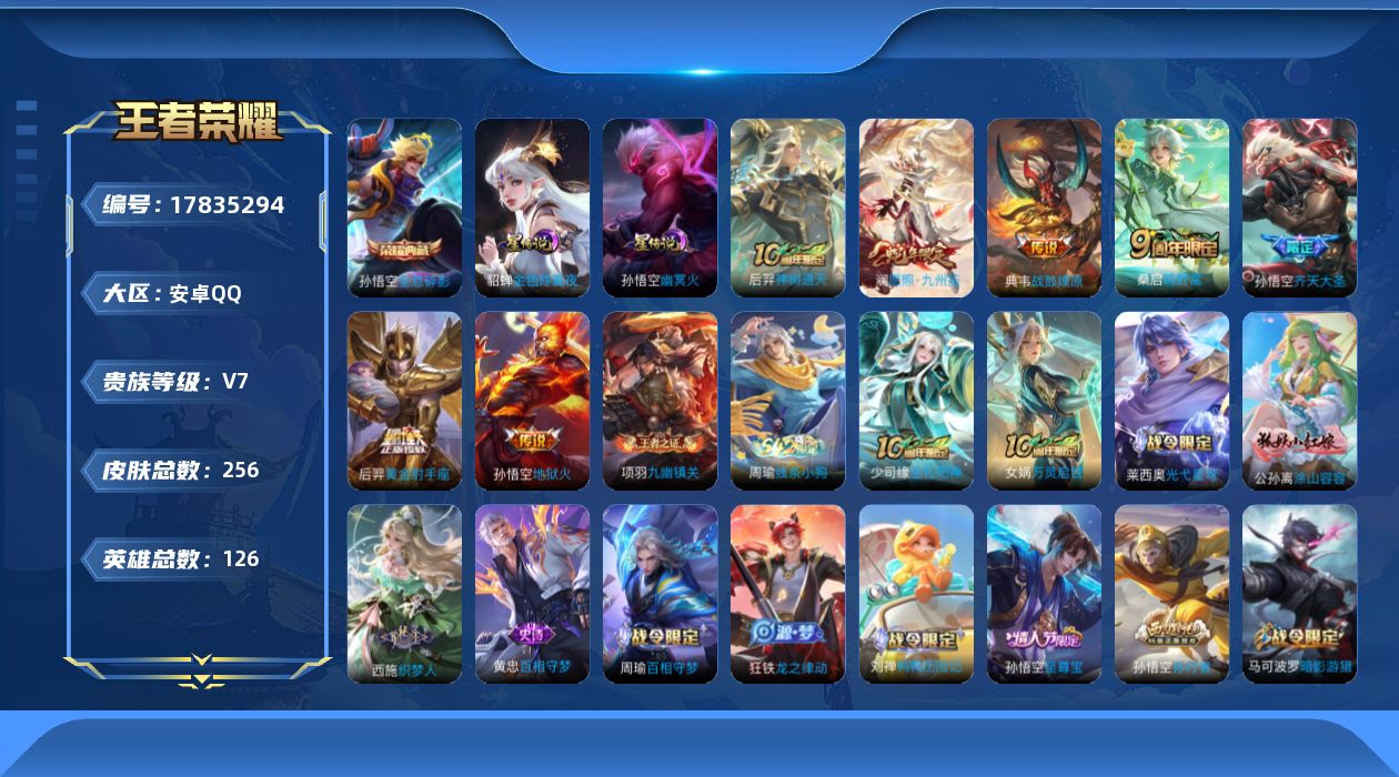 贵族等级:v7皮肤数:256传说品质7 生肖限定2 情人节限定1 荣耀典藏1 英雄数:126