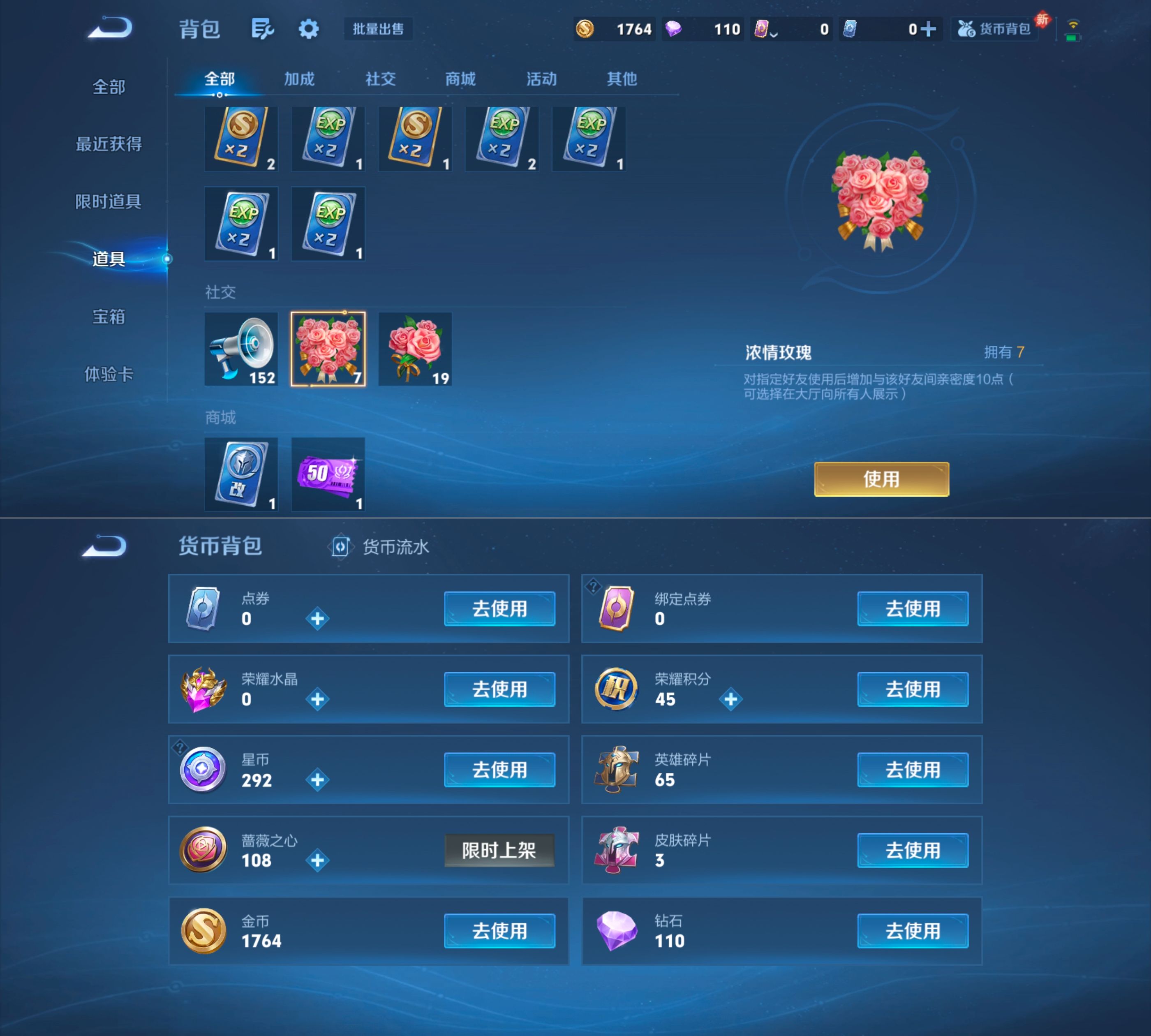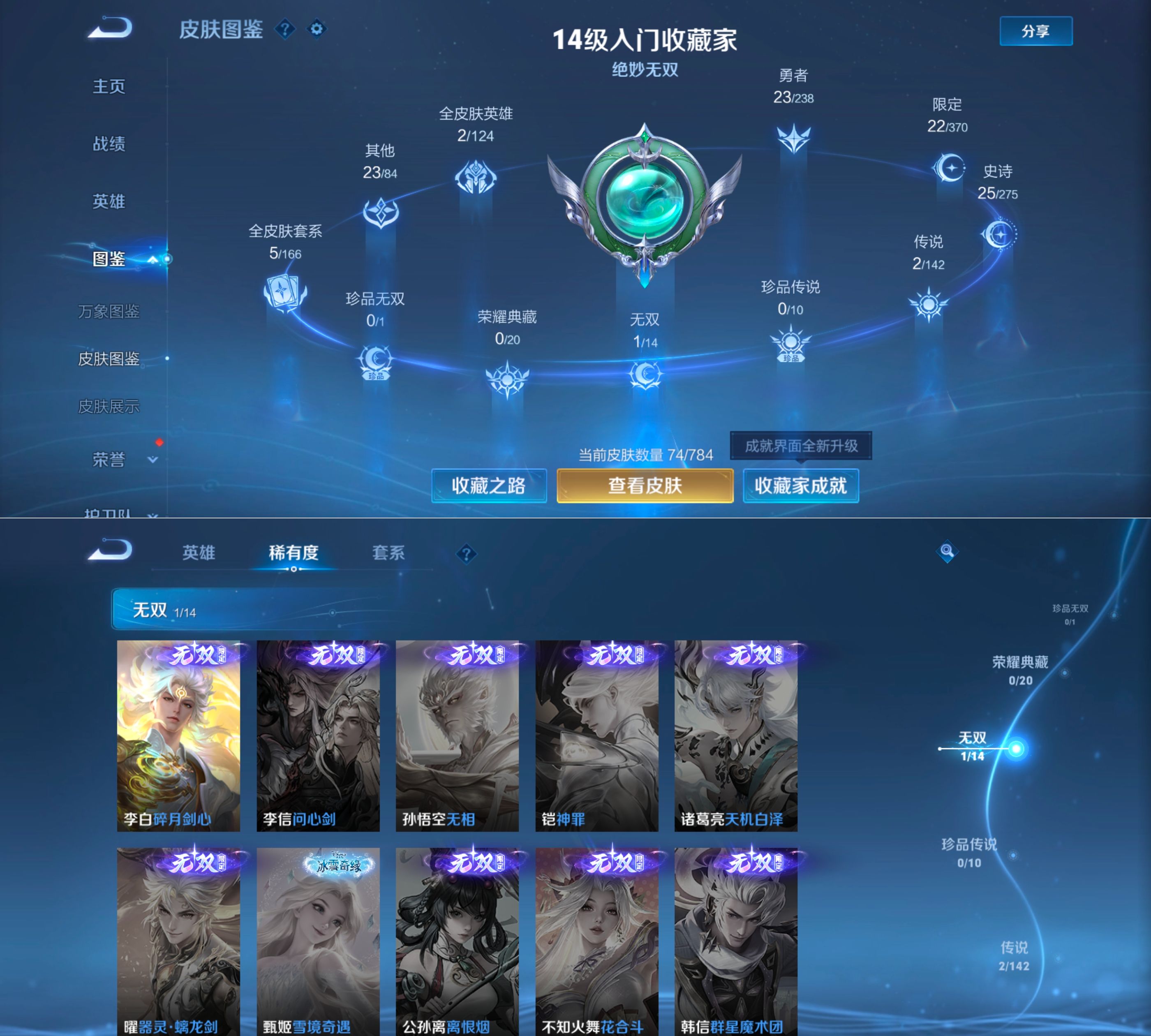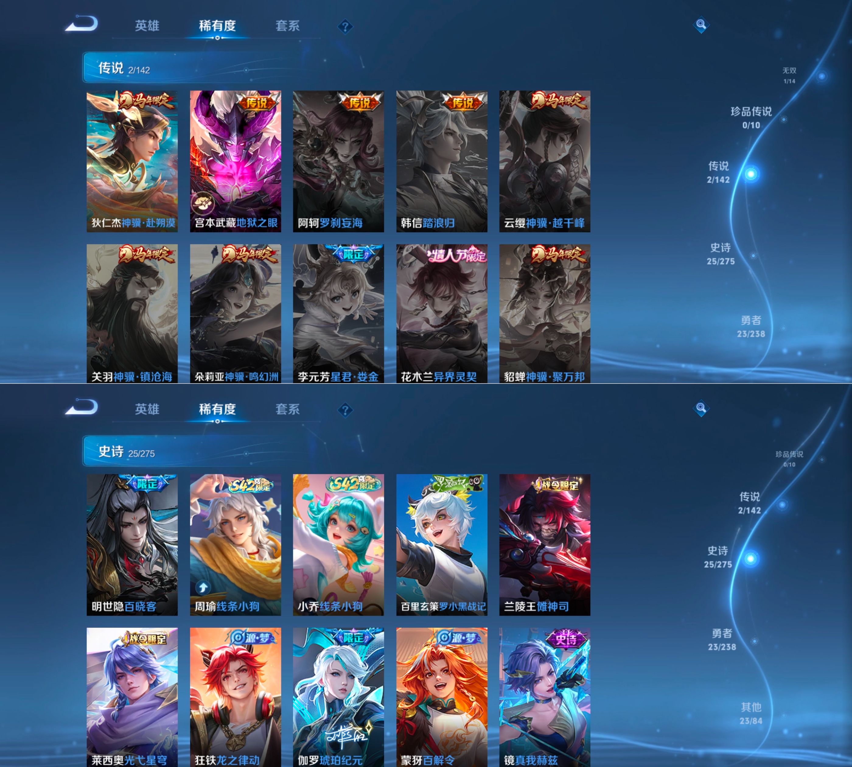 贵族等级:v6皮肤数:74生肖限定2 传说品质2 无双1 英雄数:66