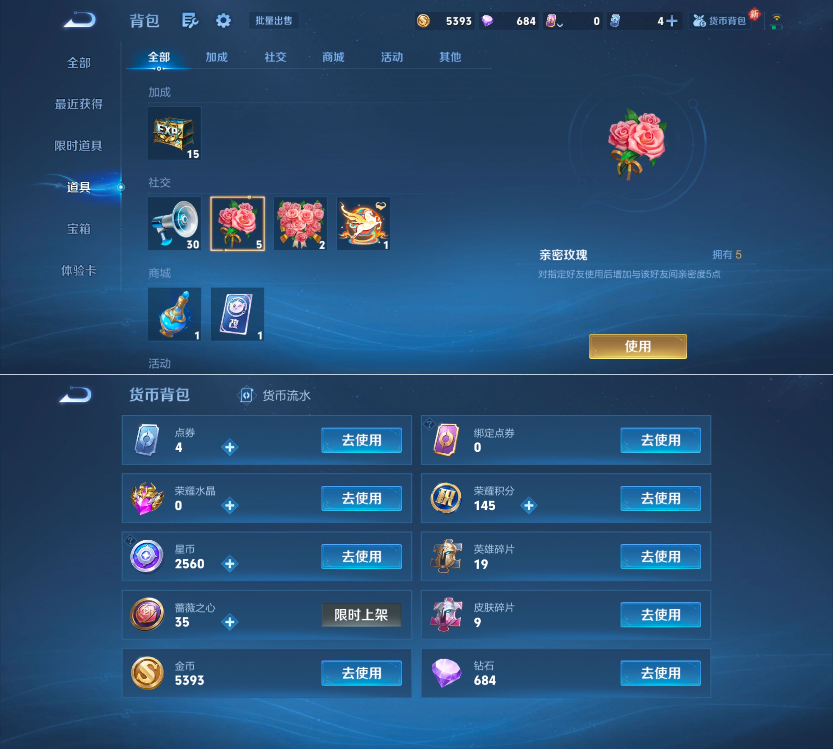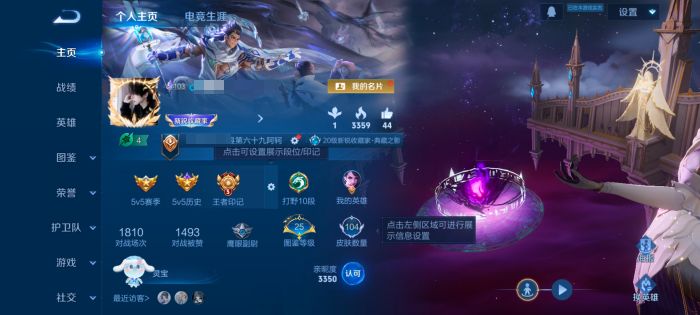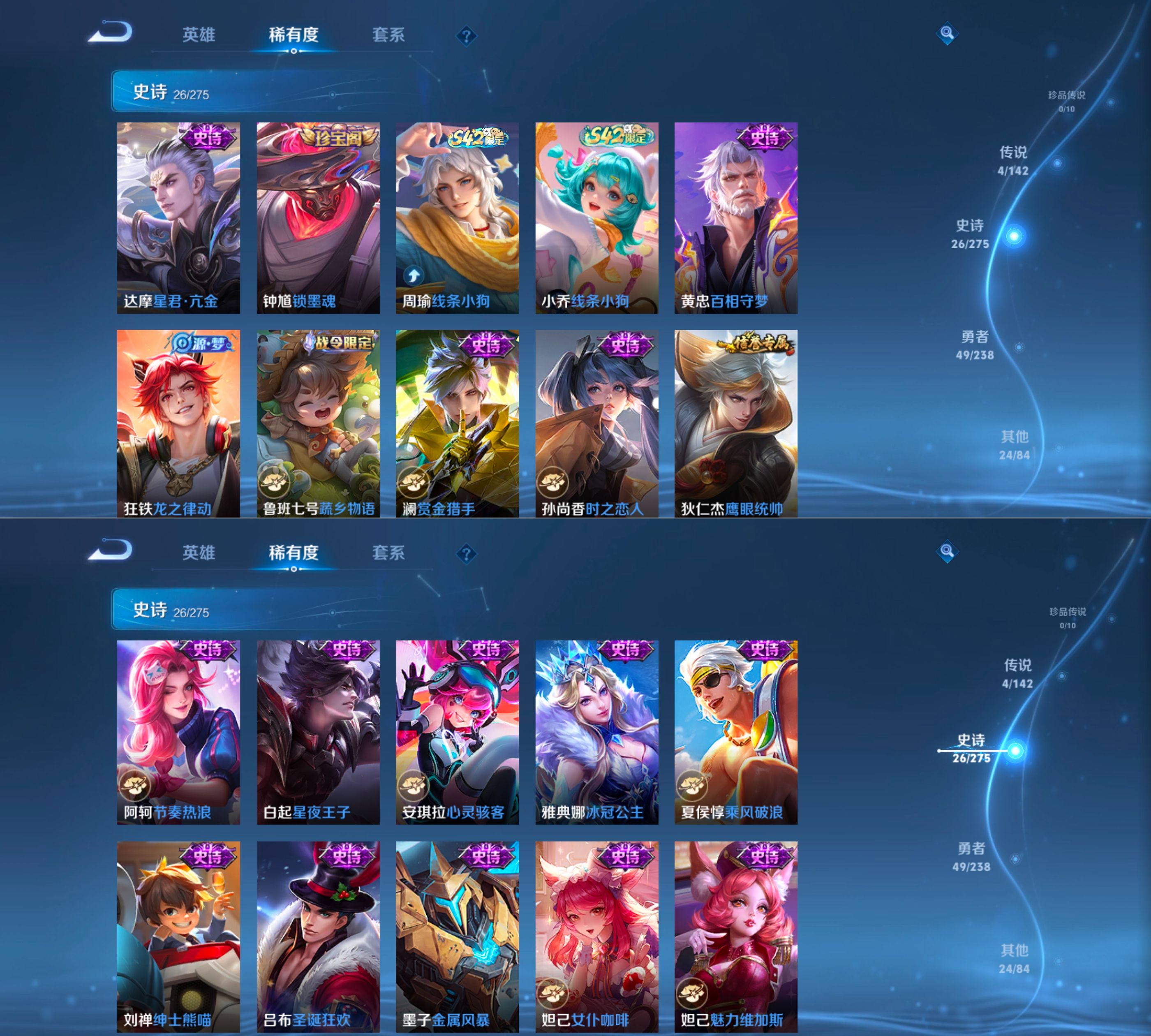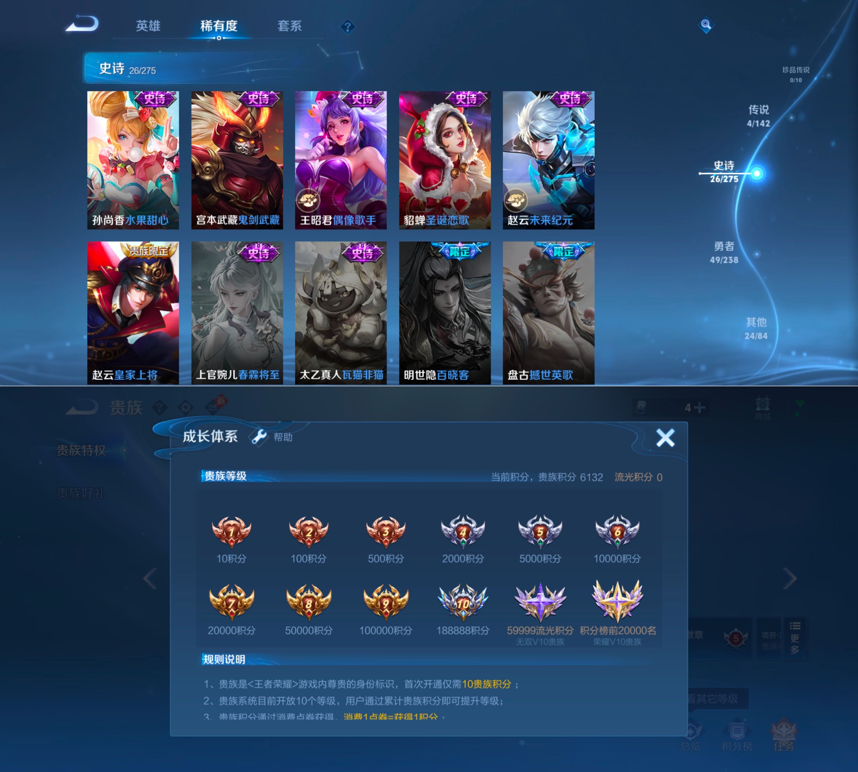 贵族等级:v5皮肤数:104传说品质4 生肖限定1 情人节限定1 荣耀典藏1 英雄数:106