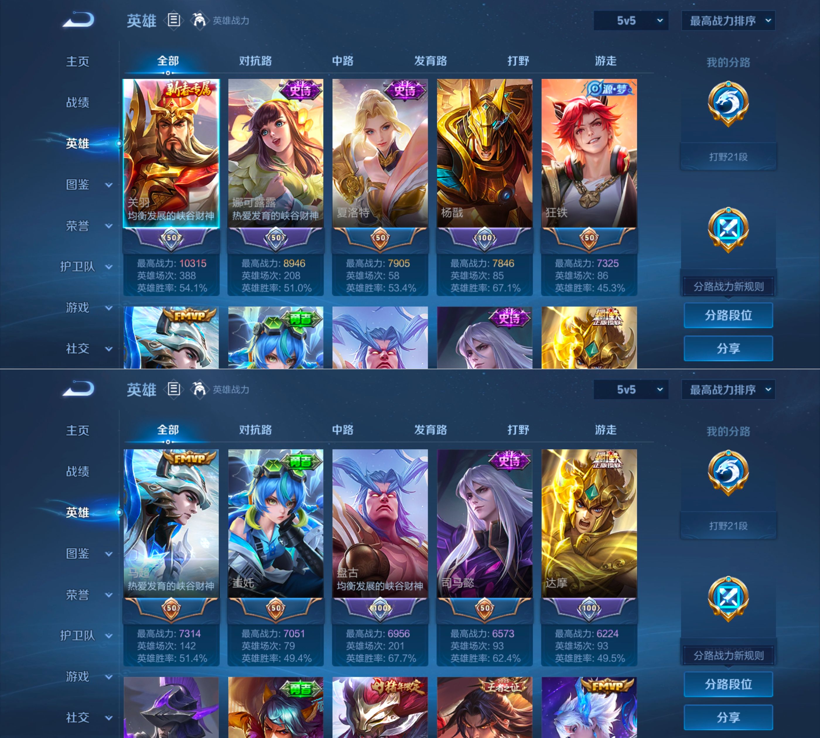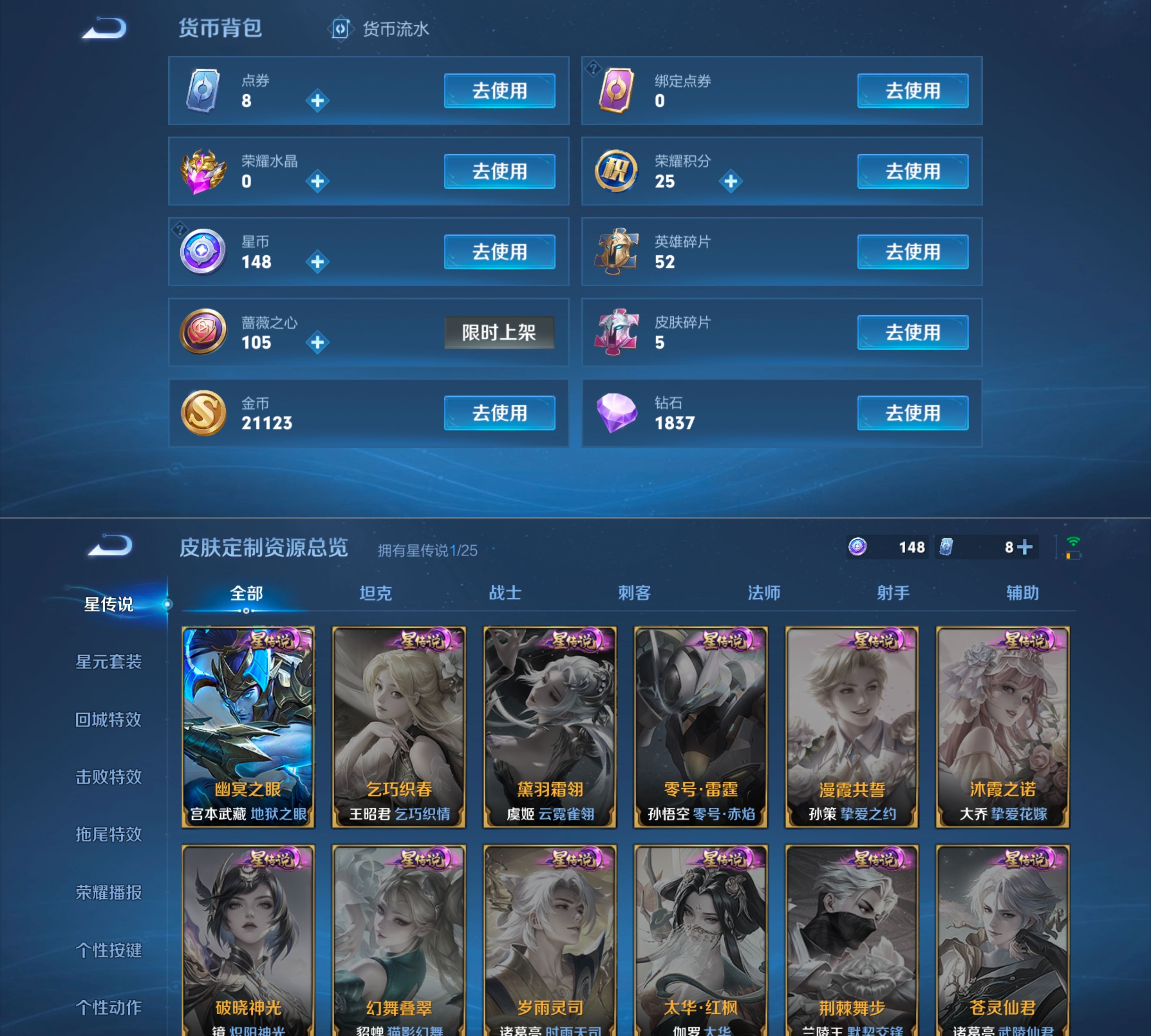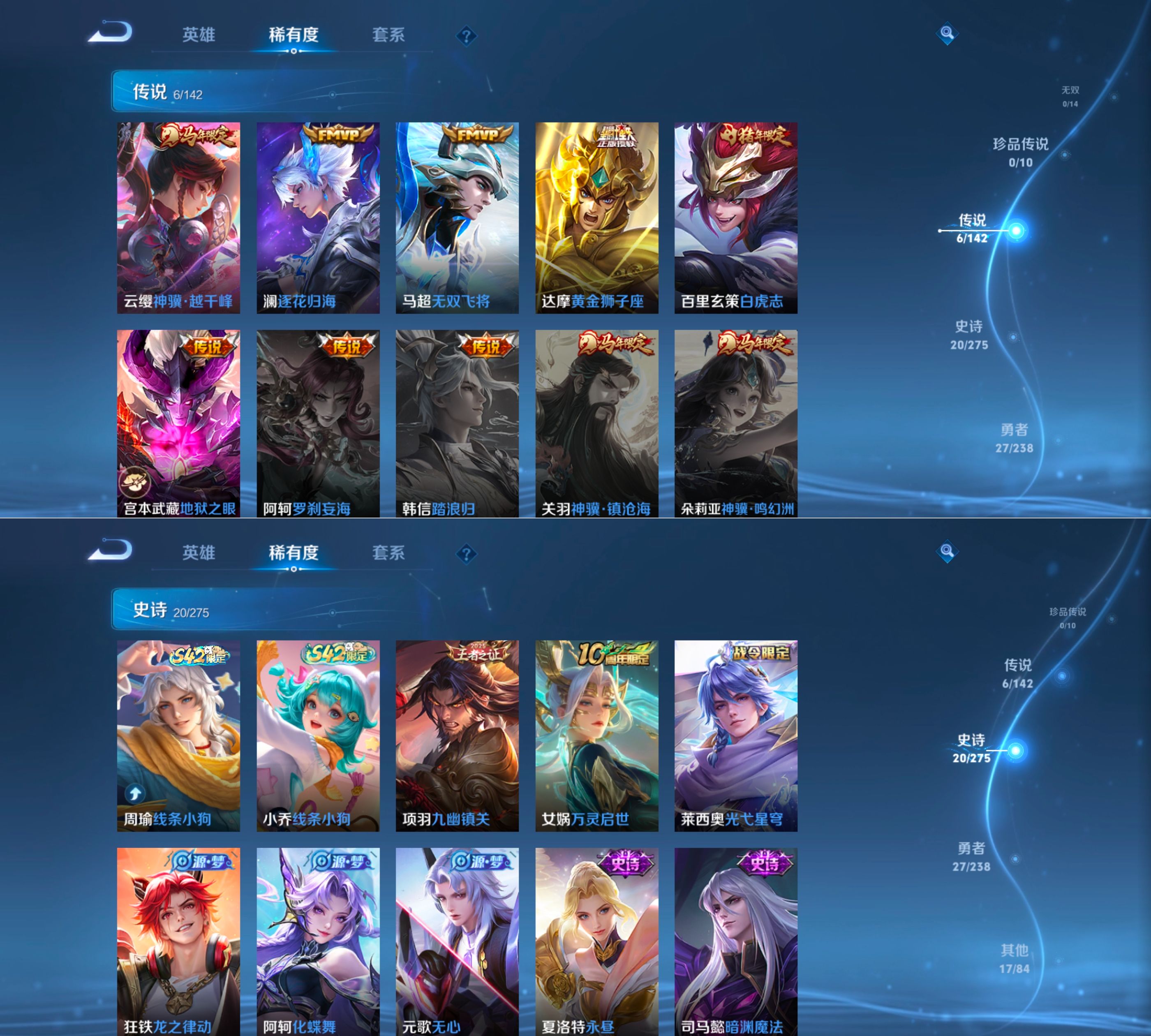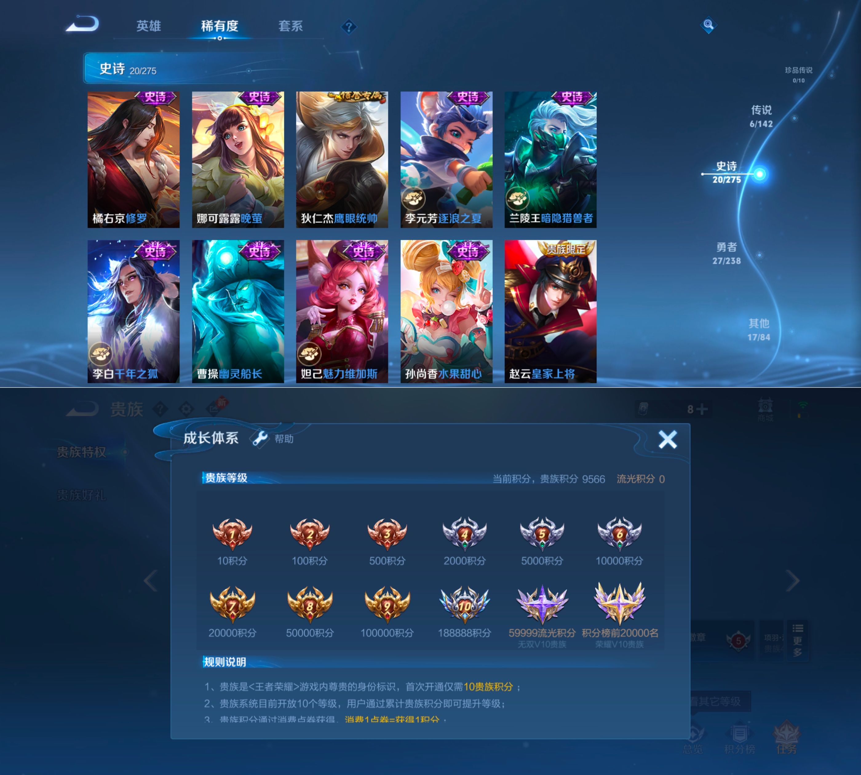 贵族等级:v5皮肤数:70传说品质6 生肖限定2 英雄数:87