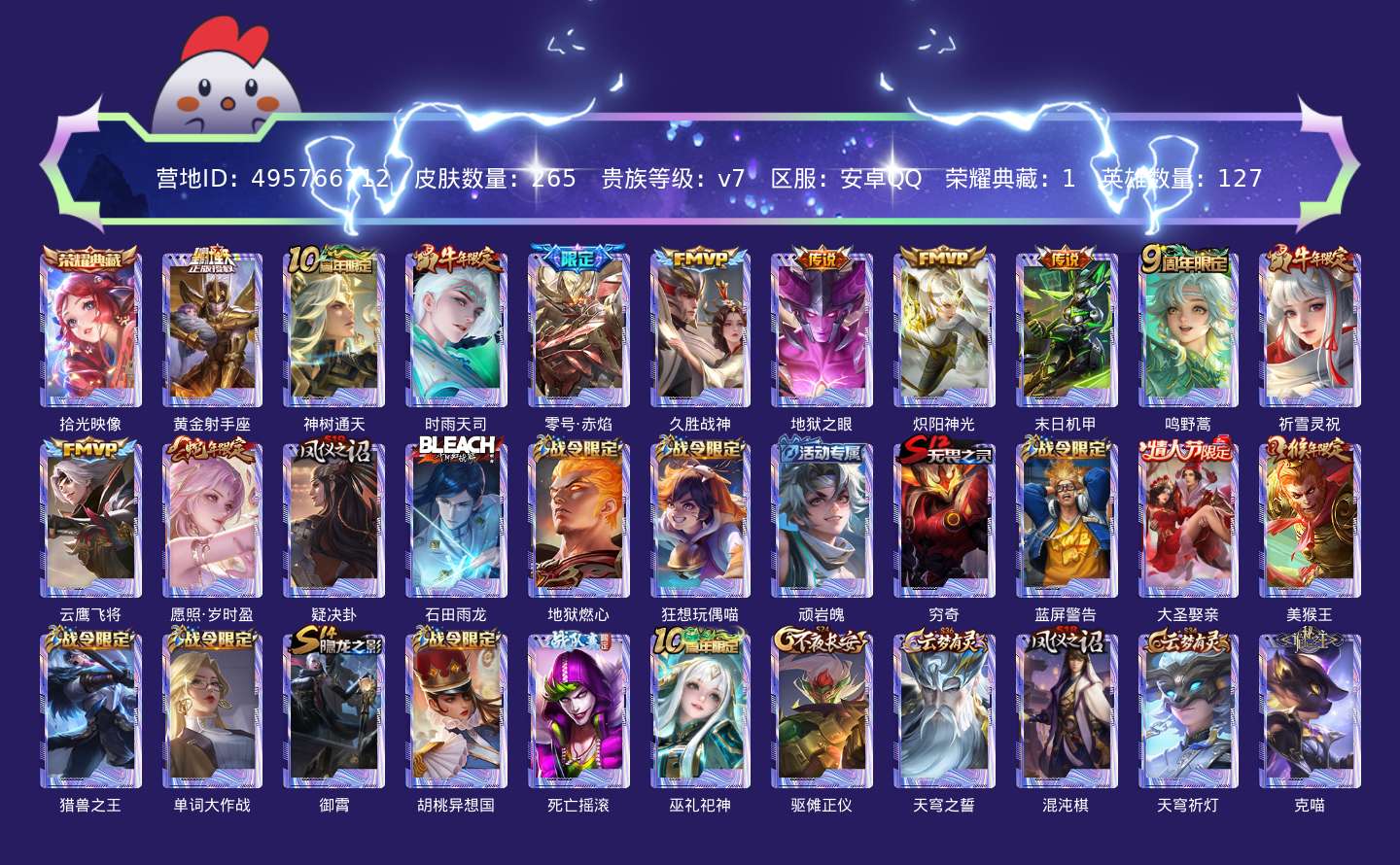 贵族等级:v7皮肤数:265传说品质12 生肖限定4 情人节限定1 荣耀典藏1 英雄数:127