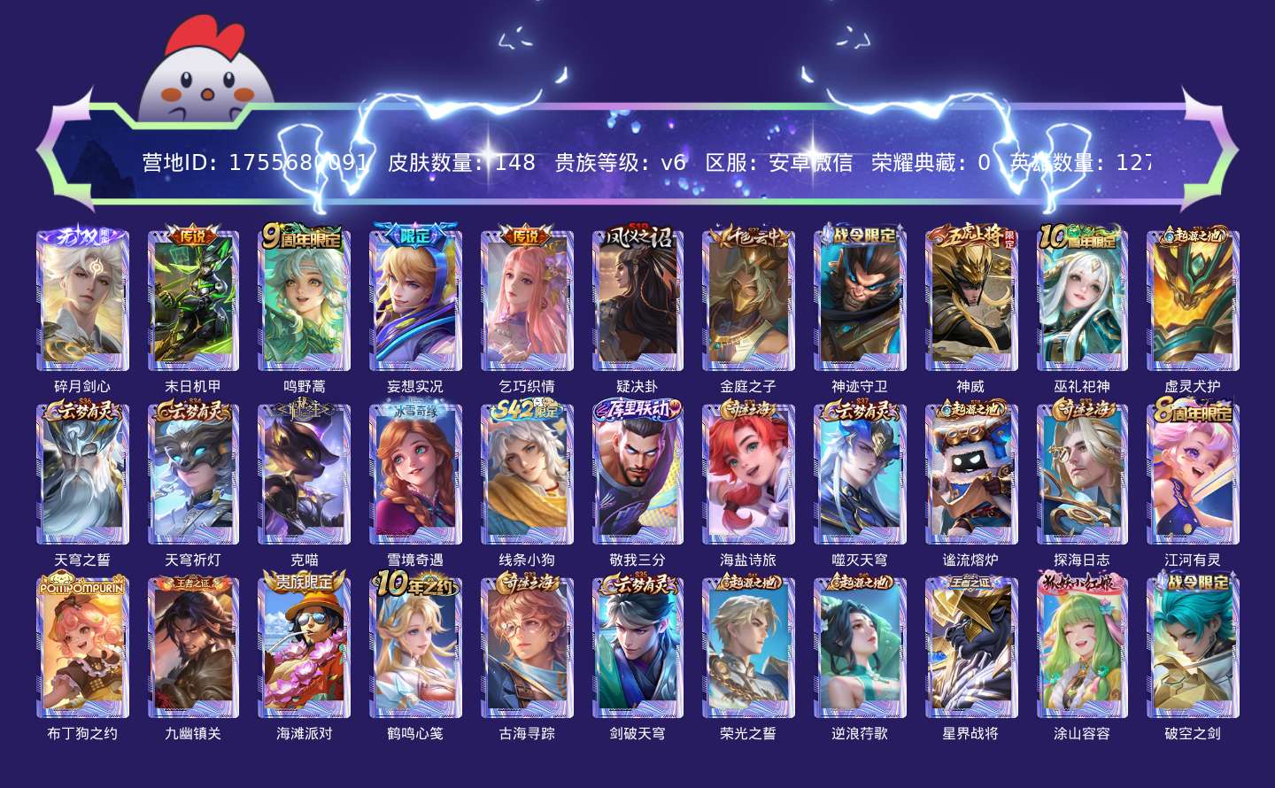 贵族等级:v6皮肤数:148传说品质4 无双1 英雄数:127