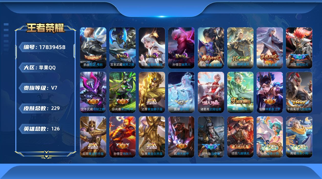 贵族等级:v7皮肤数:229传说品质16 情人节限定1 生肖限定2 荣耀典藏1 英雄数:126