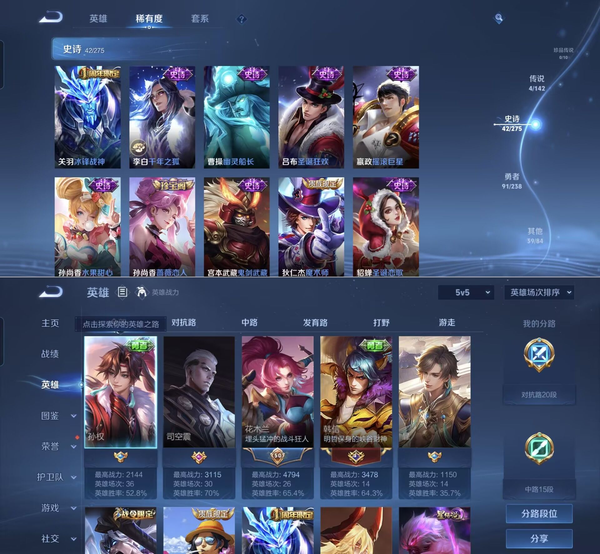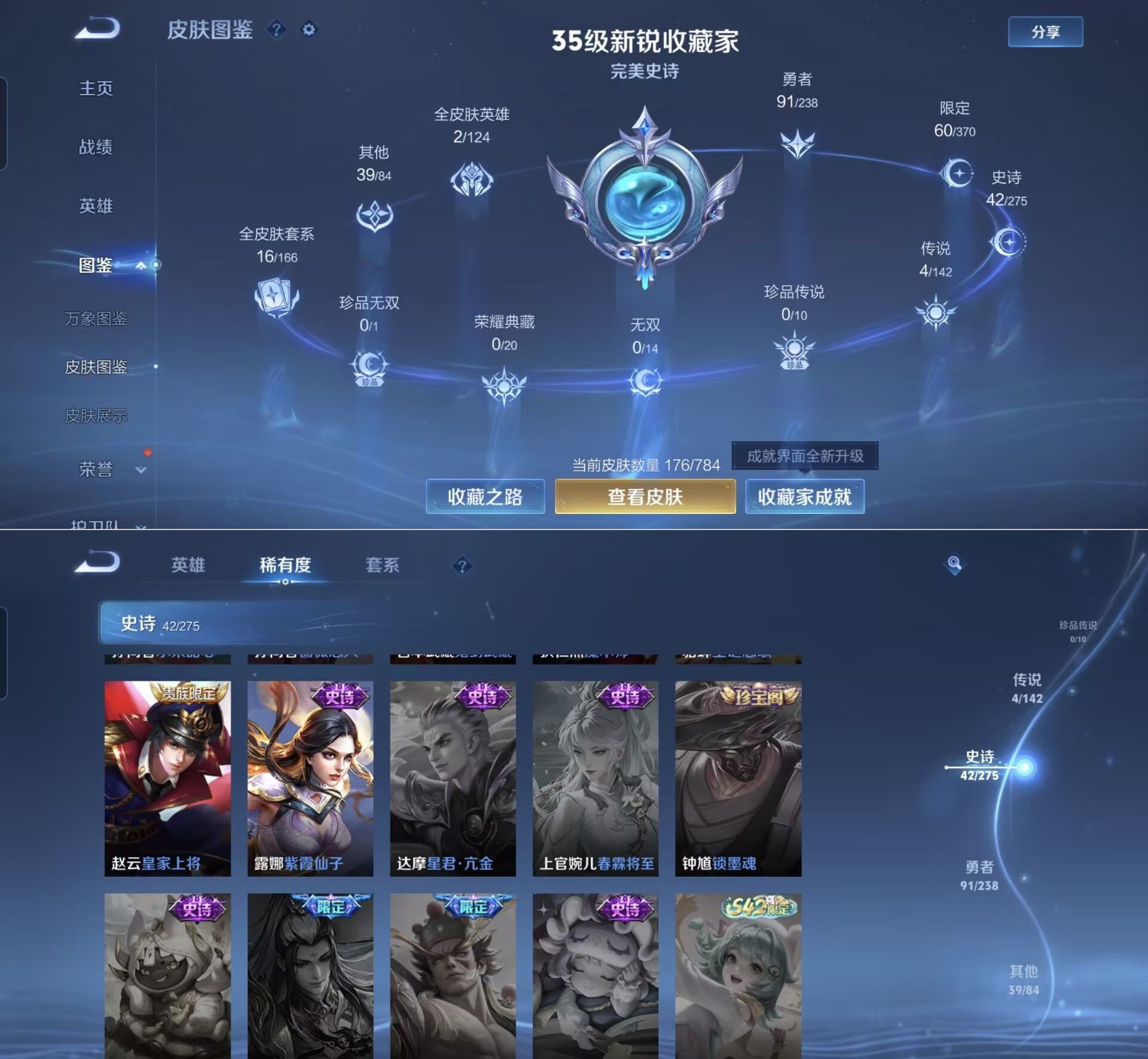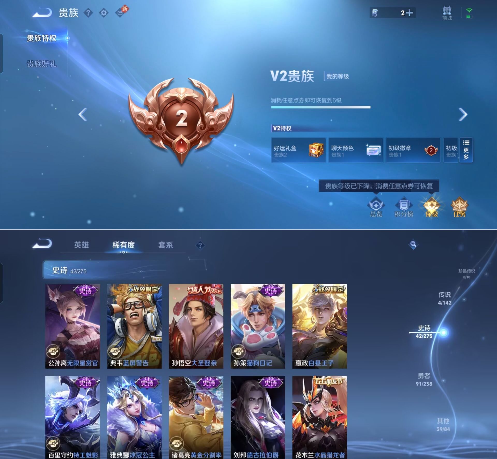 贵族等级:v6皮肤数:177情人节限定1 传说品质4 英雄数:126