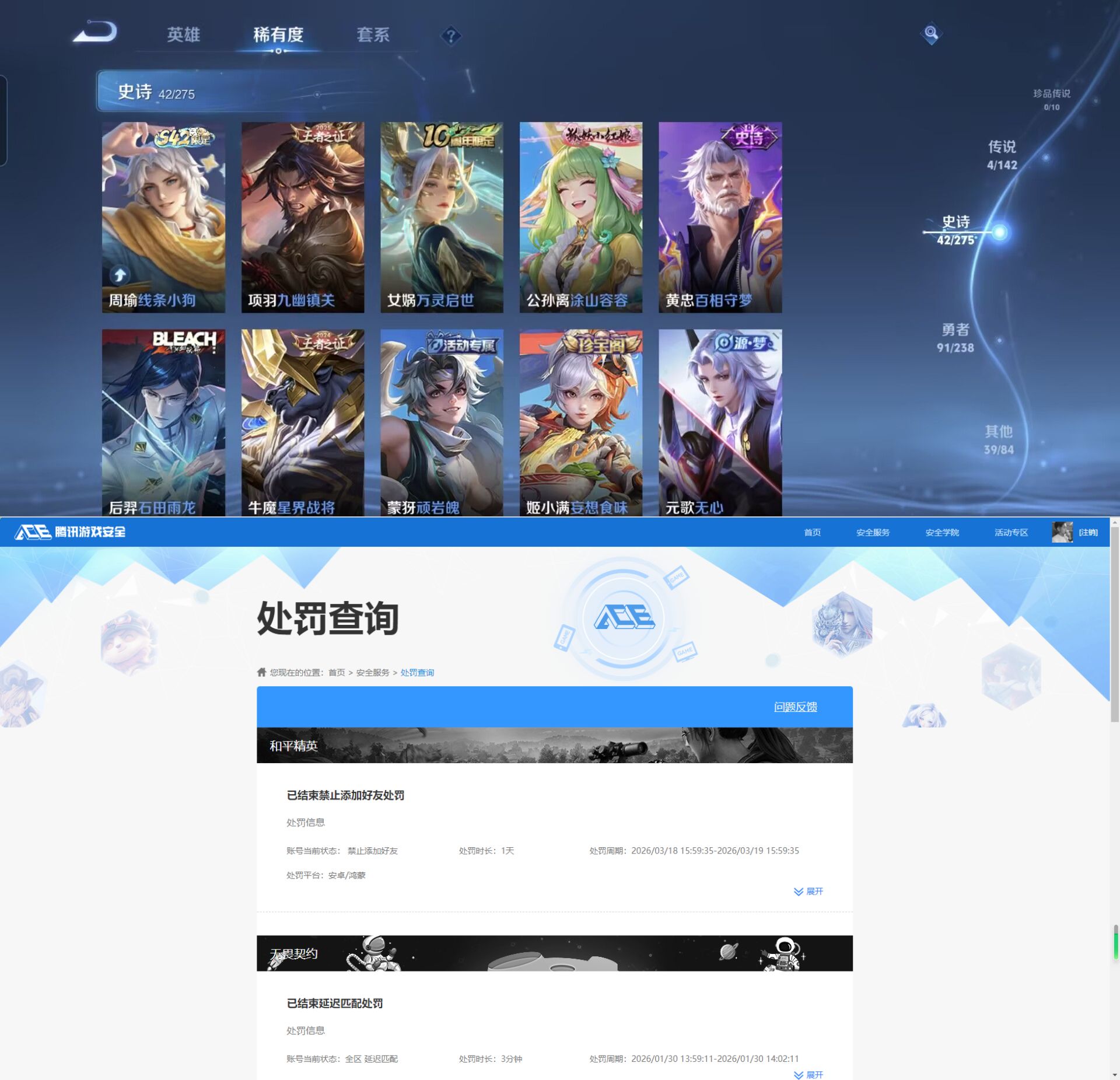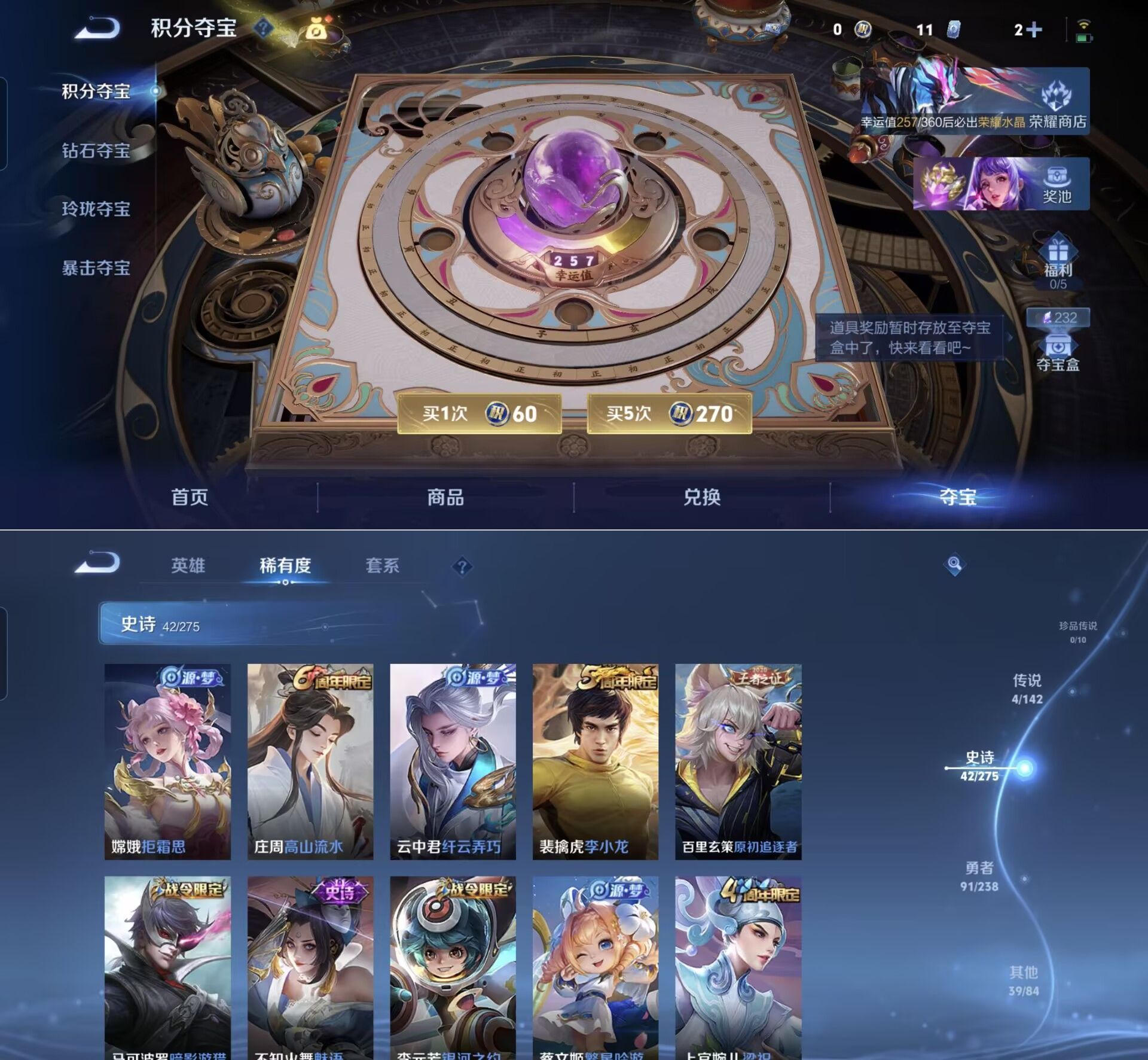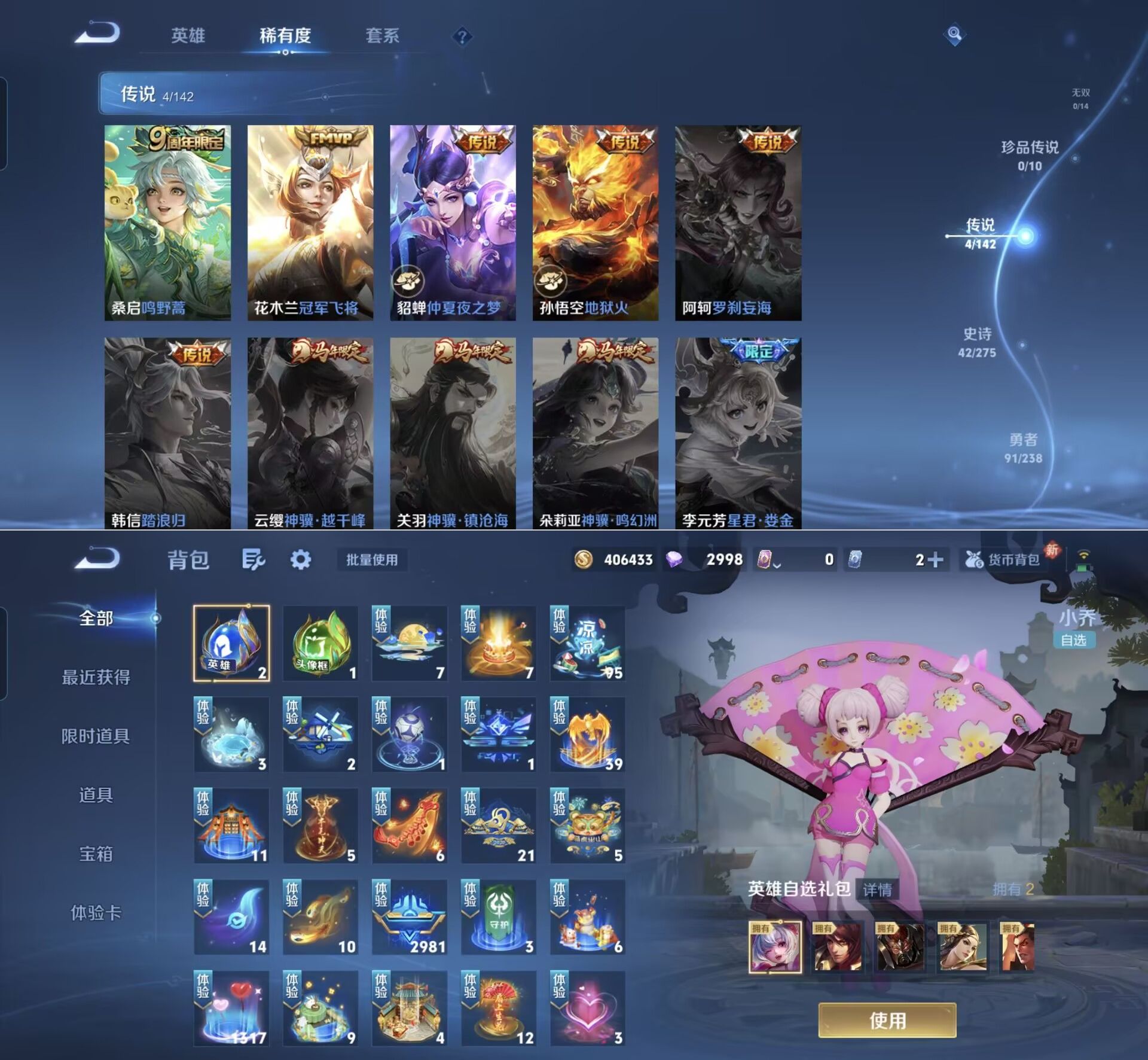 贵族等级:v6皮肤数:177情人节限定1 传说品质4 英雄数:126