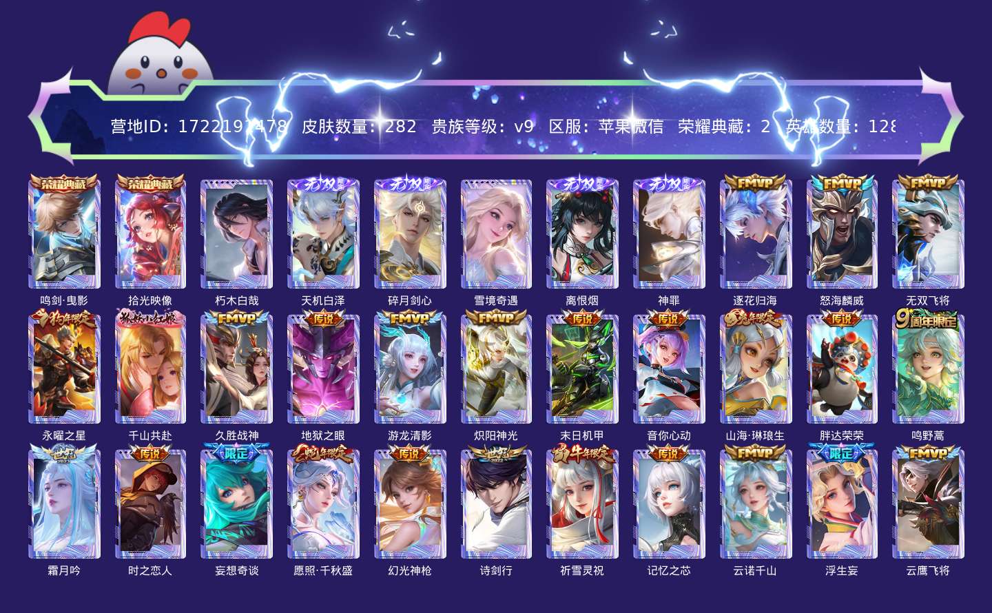 传说品质_澜_逐花归海传说品质_吕布_怒海麟威传说品质_马超_无双飞将传说品质_杨戬_永曜之星传说品质_干将莫邪_千山共赴传说品质_干将莫邪_久胜战神传说品质_宫本武藏_地狱之眼传说品质_西施_游龙清影传说品质_镜_炽阳神光传说品质_孙尚香_末日机甲传说品质_小乔_音你心动传说品质_小乔_山海·琳琅生传说品质_梦奇_胖达荣荣传说品质_桑启_鸣野蒿传说品质_露娜_霜月吟传说品质_刘备_时之恋人传说品质_上官婉儿_妄想奇谈传说品质_女娲_愿照·千秋盛传说品质_云缨_幻光神枪传说品质_李白_诗剑行传说品质_公孙离_祈雪灵祝传说品质_公孙离_记忆之芯传说品质_公孙离_云诺千山传说品质_夏洛特_浮生妄传说品质_曜_云鹰飞将传说品质_狄仁杰_超时空战士传说品质_达摩_黄金狮子座传说品质_铠_绛天战甲传说品质_虞姬_启明星使传说品质_李元芳_飞鸢探春传说品质_百里玄策_白虎志传说品质_裴擒虎_寅虎·赤拳