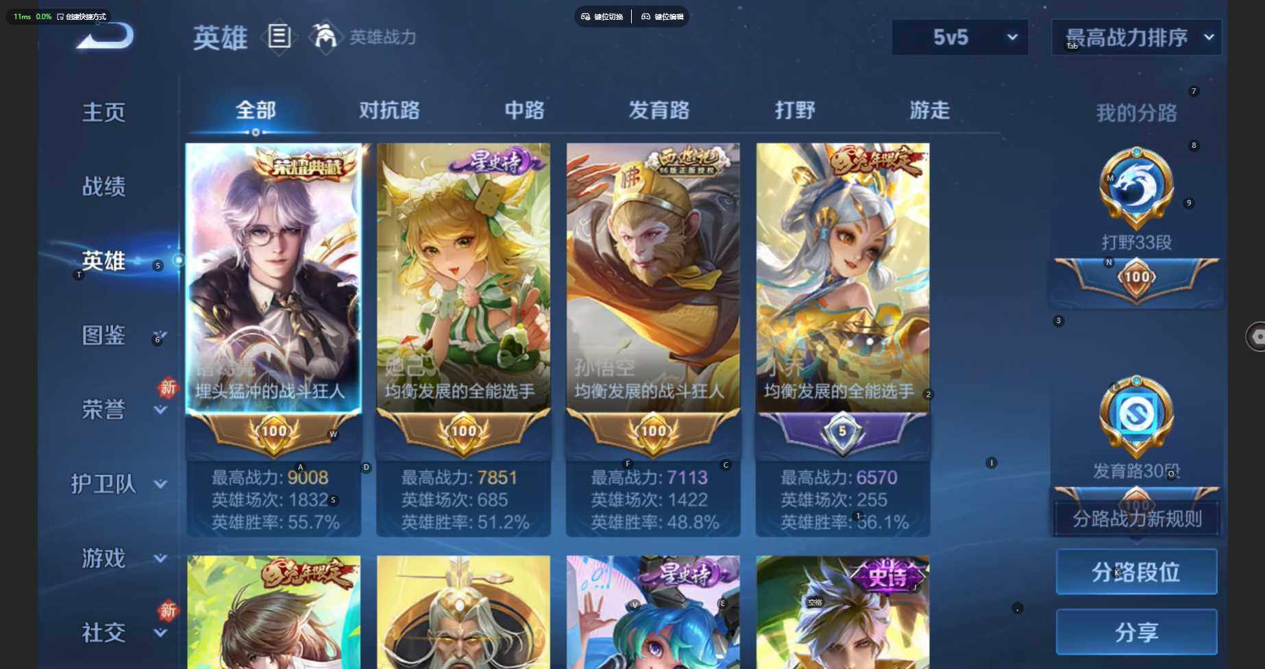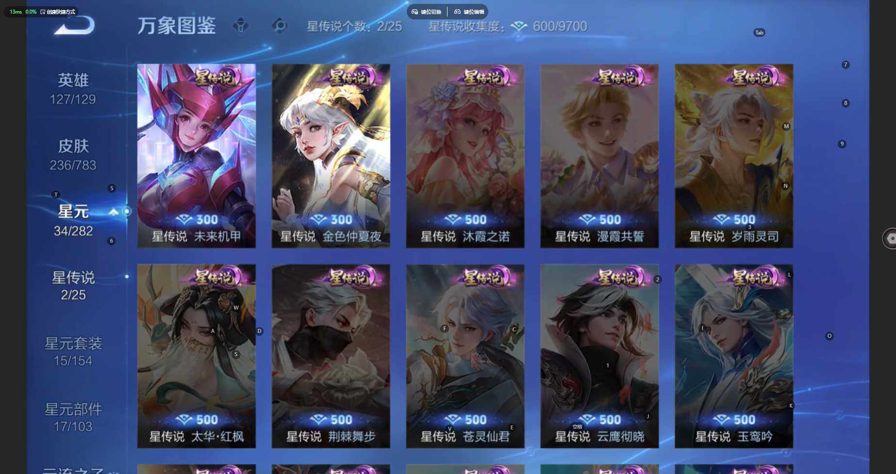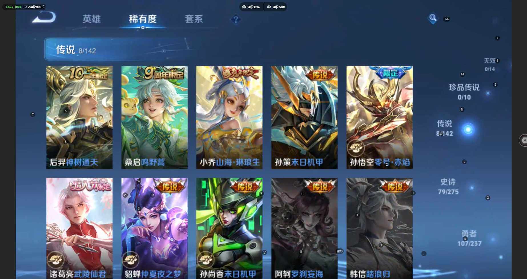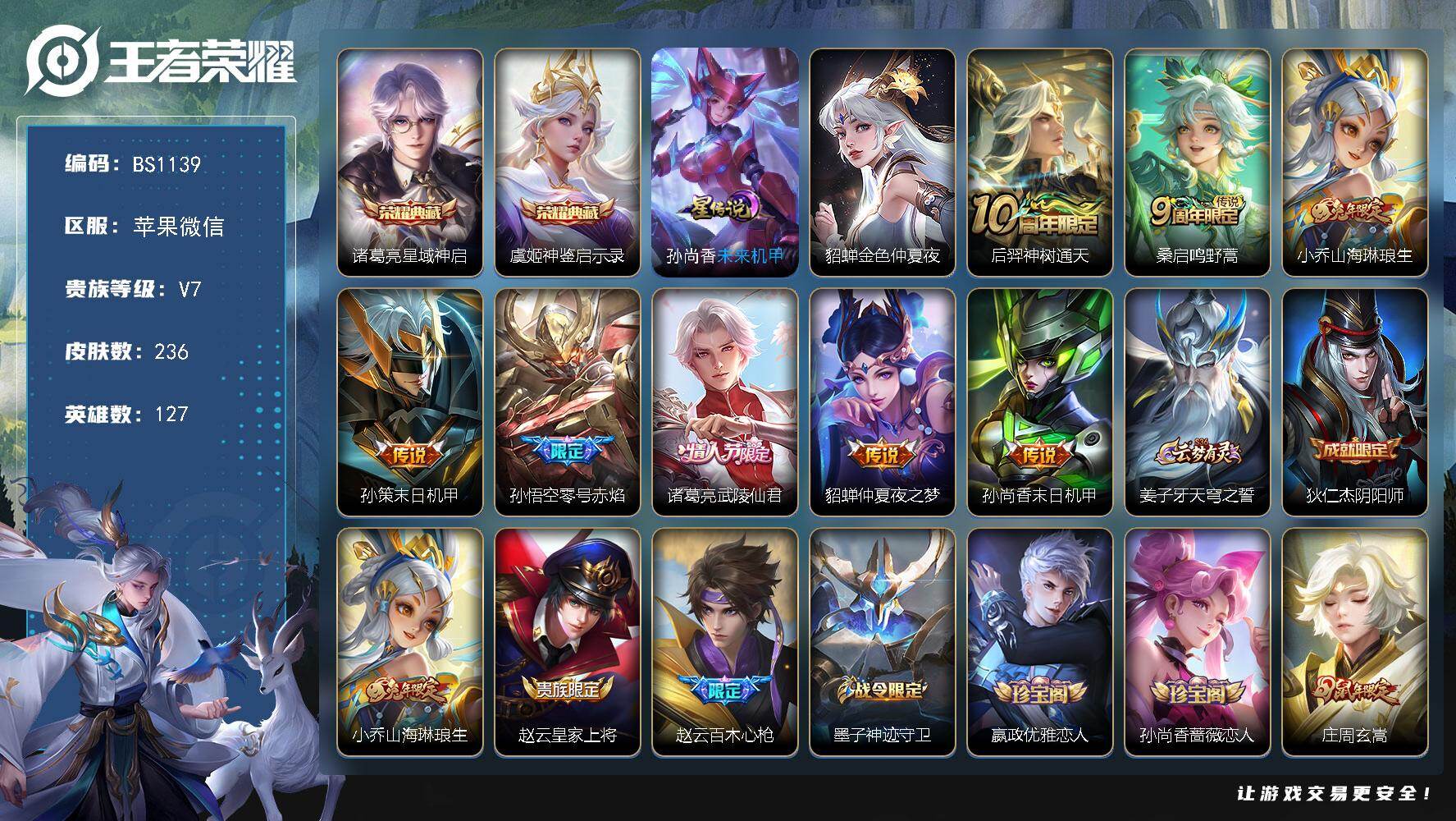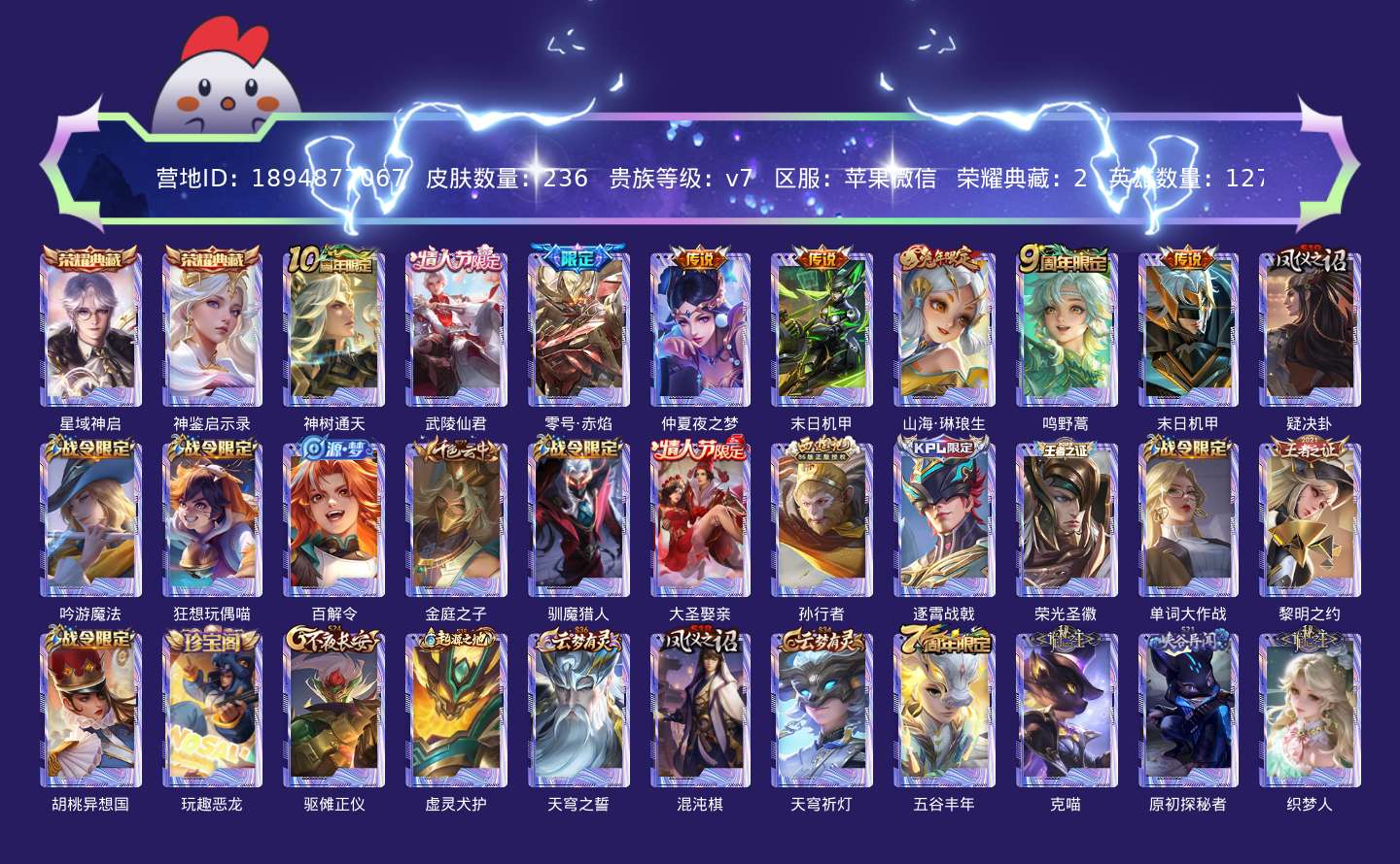 贵族等级:v7皮肤数:236传说品质8 情人节限定3 荣耀典藏2 生肖限定6 英雄数:127
