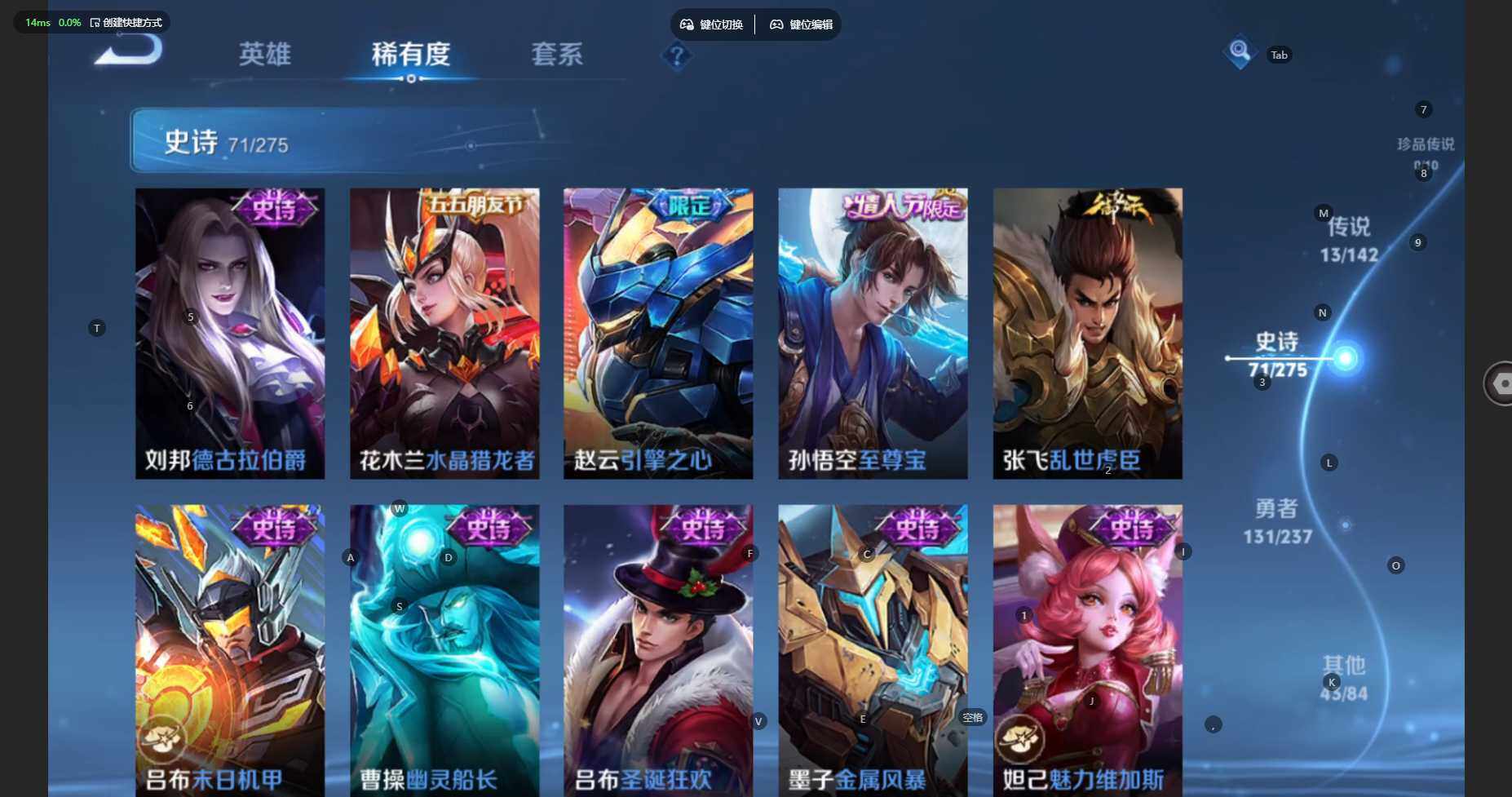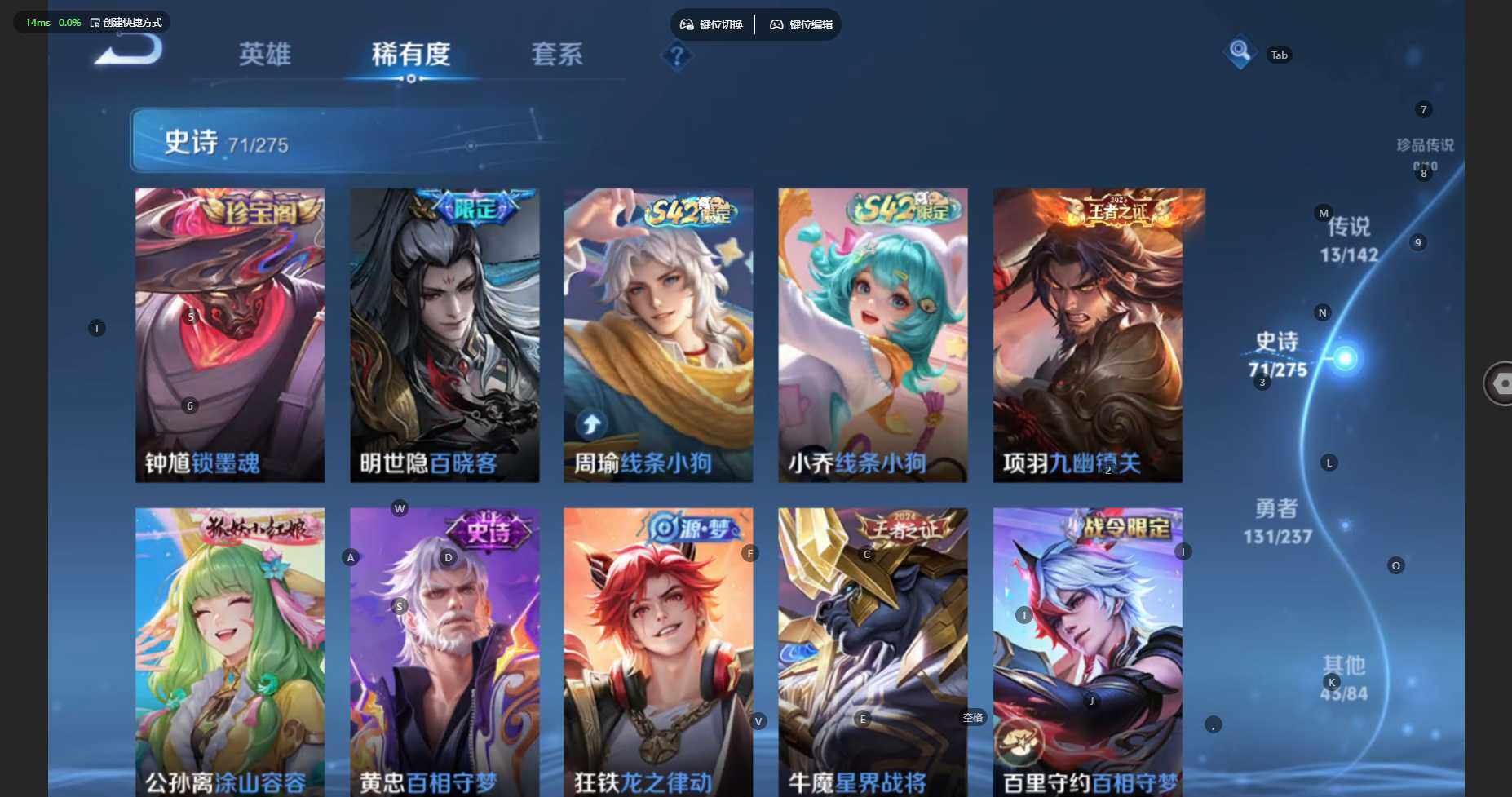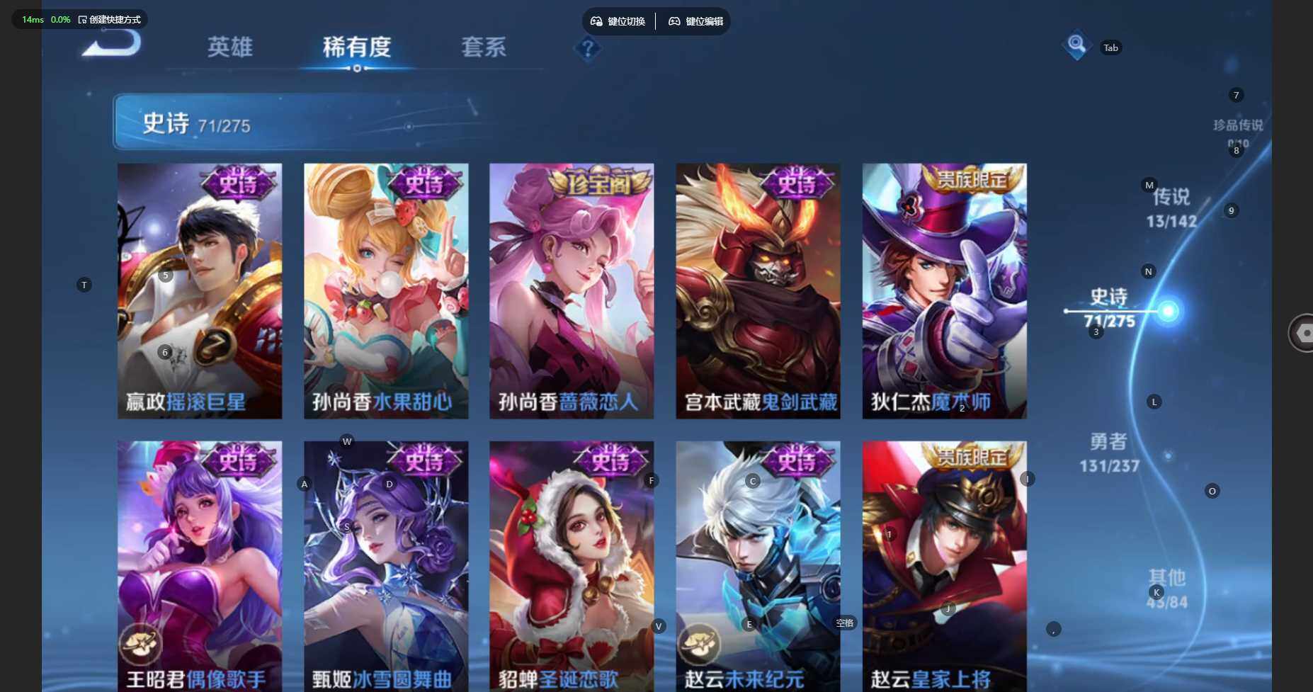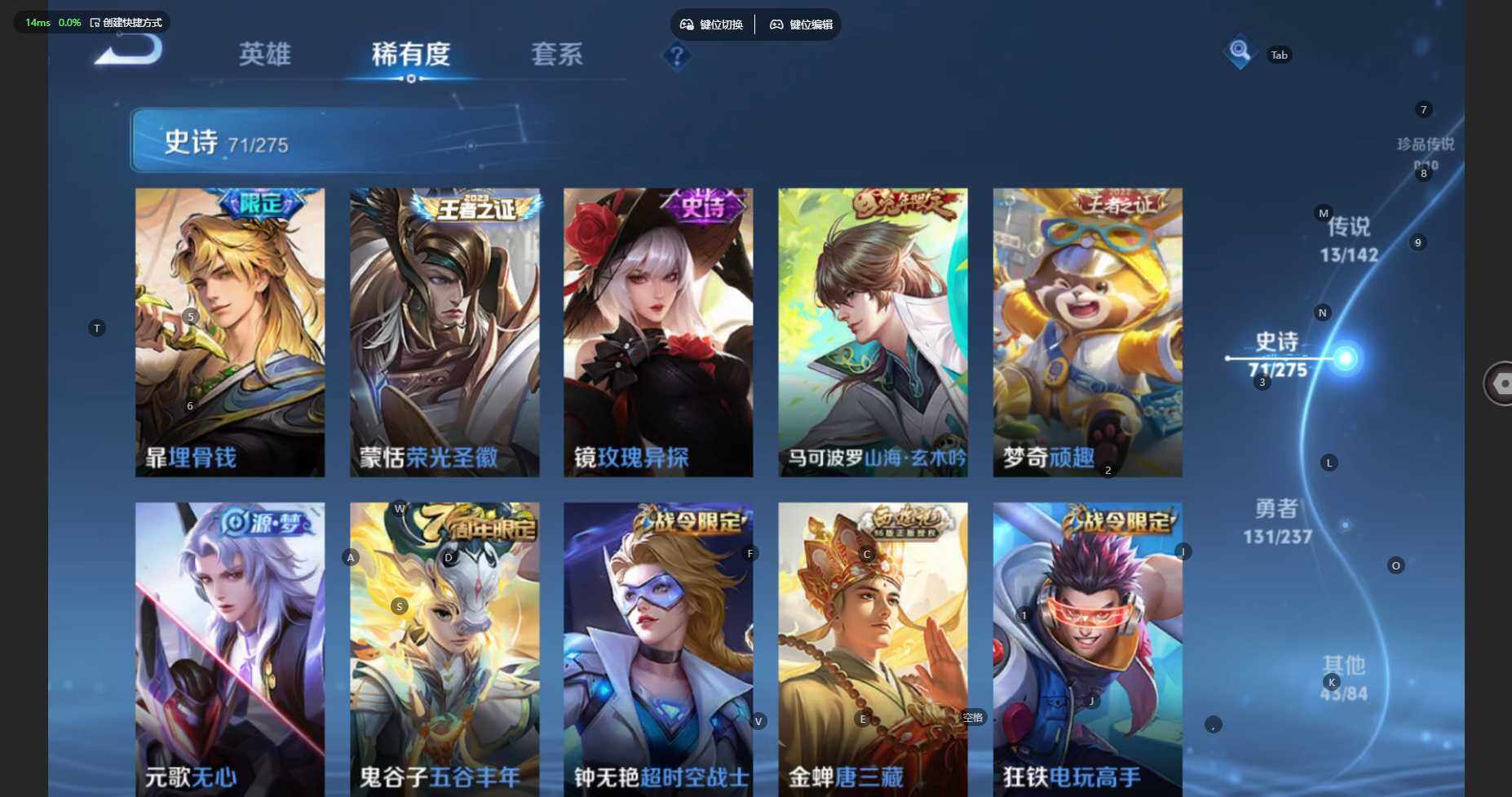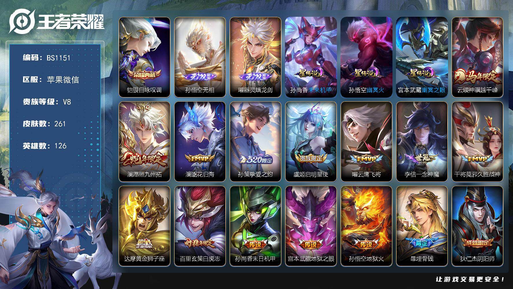 贵族等级:v8皮肤数:261传说品质13 生肖限定5 情人节限定1 无双2 荣耀典藏1 英雄数:126