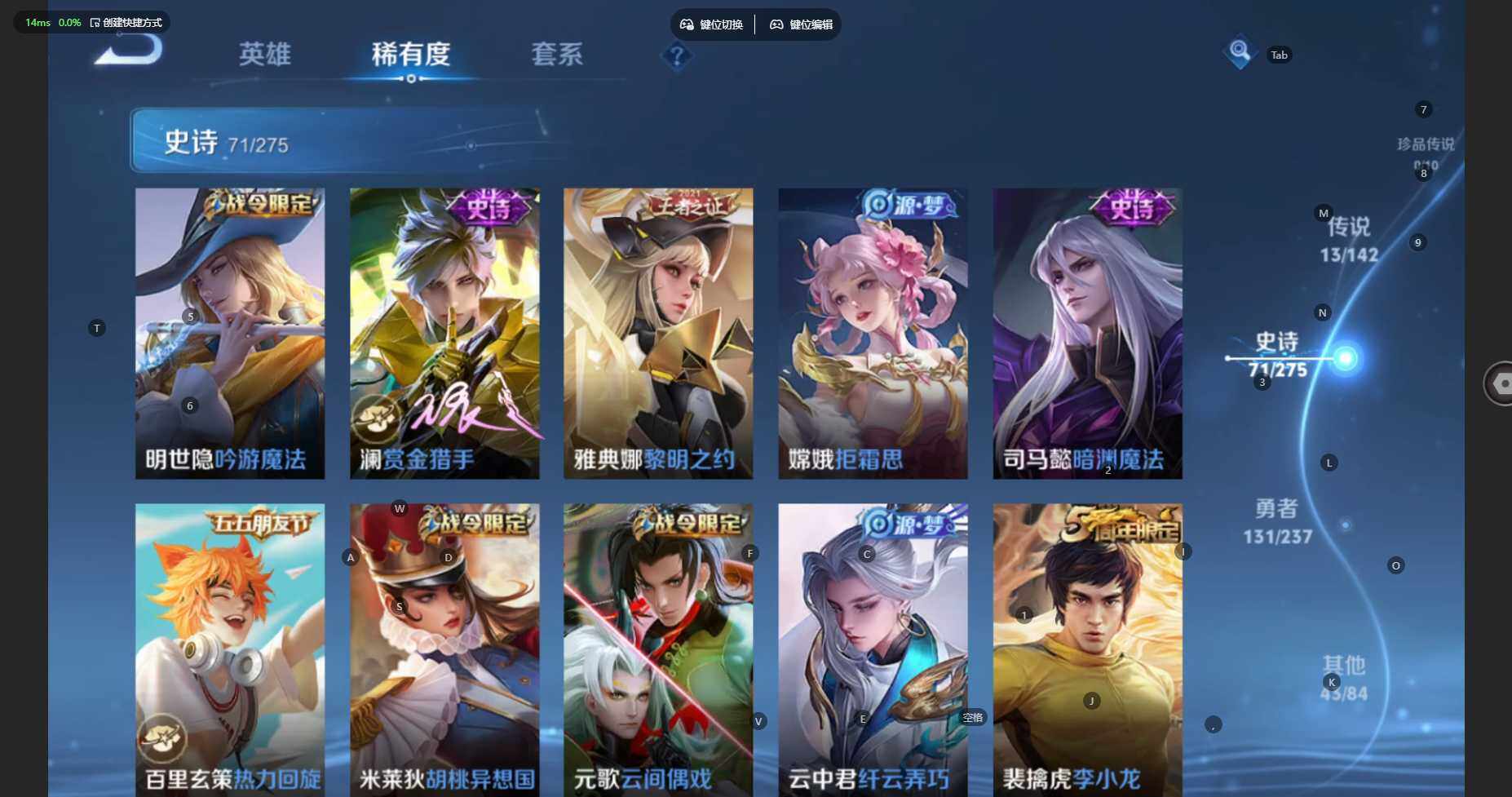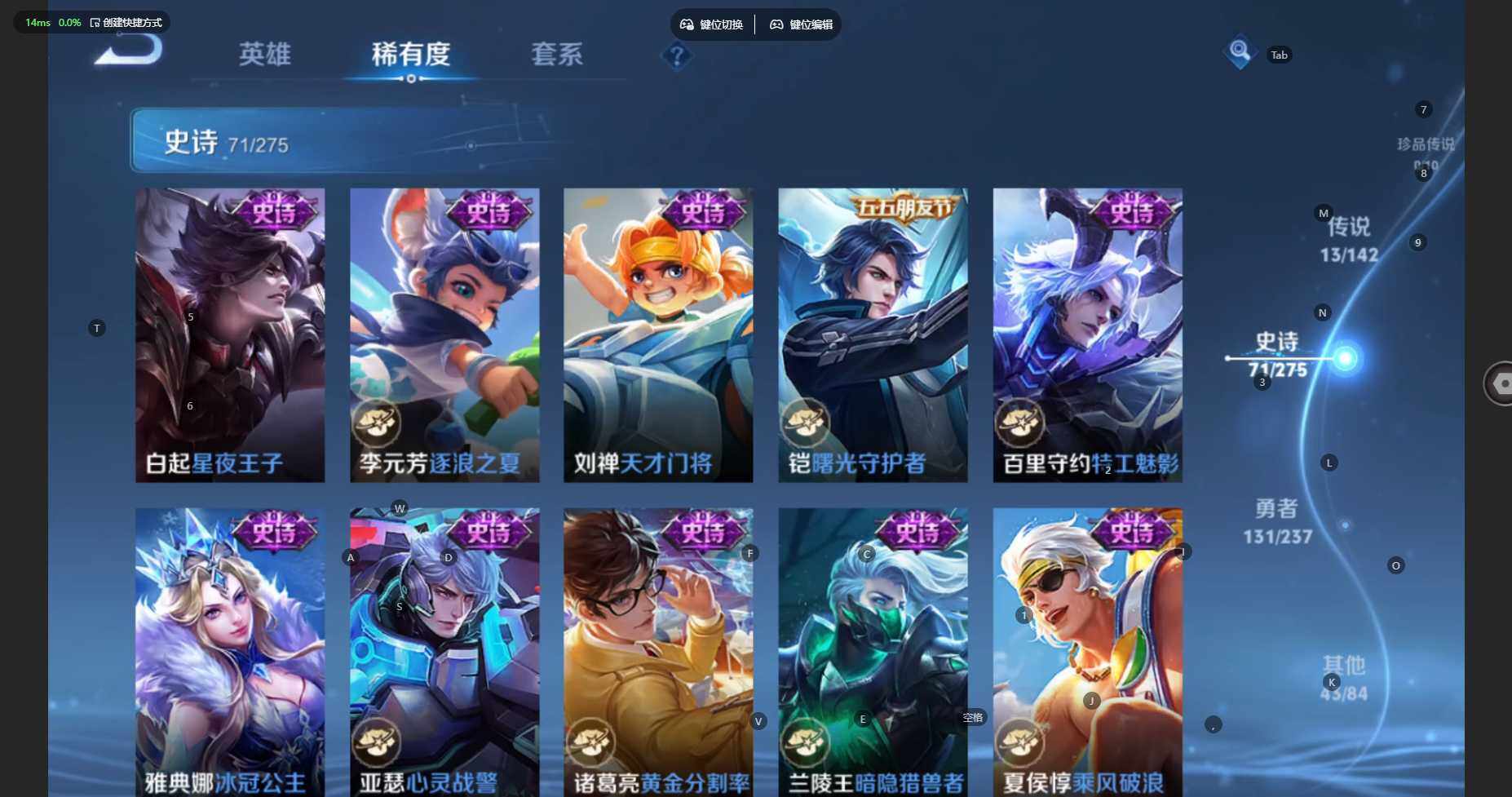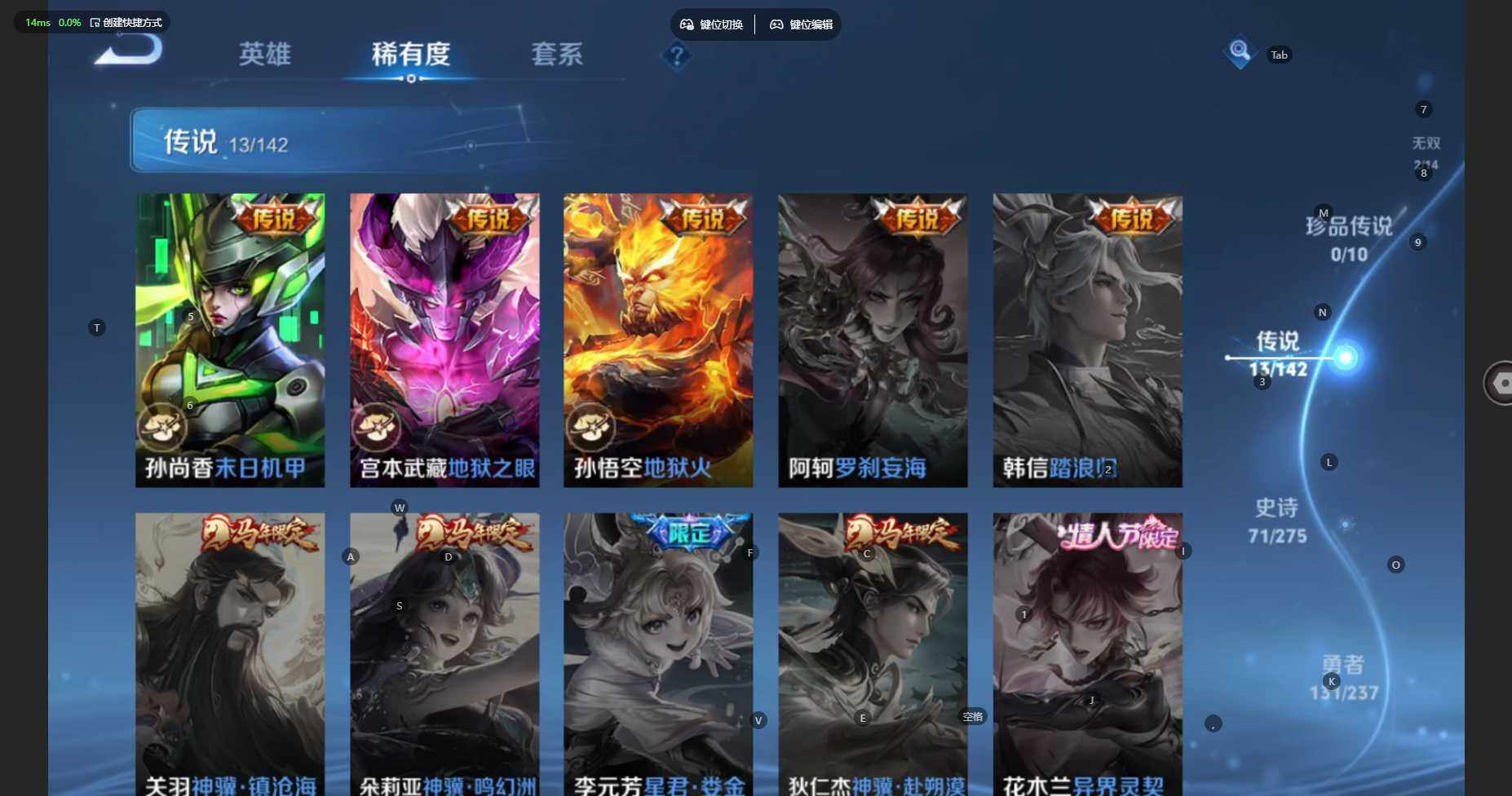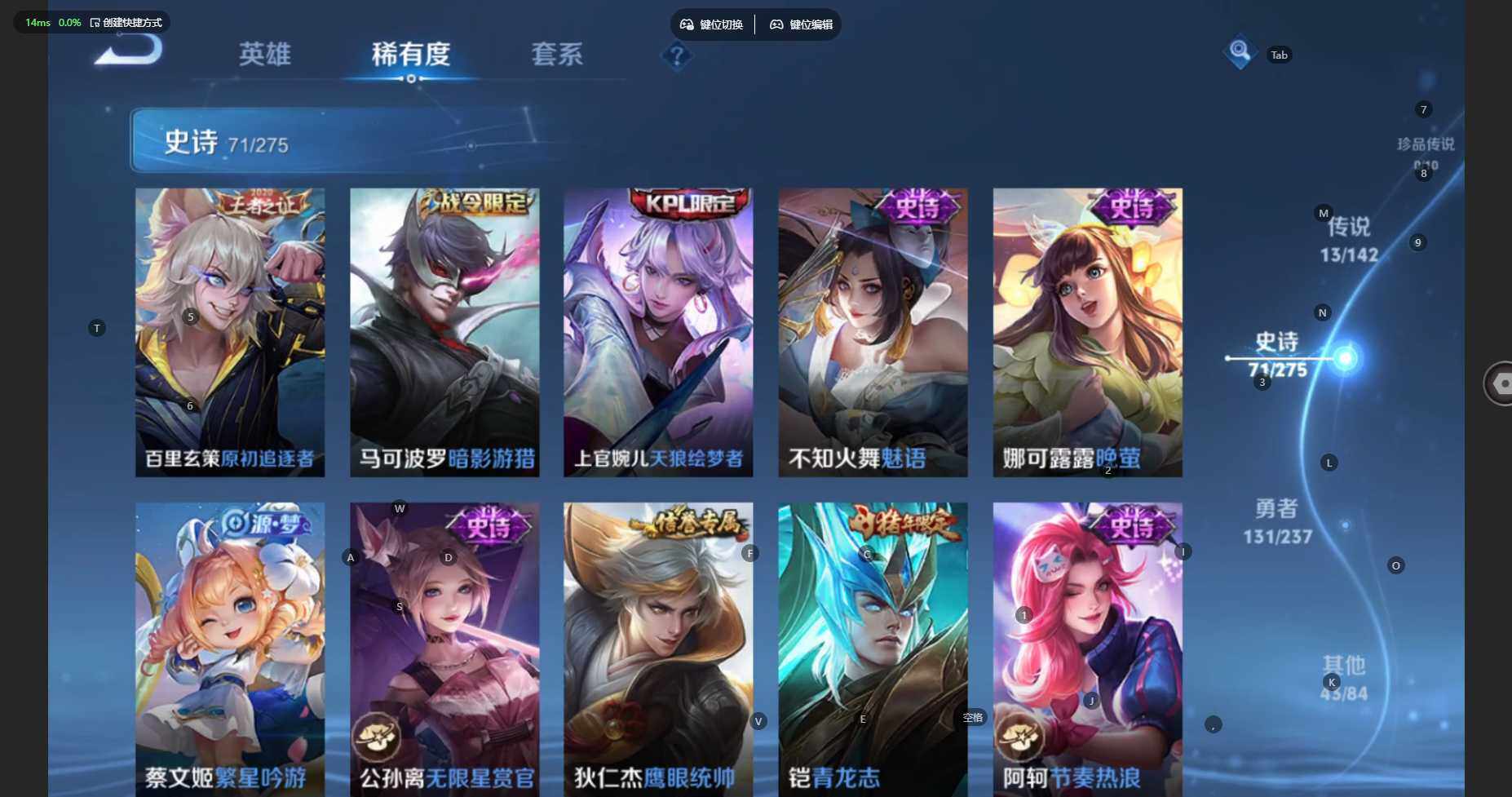 贵族等级:v8皮肤数:261传说品质13 生肖限定5 情人节限定1 无双2 荣耀典藏1 英雄数:126