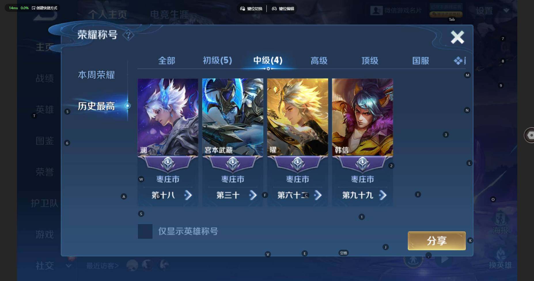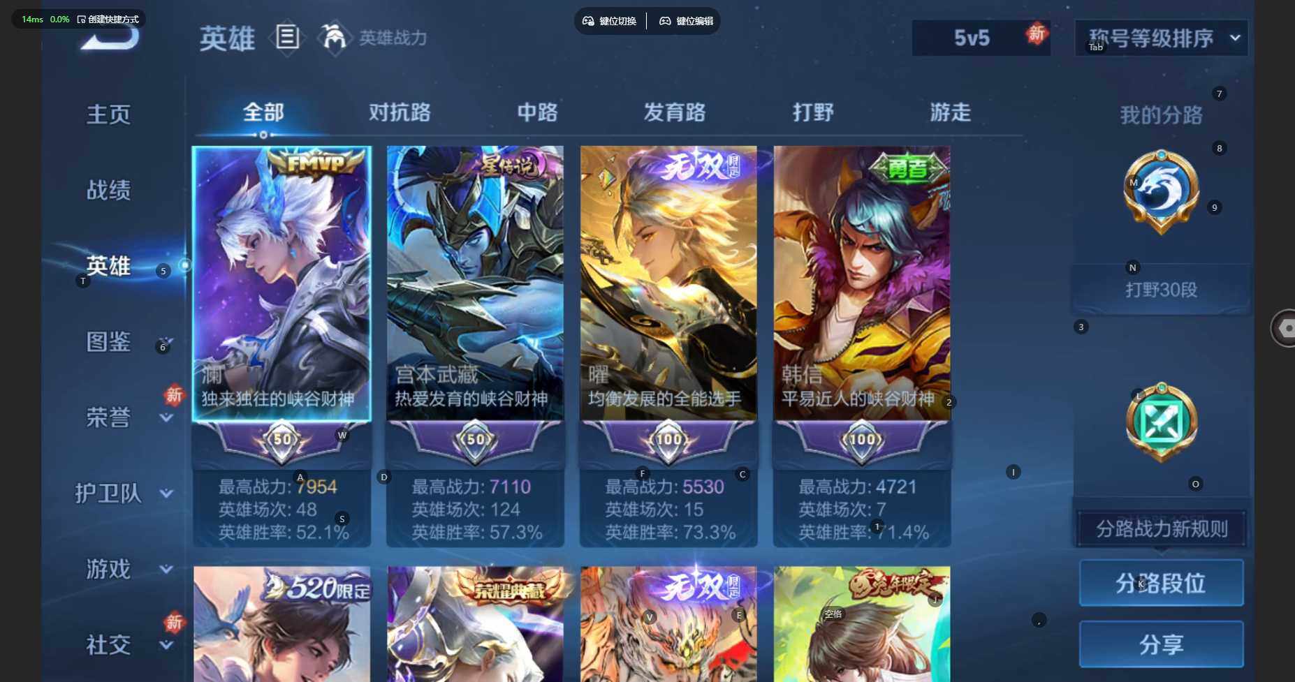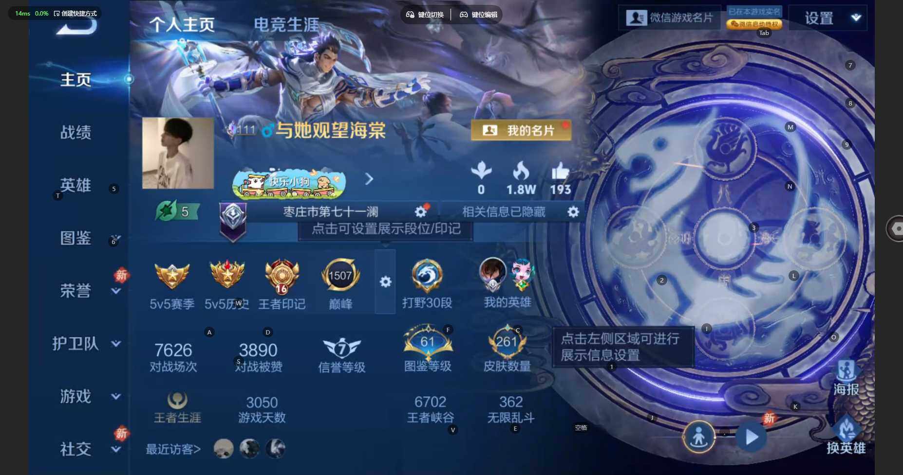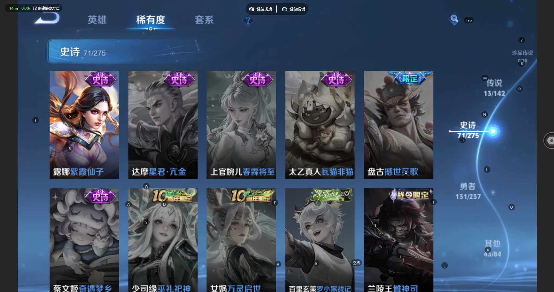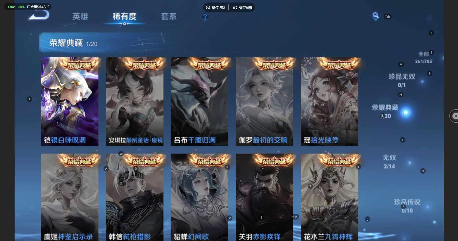 贵族等级:v8皮肤数:261传说品质13 生肖限定5 情人节限定1 无双2 荣耀典藏1 英雄数:126