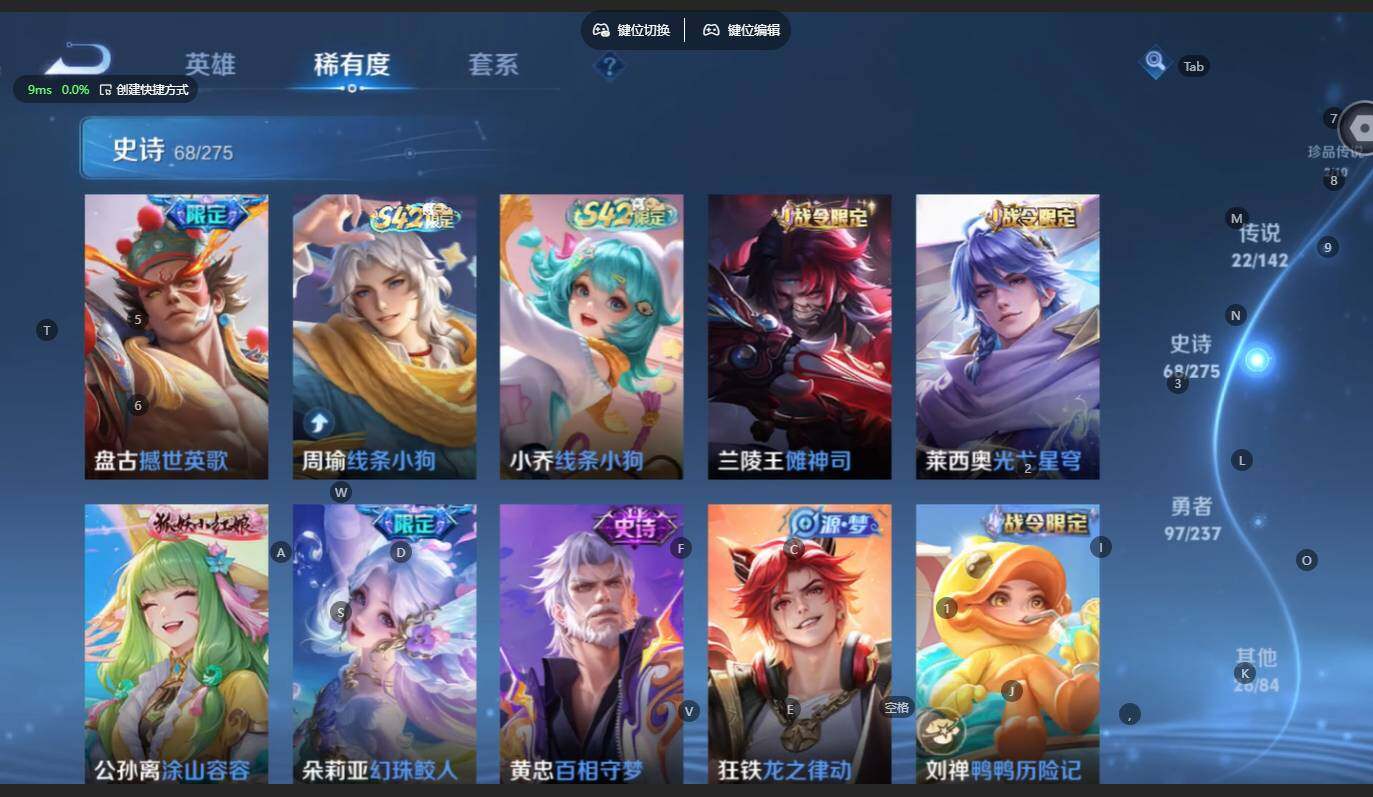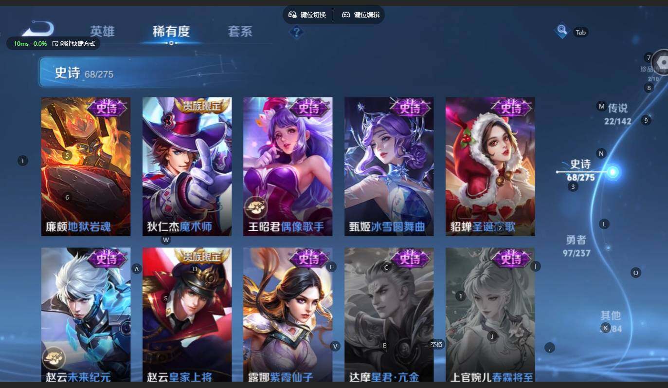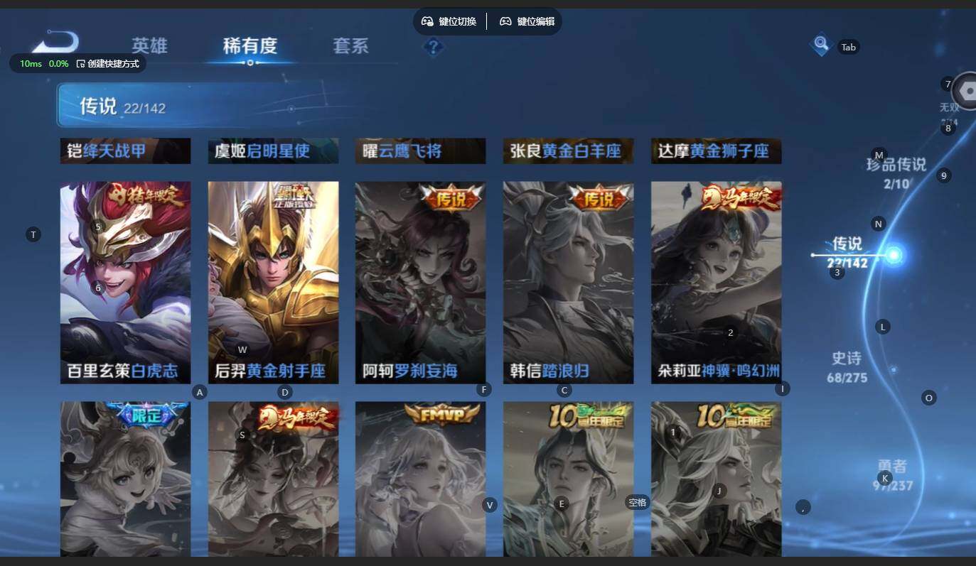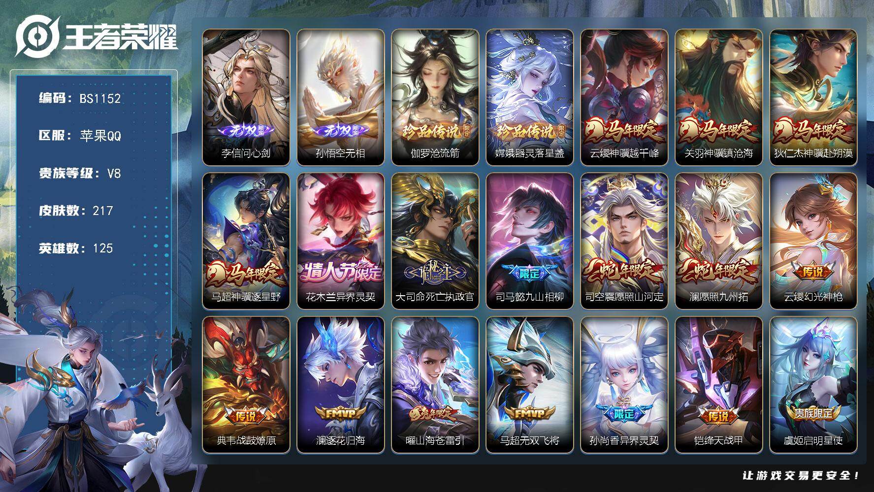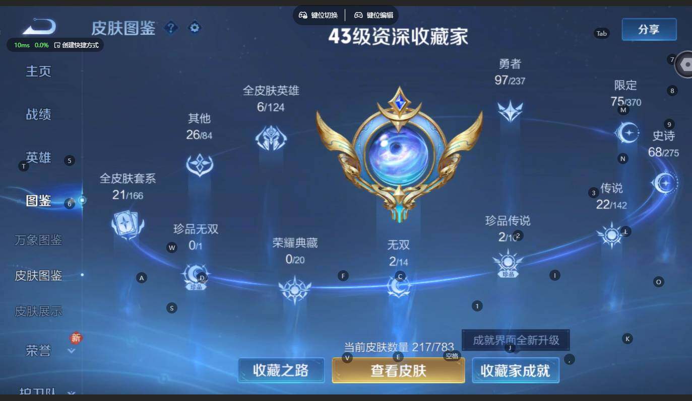 贵族等级:v8皮肤数:217传说品质22 生肖限定9 无双2 情人节限定1 珍品传说2 英雄数:125