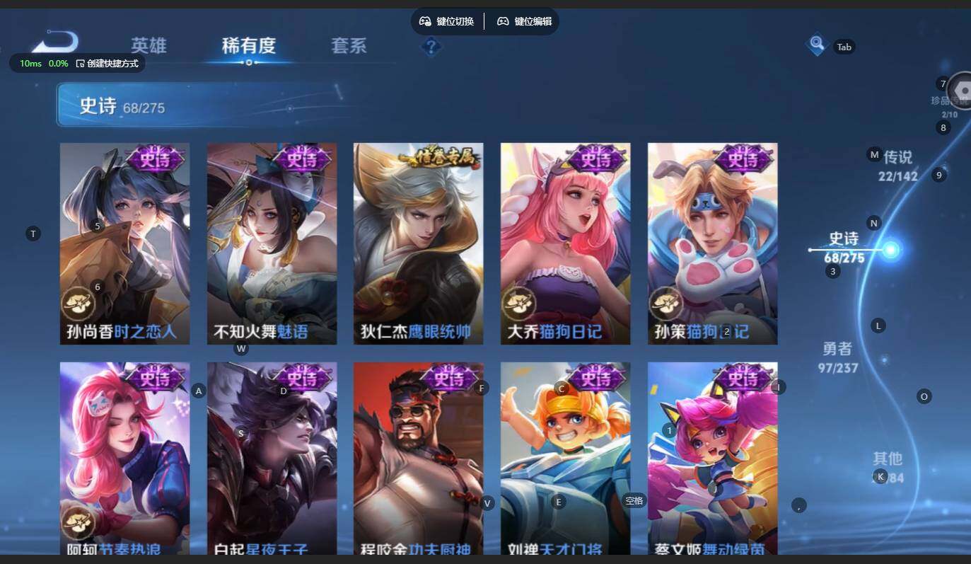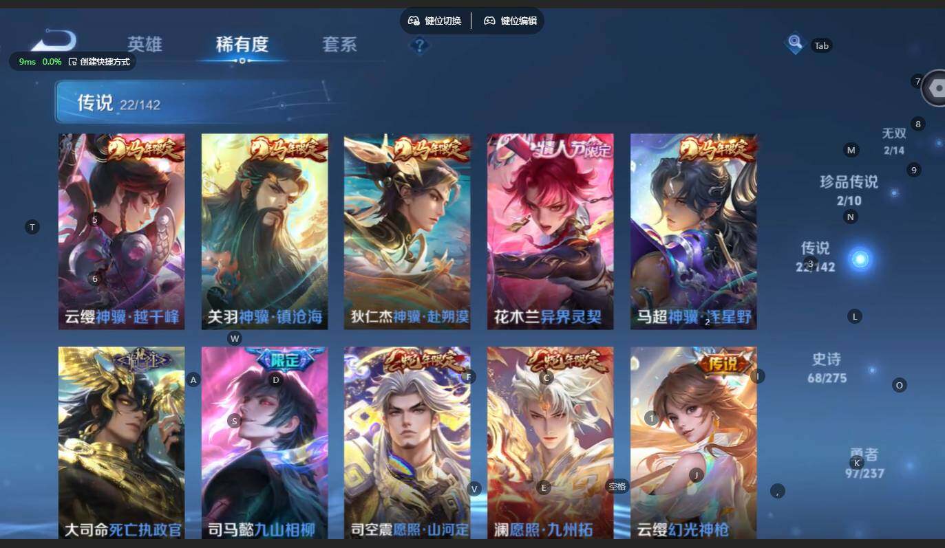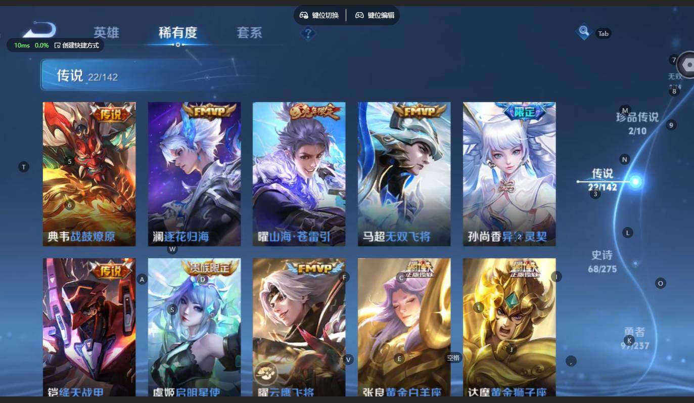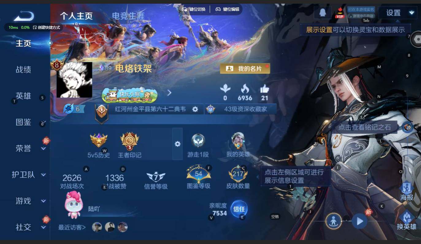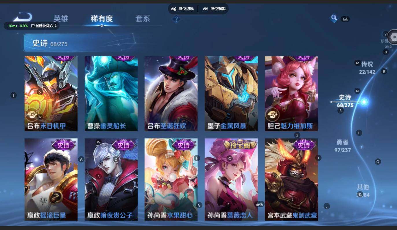 贵族等级:v8皮肤数:217传说品质22 生肖限定9 无双2 情人节限定1 珍品传说2 英雄数:125