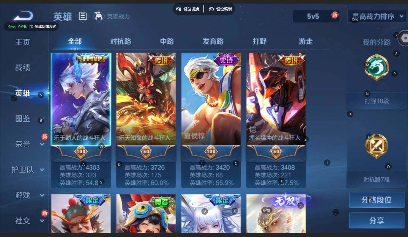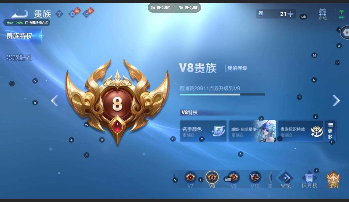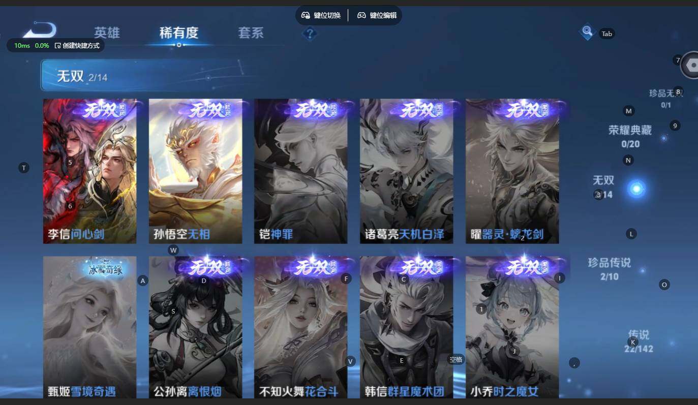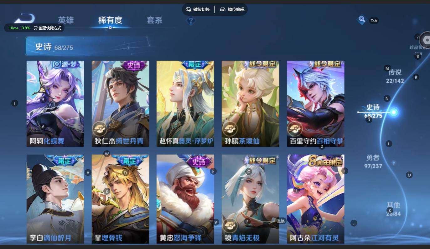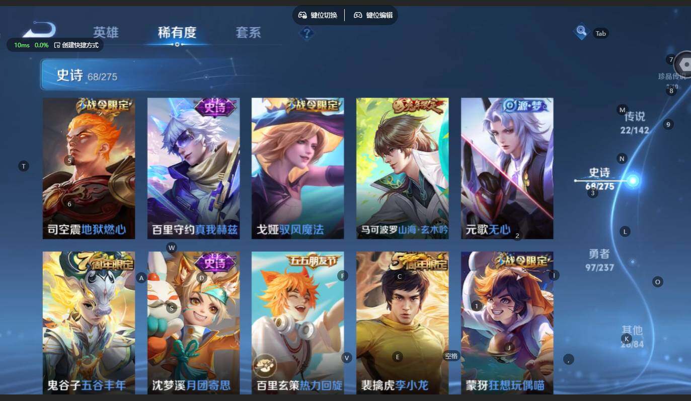 贵族等级:v8皮肤数:217传说品质22 生肖限定9 无双2 情人节限定1 珍品传说2 英雄数:125