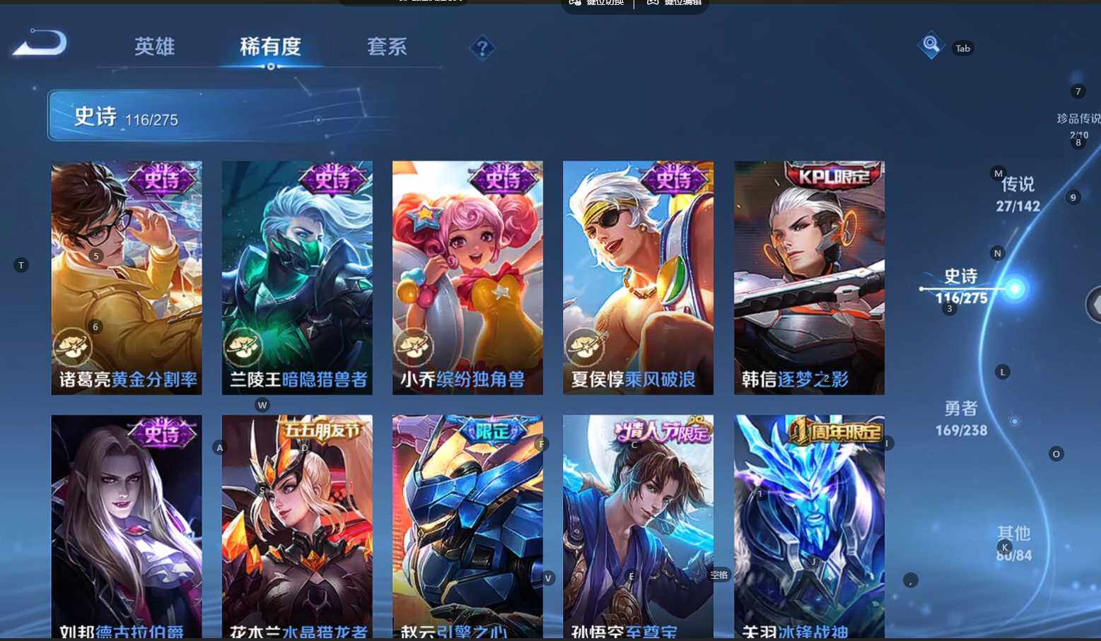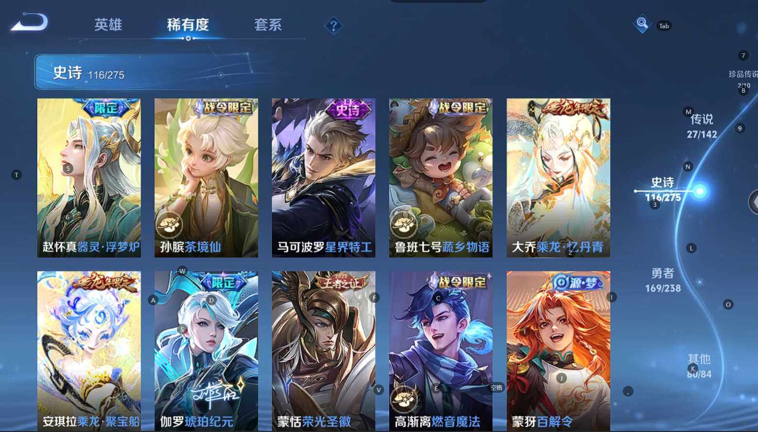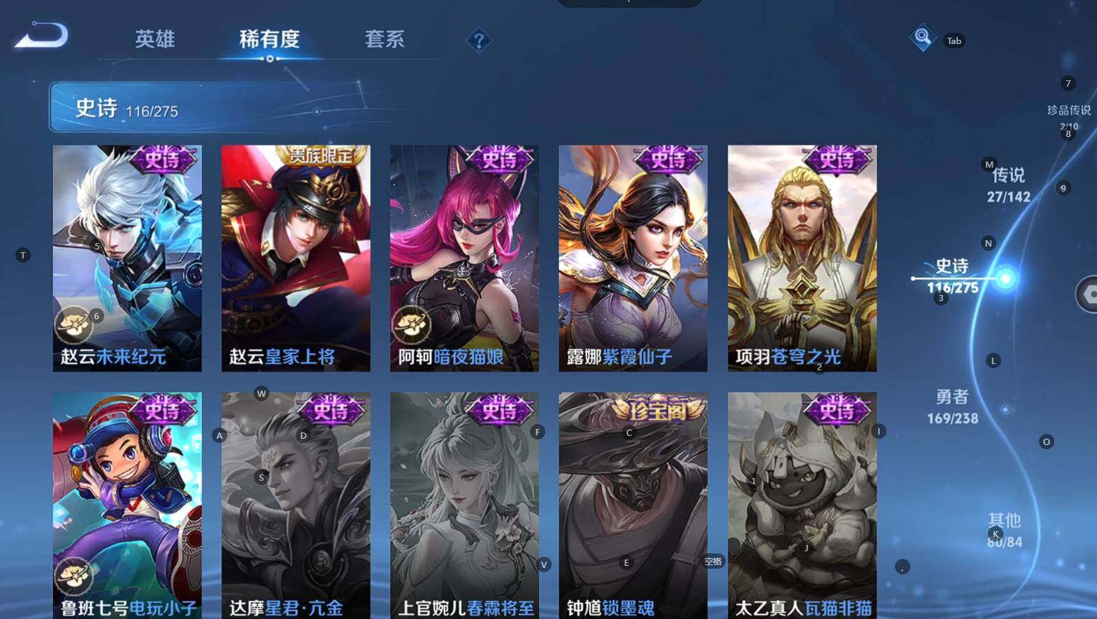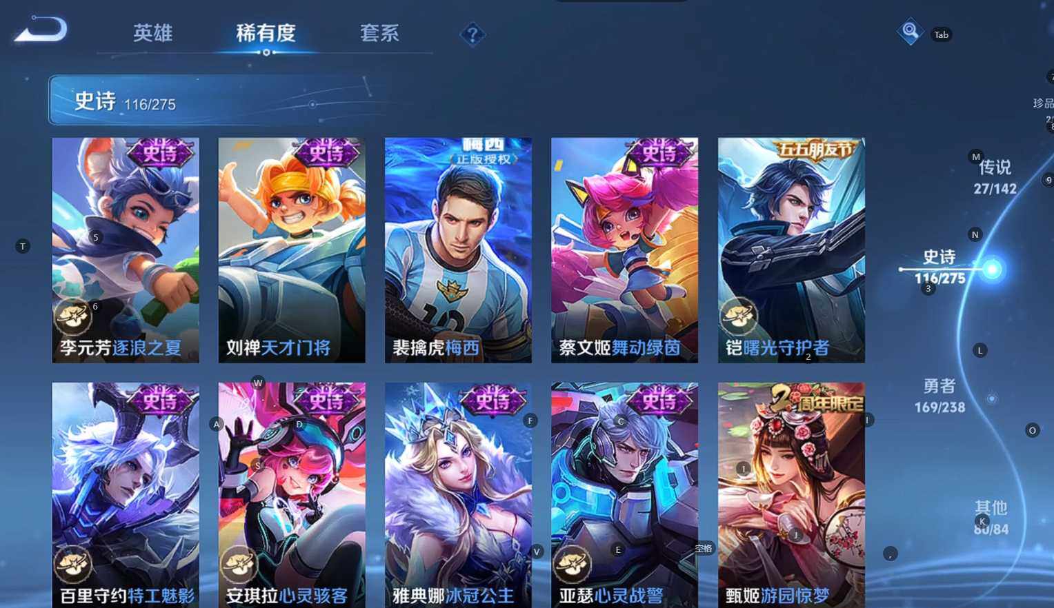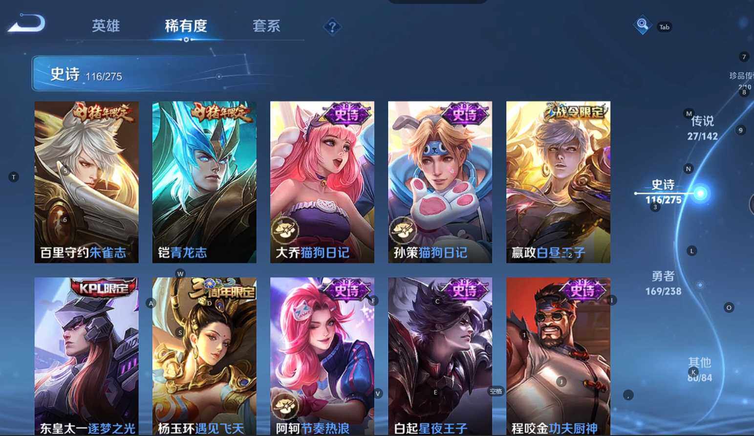 贵族等级:v9皮肤数:398传说品质27 生肖限定10 荣耀典藏3 情人节限定3 无双1 珍品传说2 英雄数:128