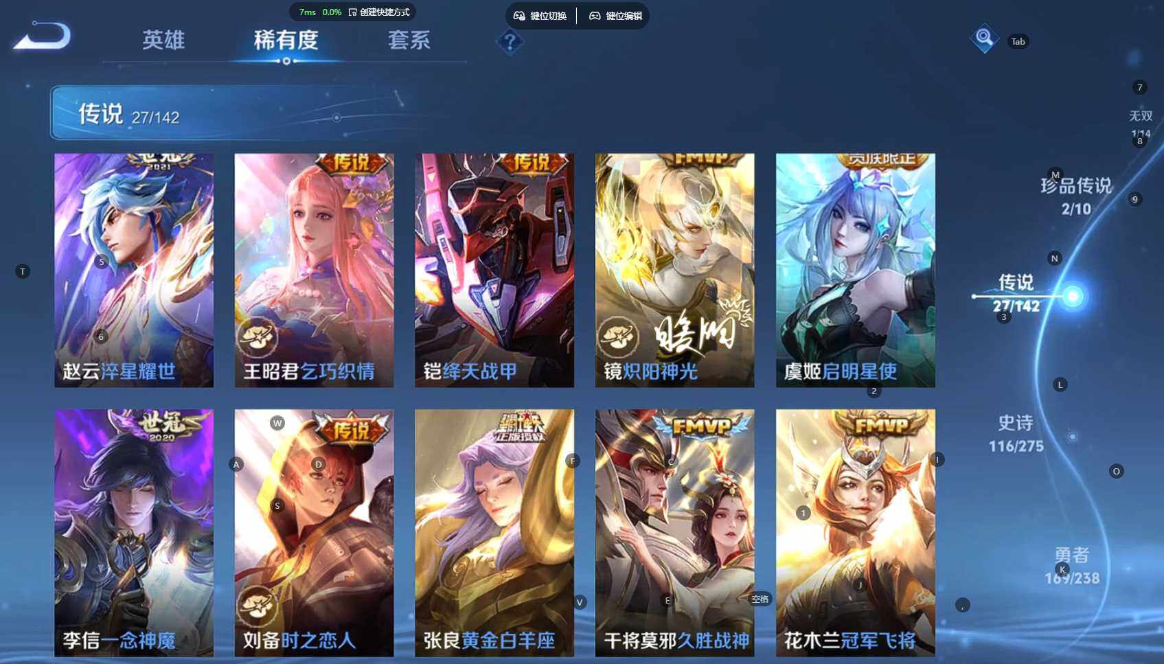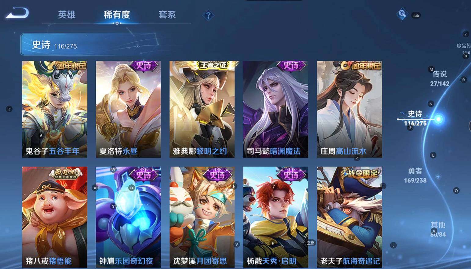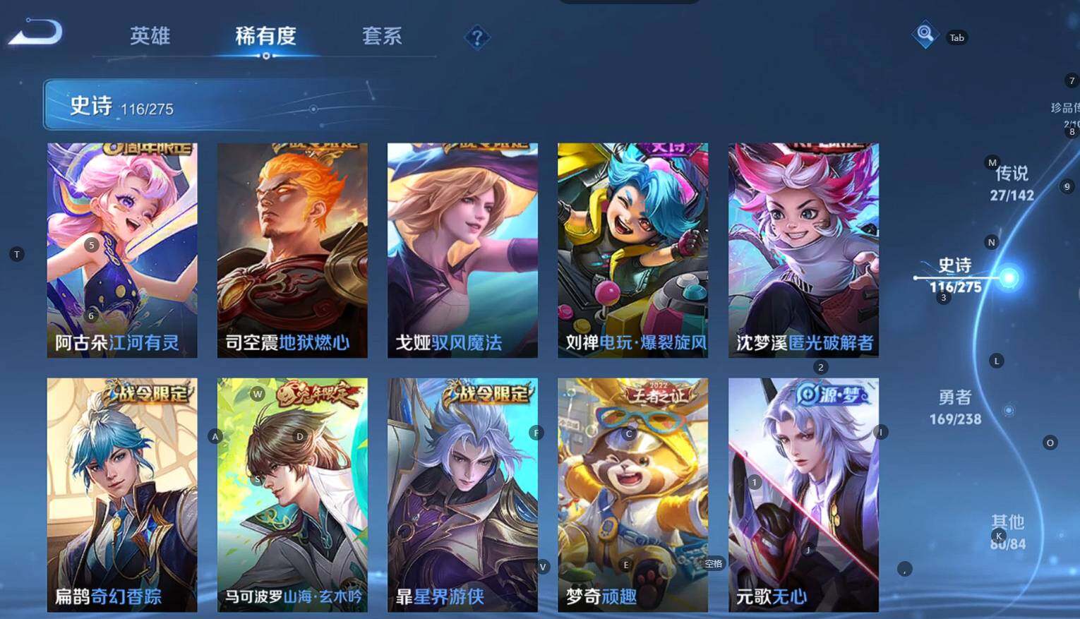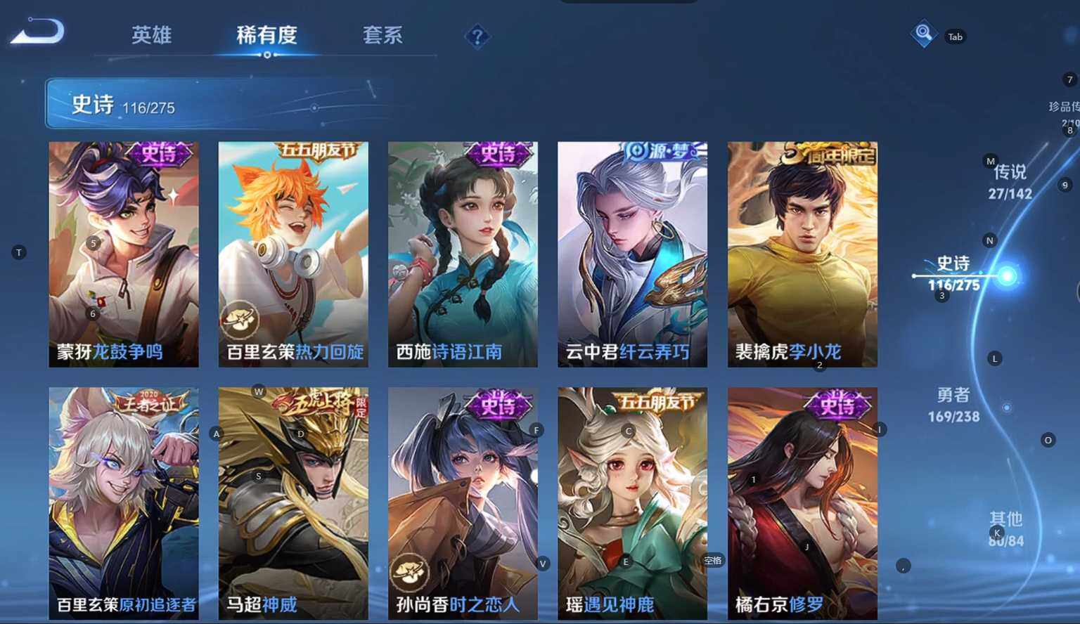 贵族等级:v9皮肤数:398传说品质27 生肖限定10 荣耀典藏3 情人节限定3 无双1 珍品传说2 英雄数:128