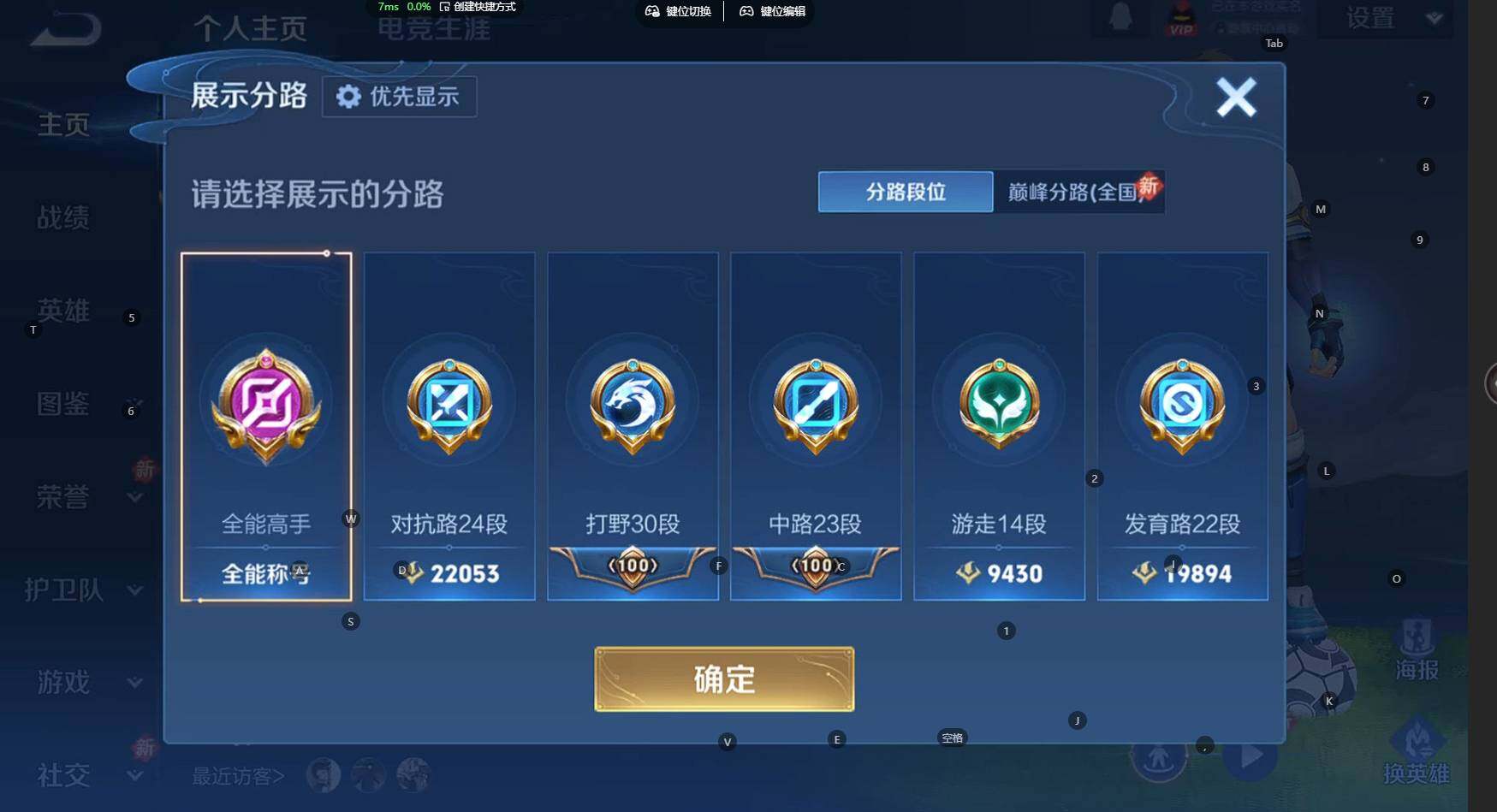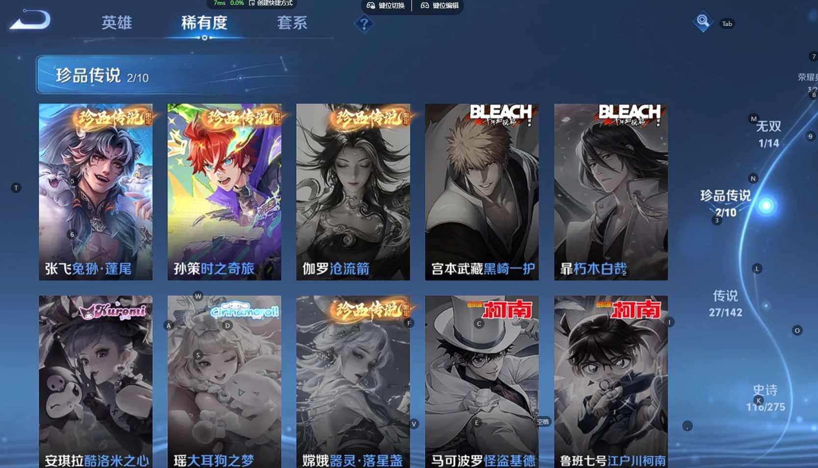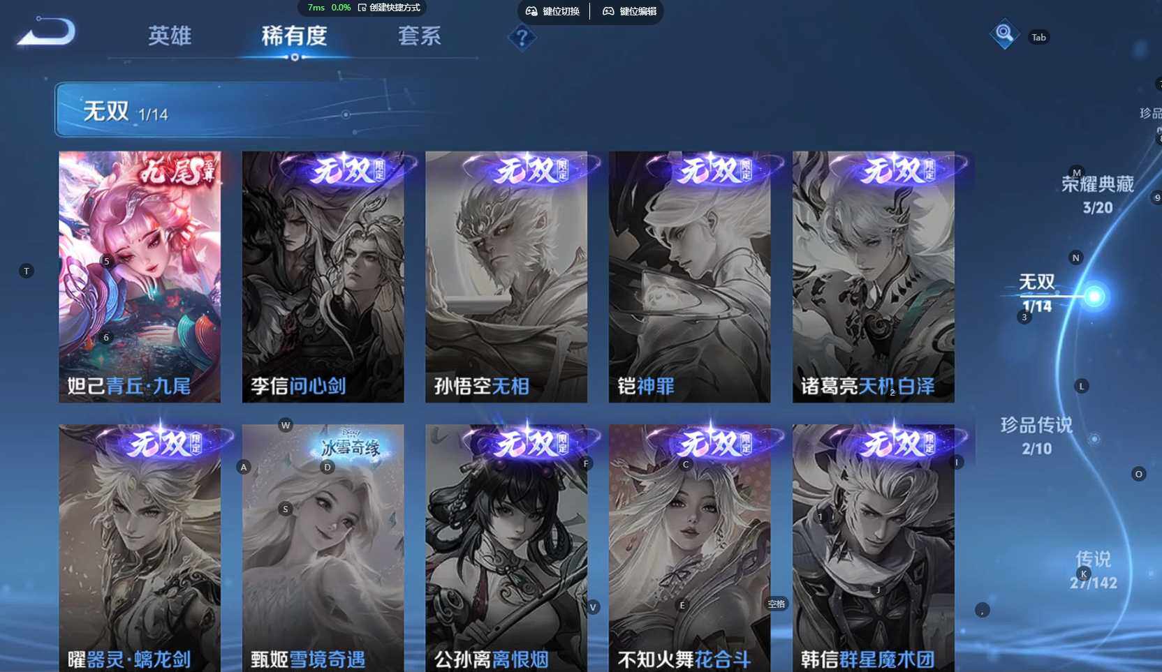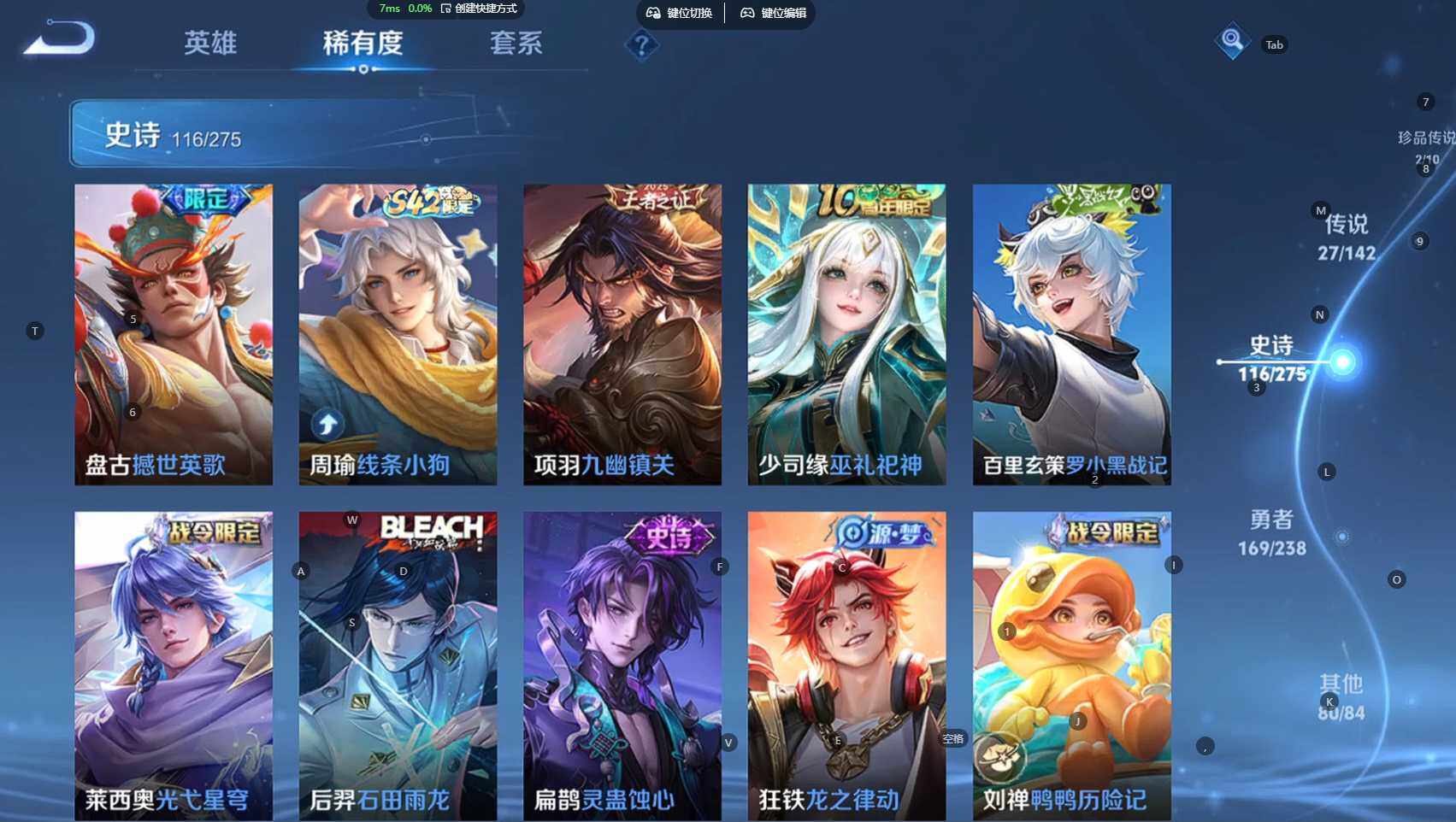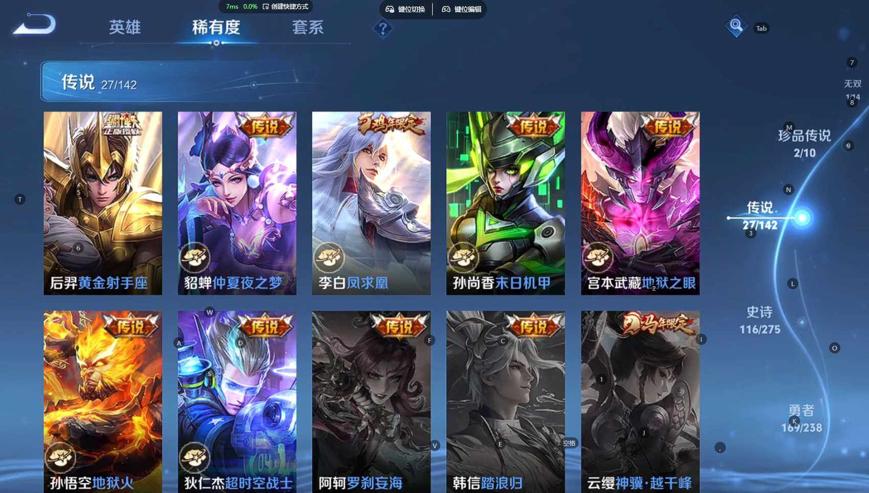 贵族等级:v9皮肤数:398传说品质27 生肖限定10 荣耀典藏3 情人节限定3 无双1 珍品传说2 英雄数:128