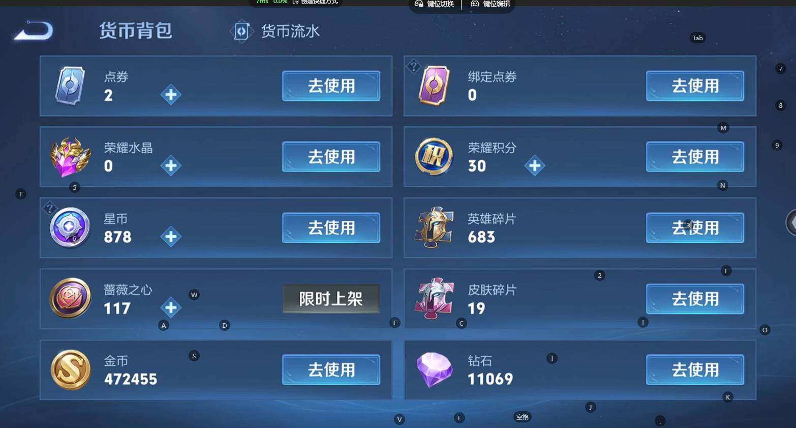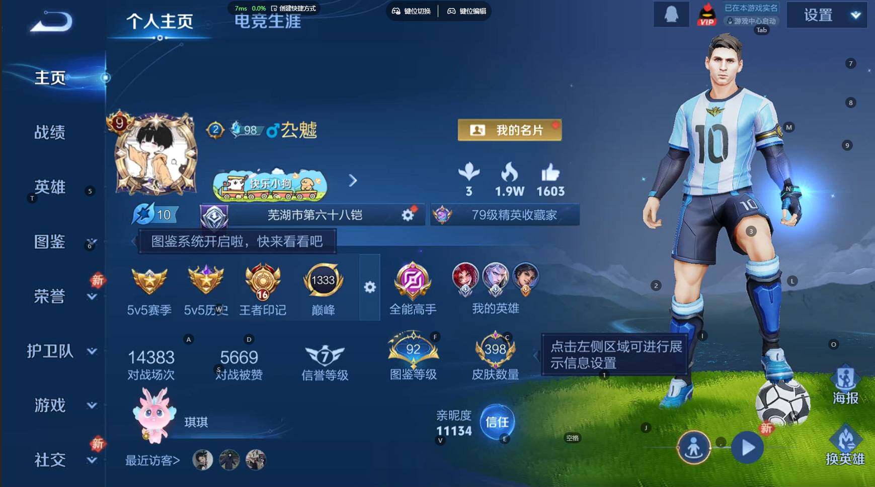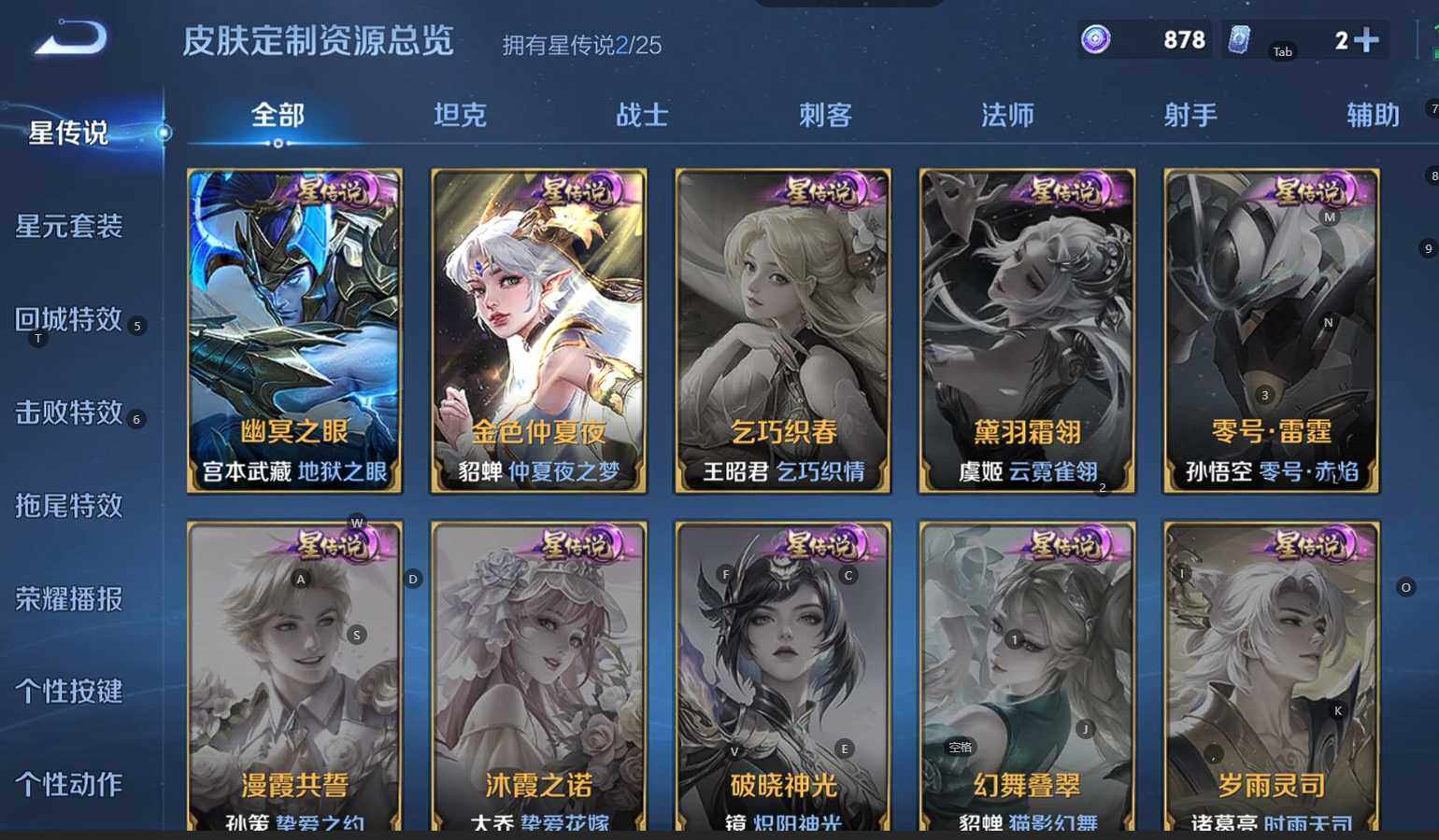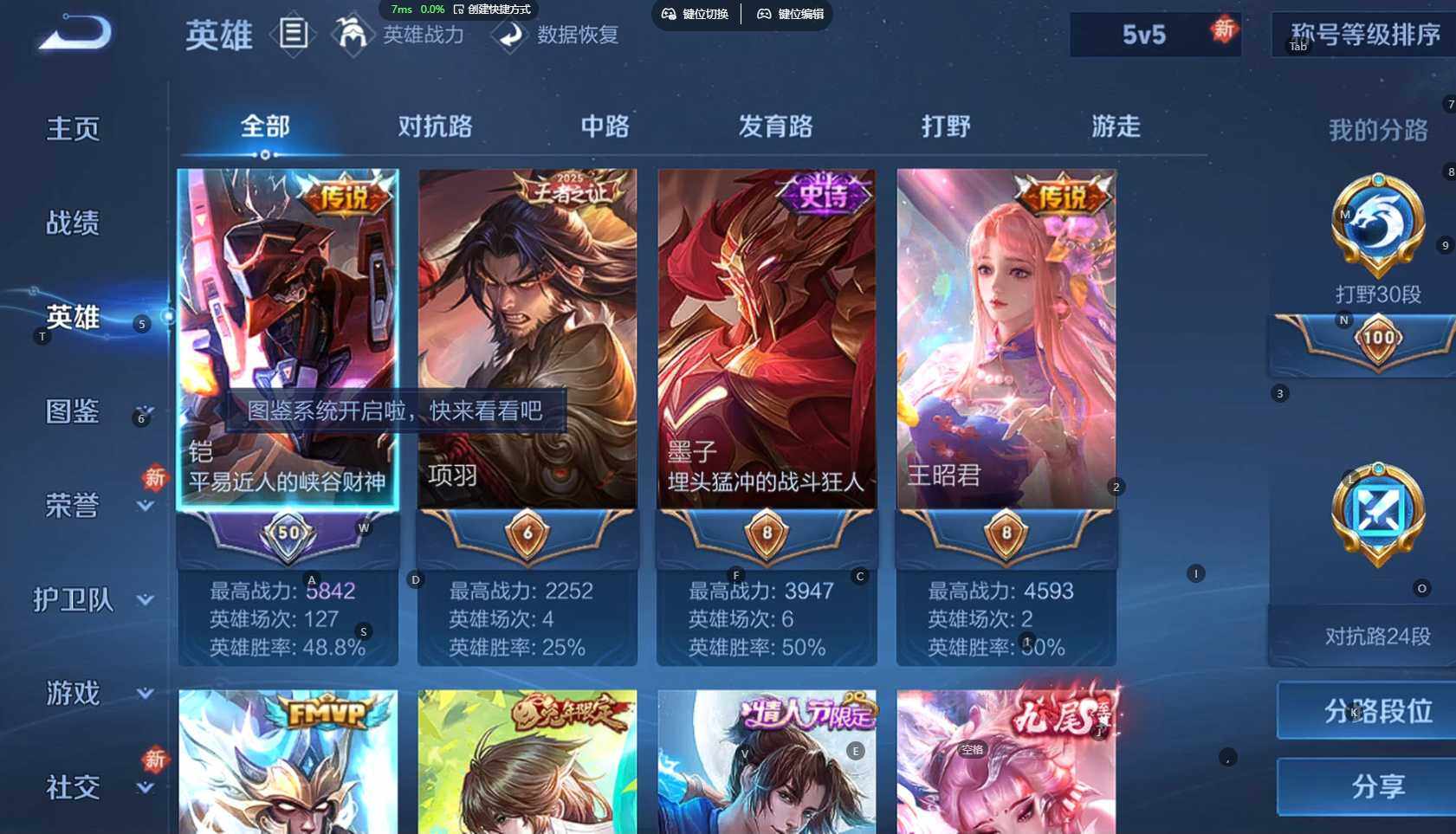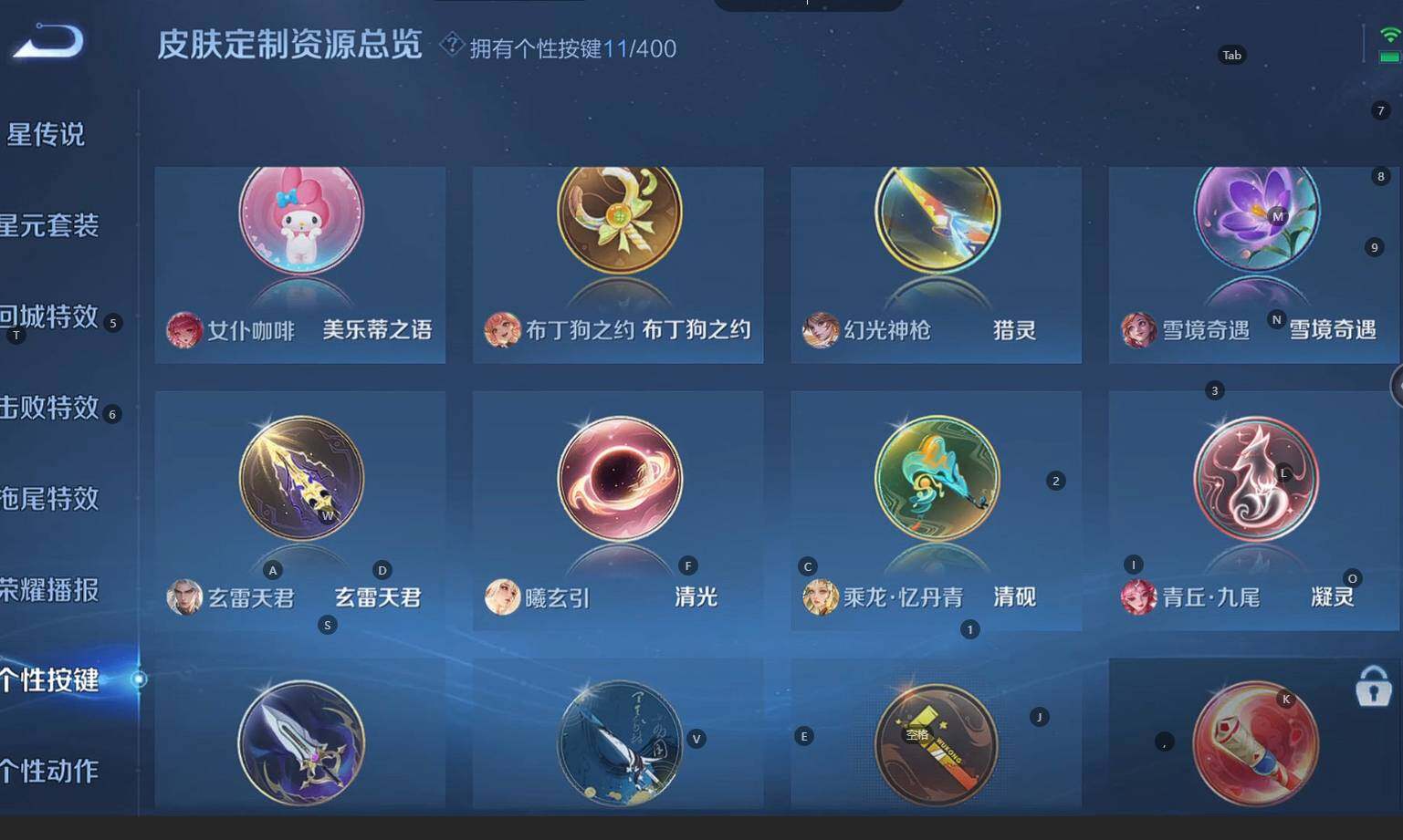 贵族等级:v9皮肤数:398传说品质27 生肖限定10 荣耀典藏3 情人节限定3 无双1 珍品传说2 英雄数:128