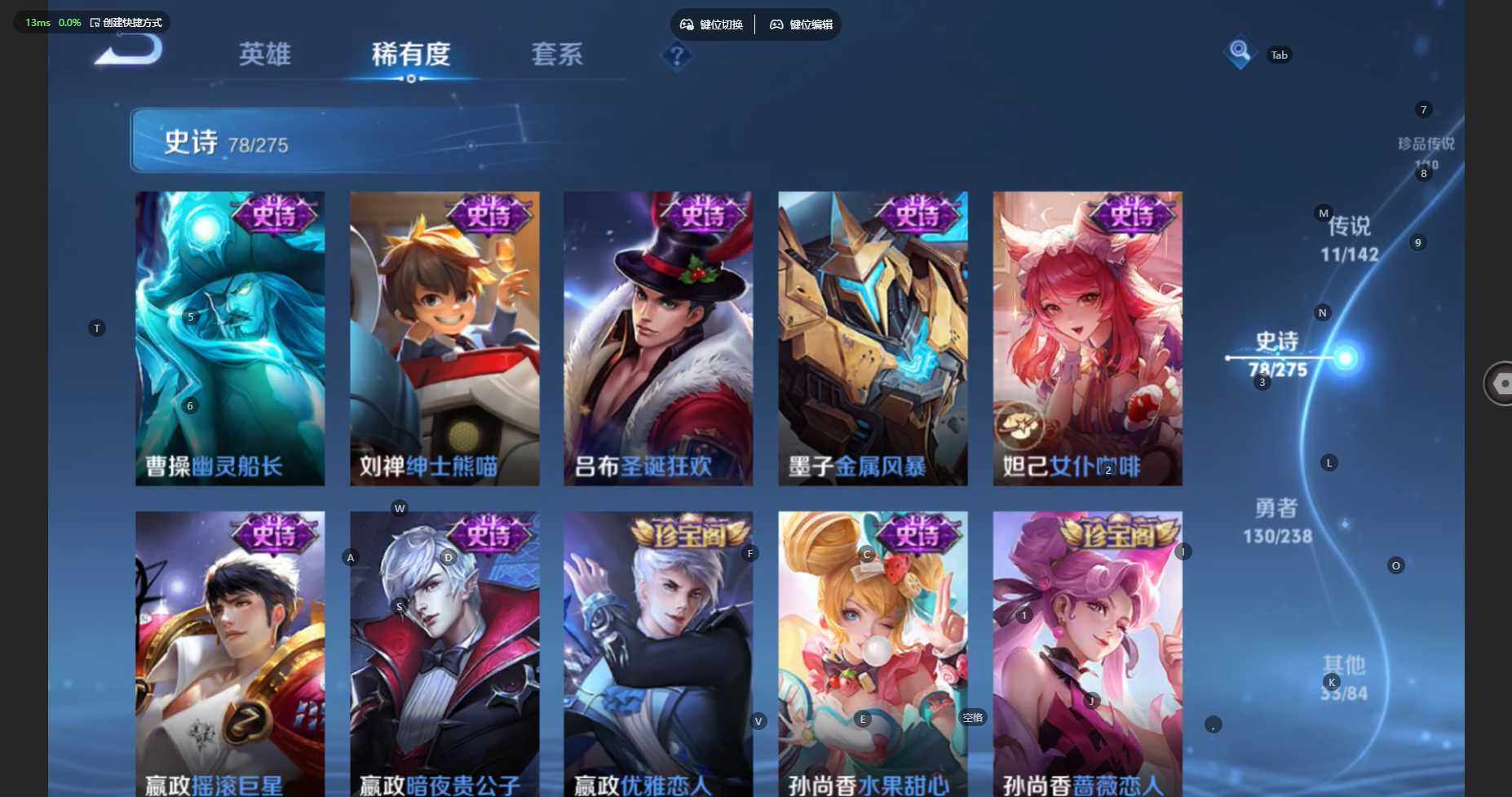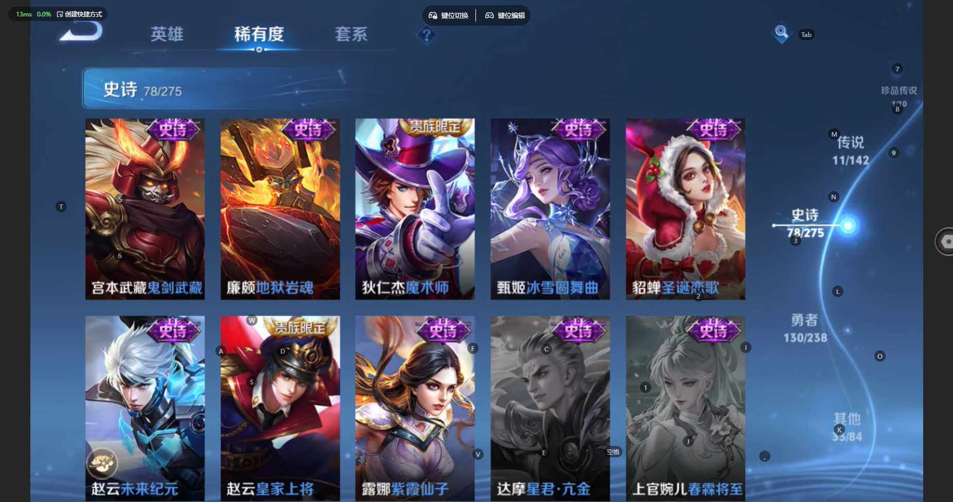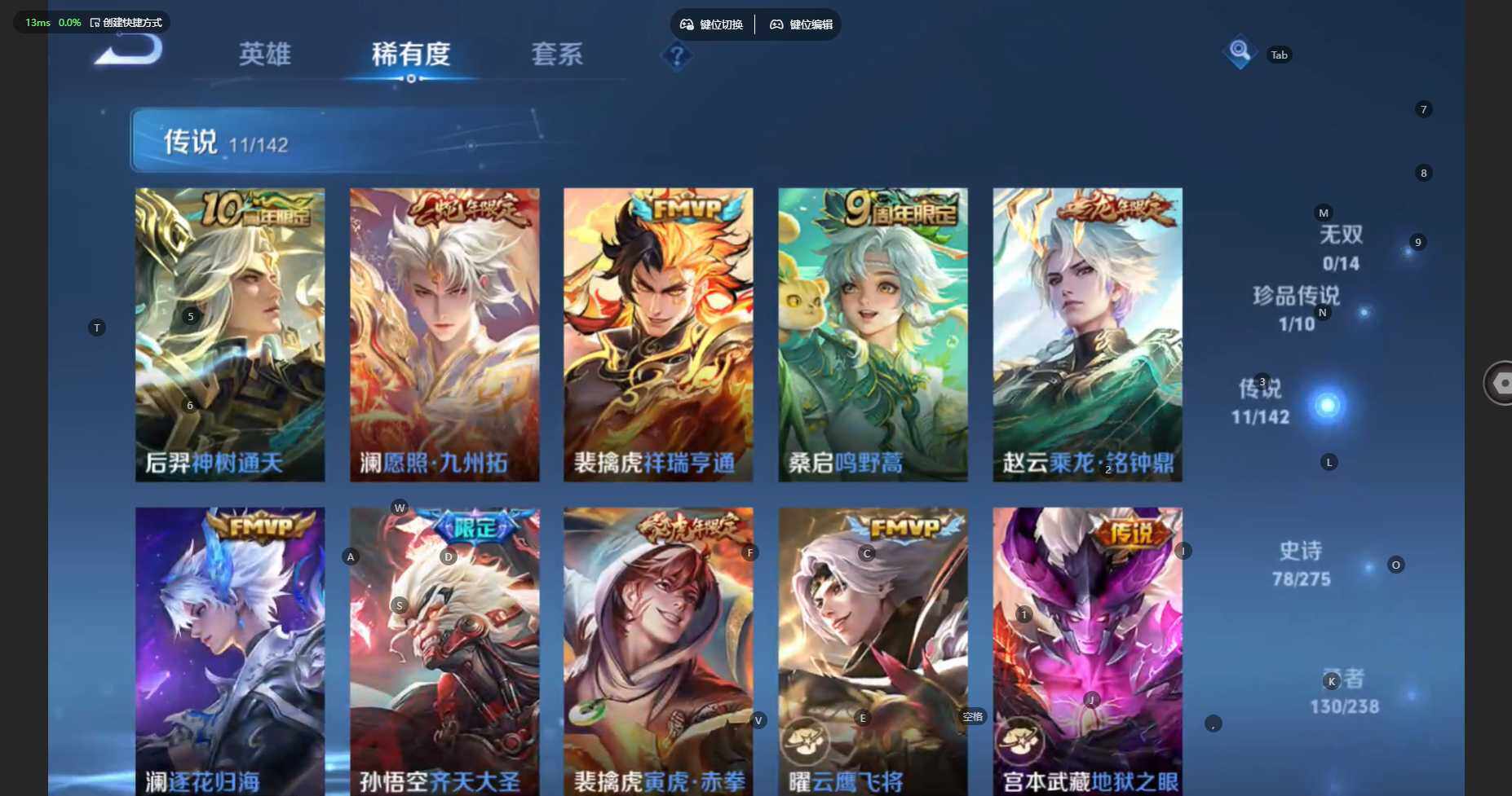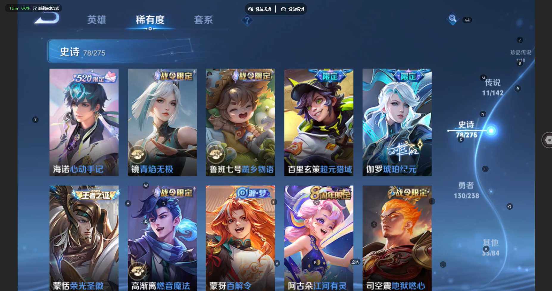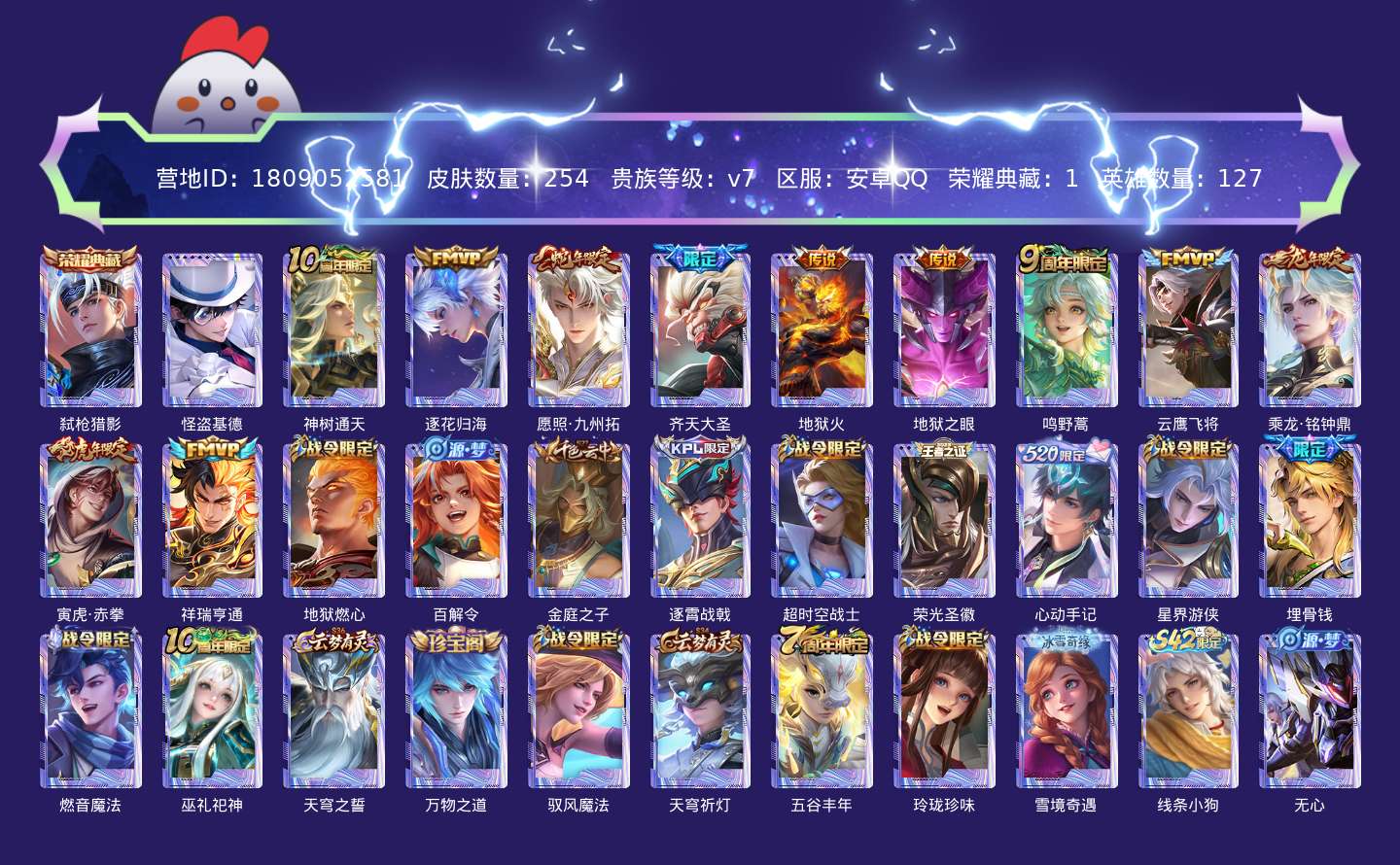 贵族等级:v7皮肤数:254传说品质11 生肖限定4 珍品传说1 荣耀典藏1 英雄数:127