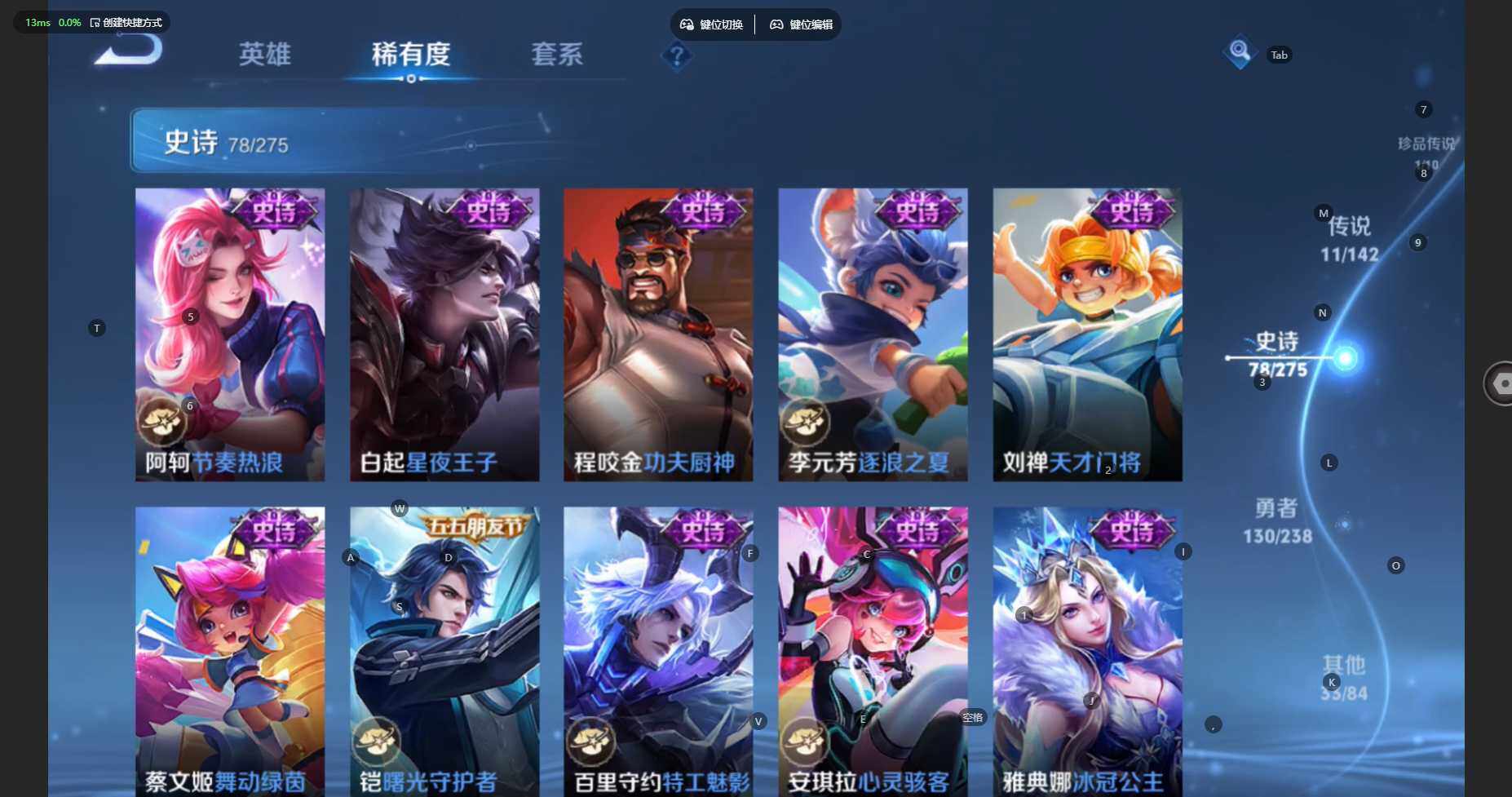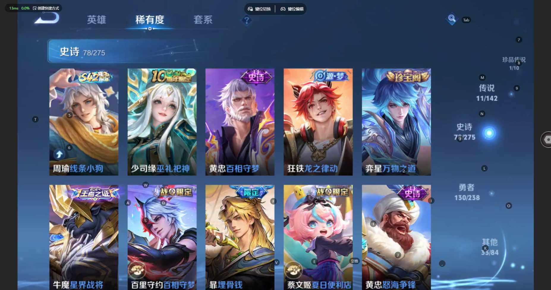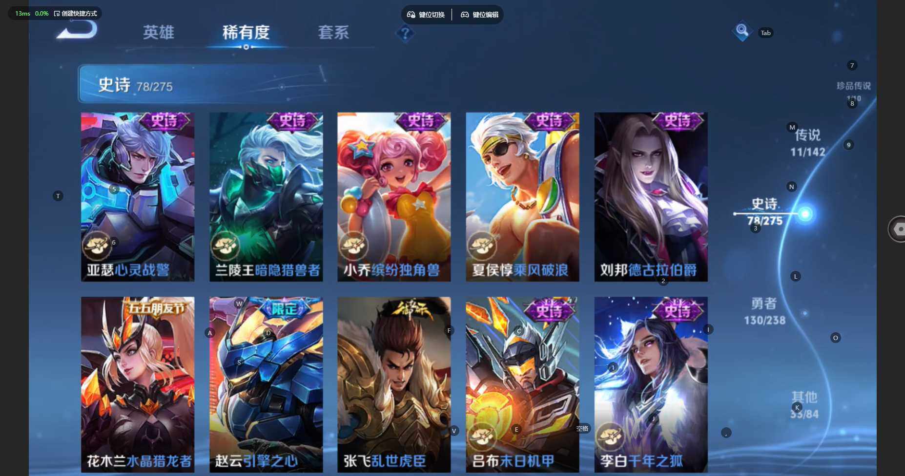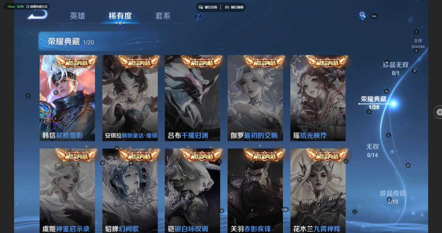 贵族等级:v7皮肤数:254传说品质11 生肖限定4 珍品传说1 荣耀典藏1 英雄数:127