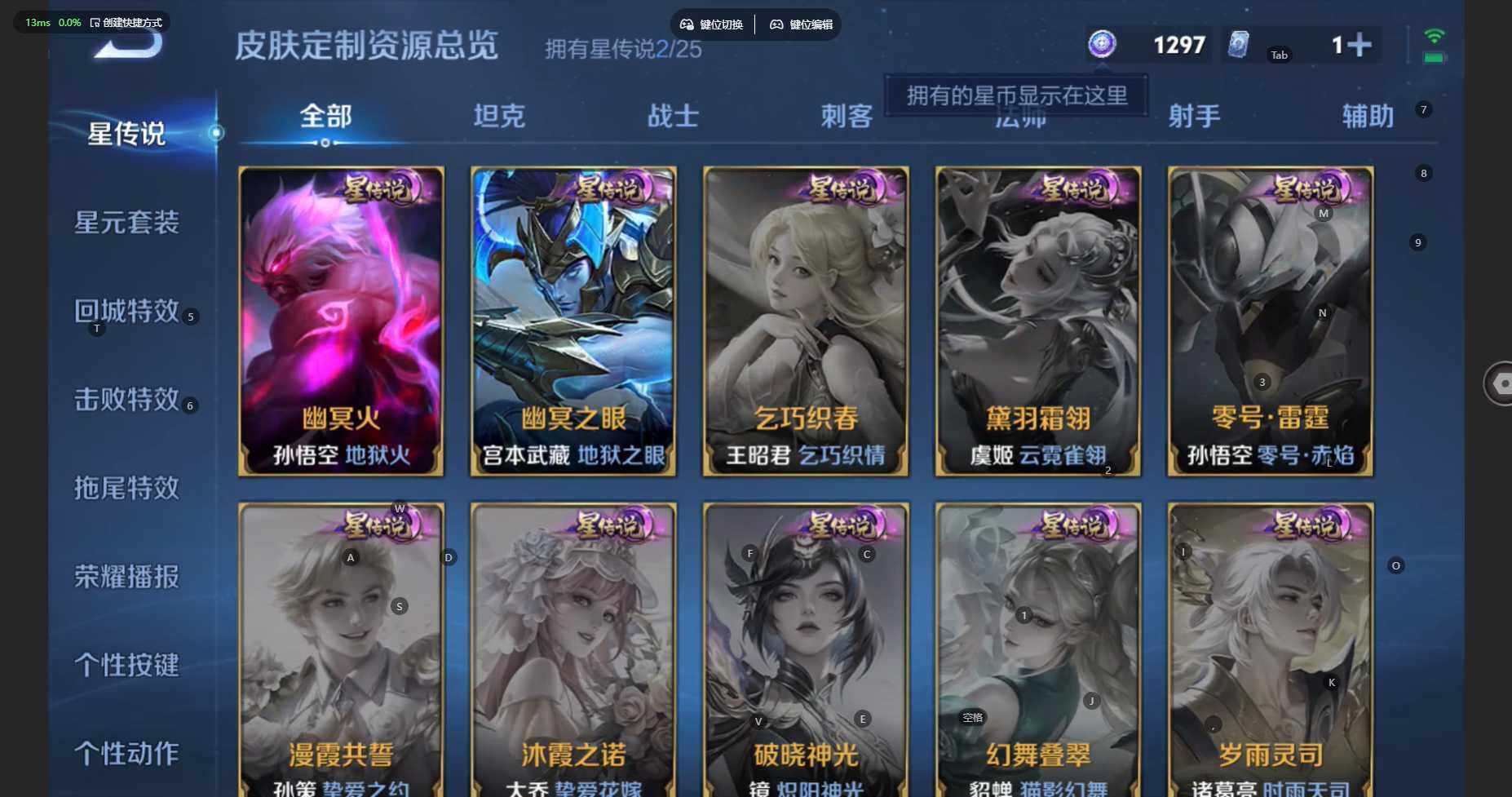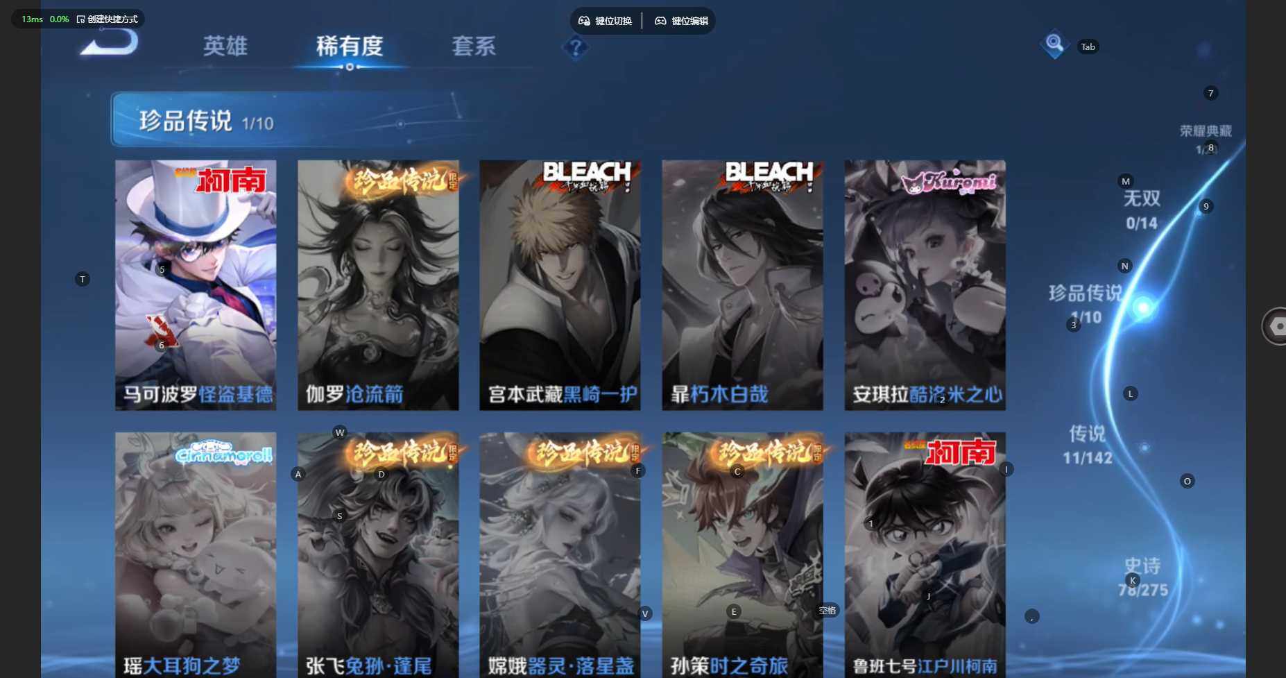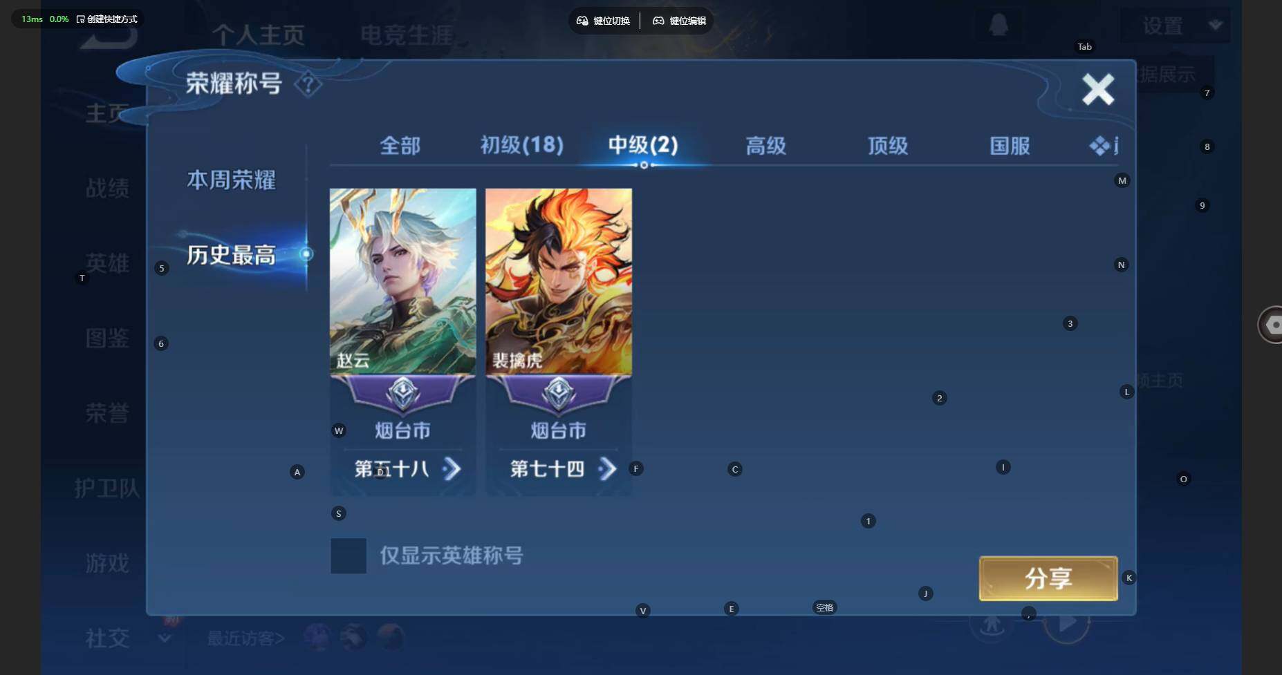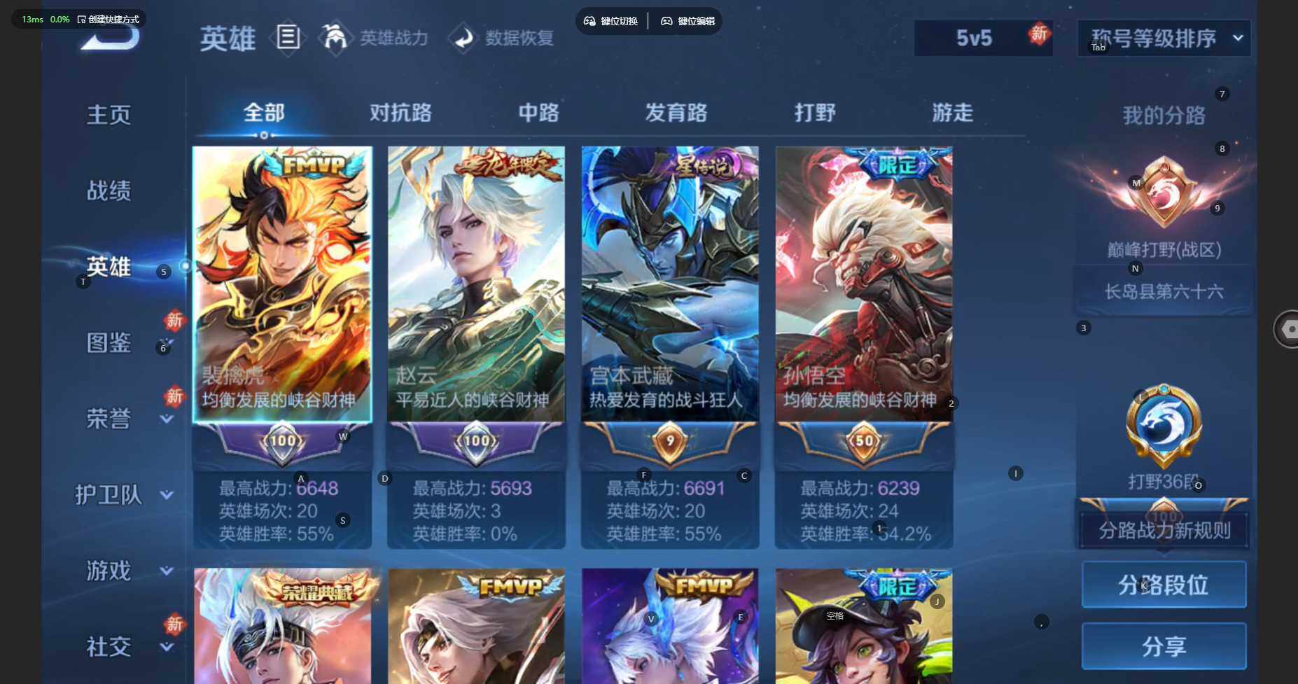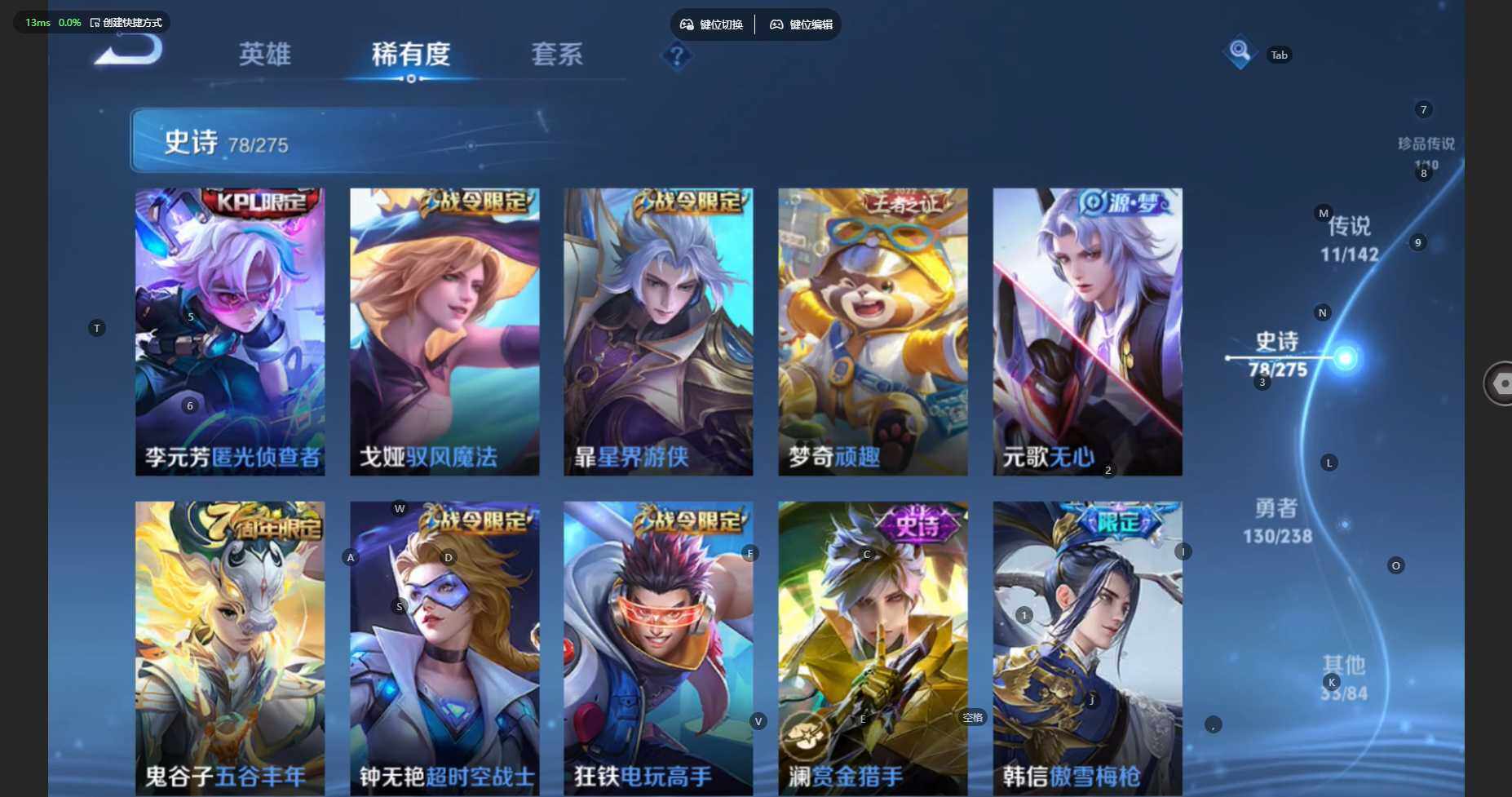 贵族等级:v7皮肤数:254传说品质11 生肖限定4 珍品传说1 荣耀典藏1 英雄数:127
