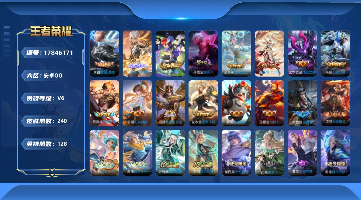 贵族等级:v6皮肤数:240传说品质10 生肖限定2 情人节限定2 荣耀典藏1 无双1 珍品传说1 英雄数:128