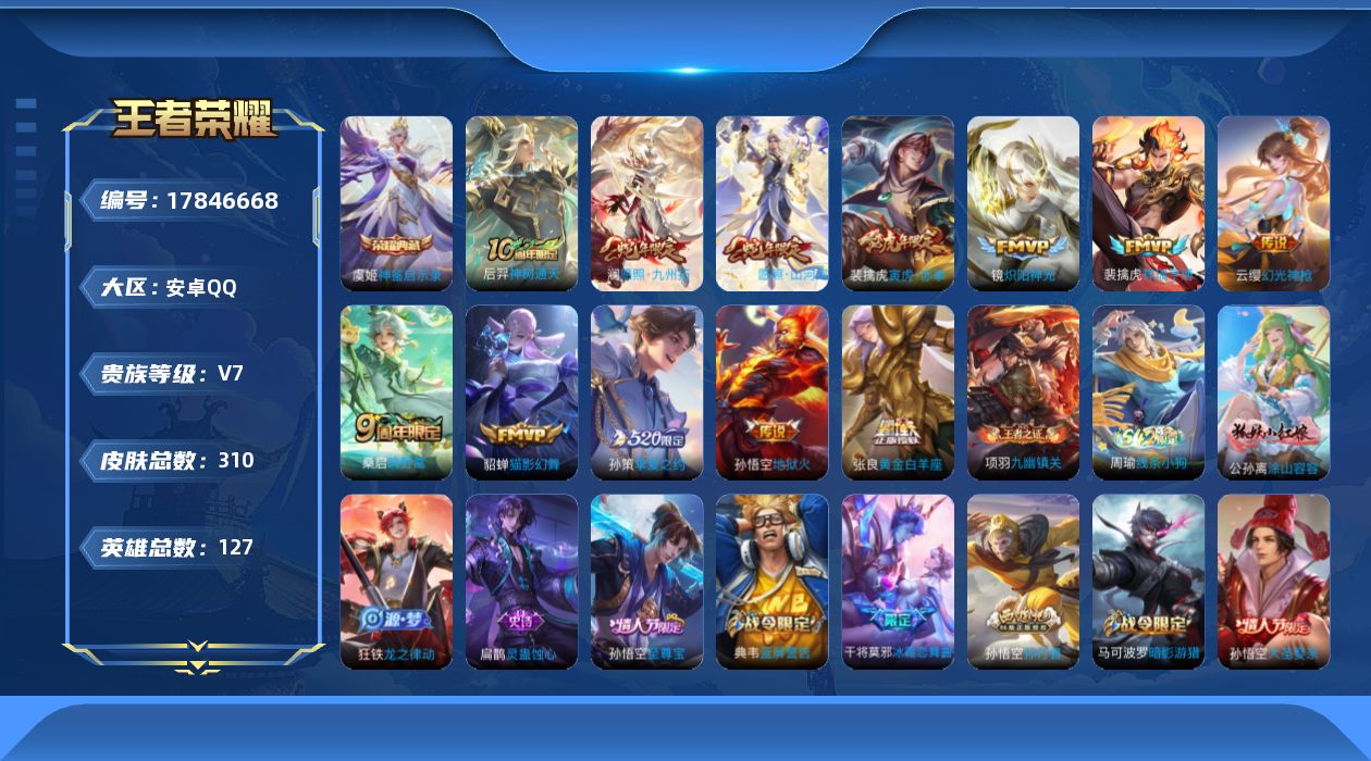 贵族等级:v7皮肤数:310传说品质12 生肖限定4 情人节限定2 荣耀典藏1 英雄数:127
