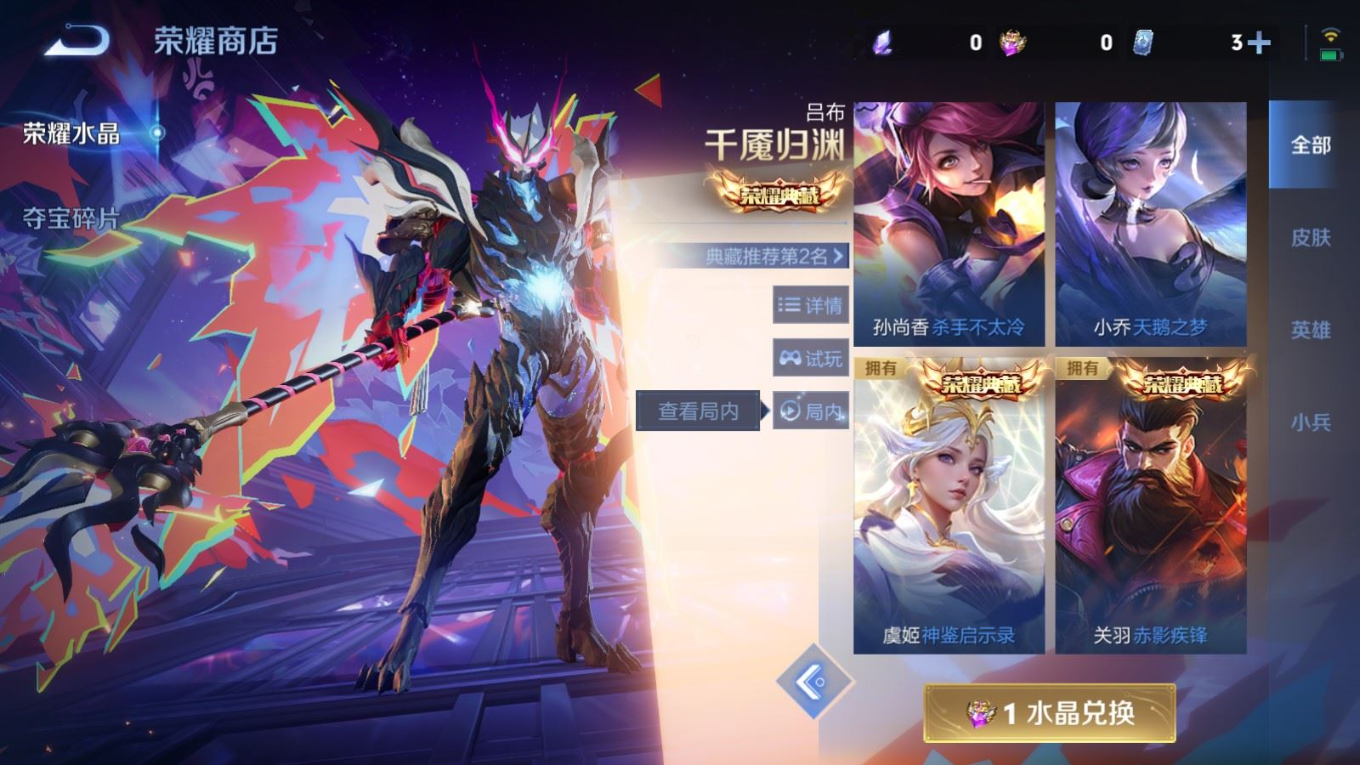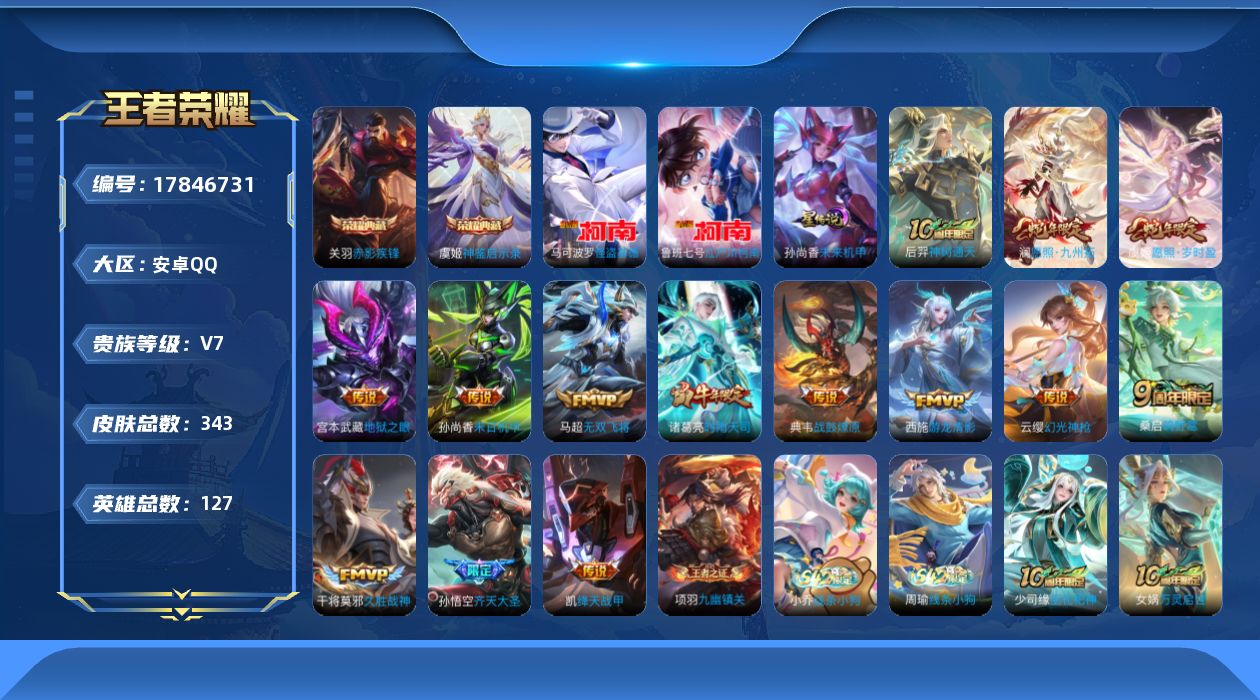 贵族等级:v7皮肤数:343传说品质14 荣耀典藏2 生肖限定4 情人节限定1 珍品传说2 英雄数:127