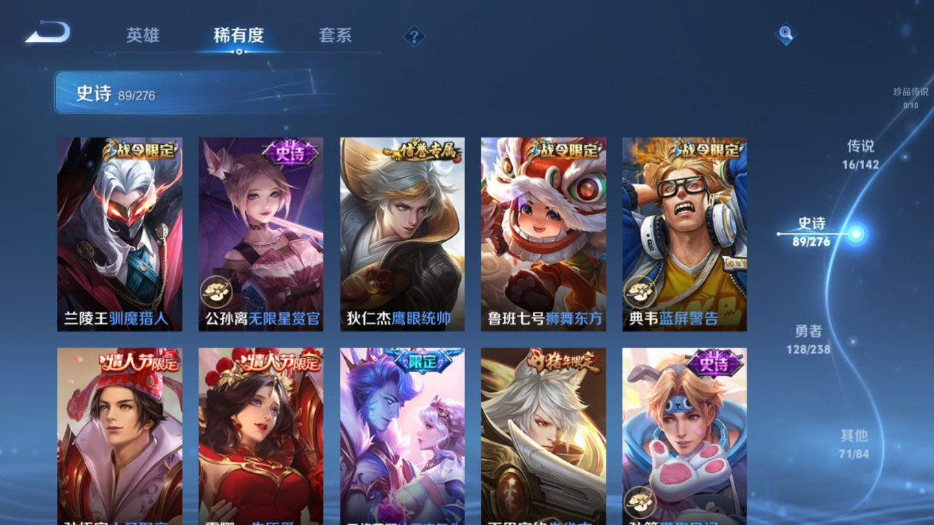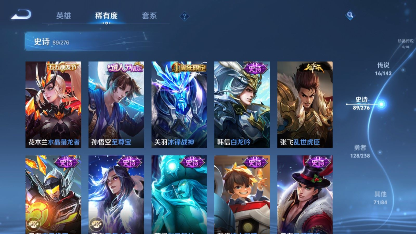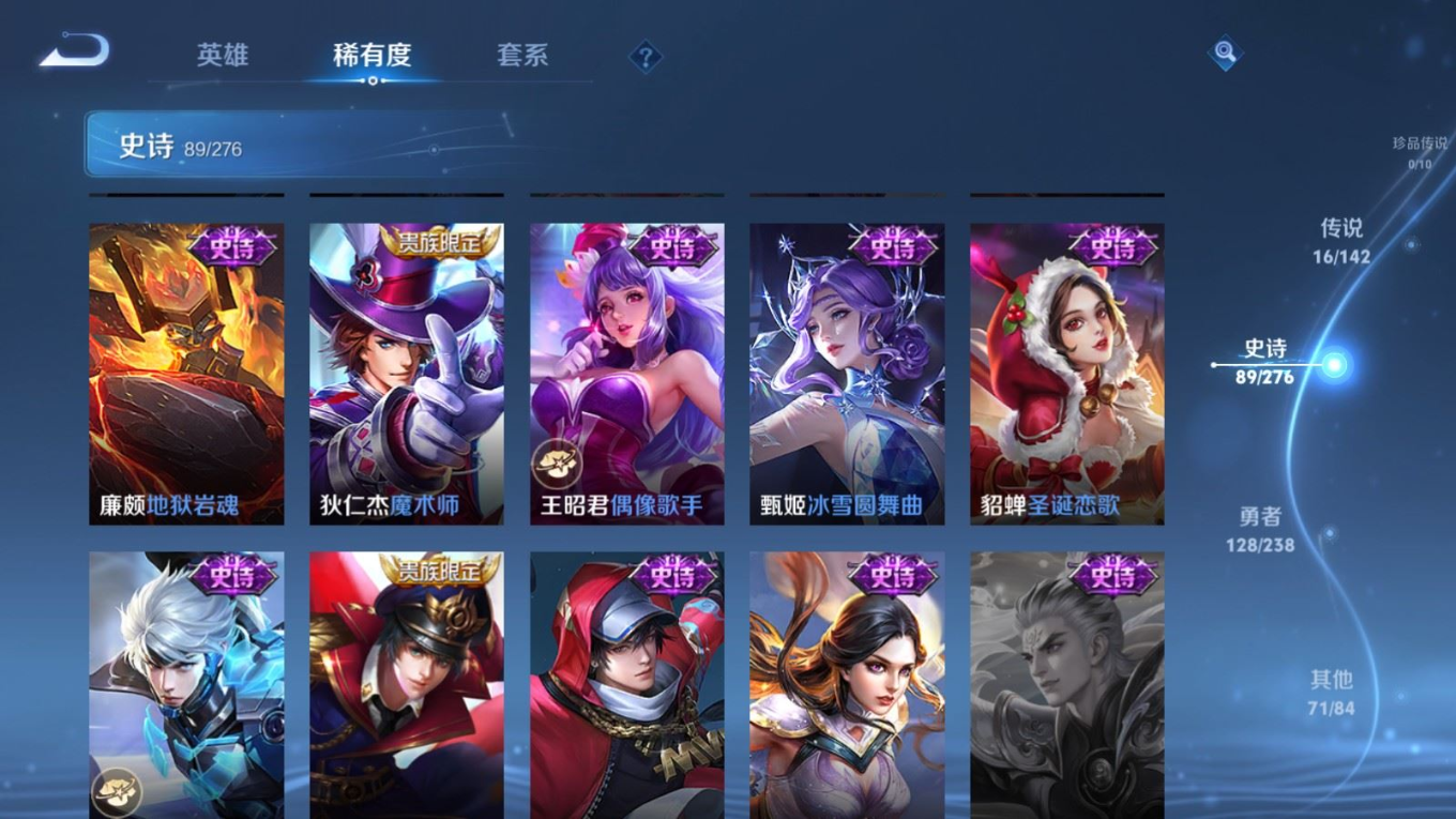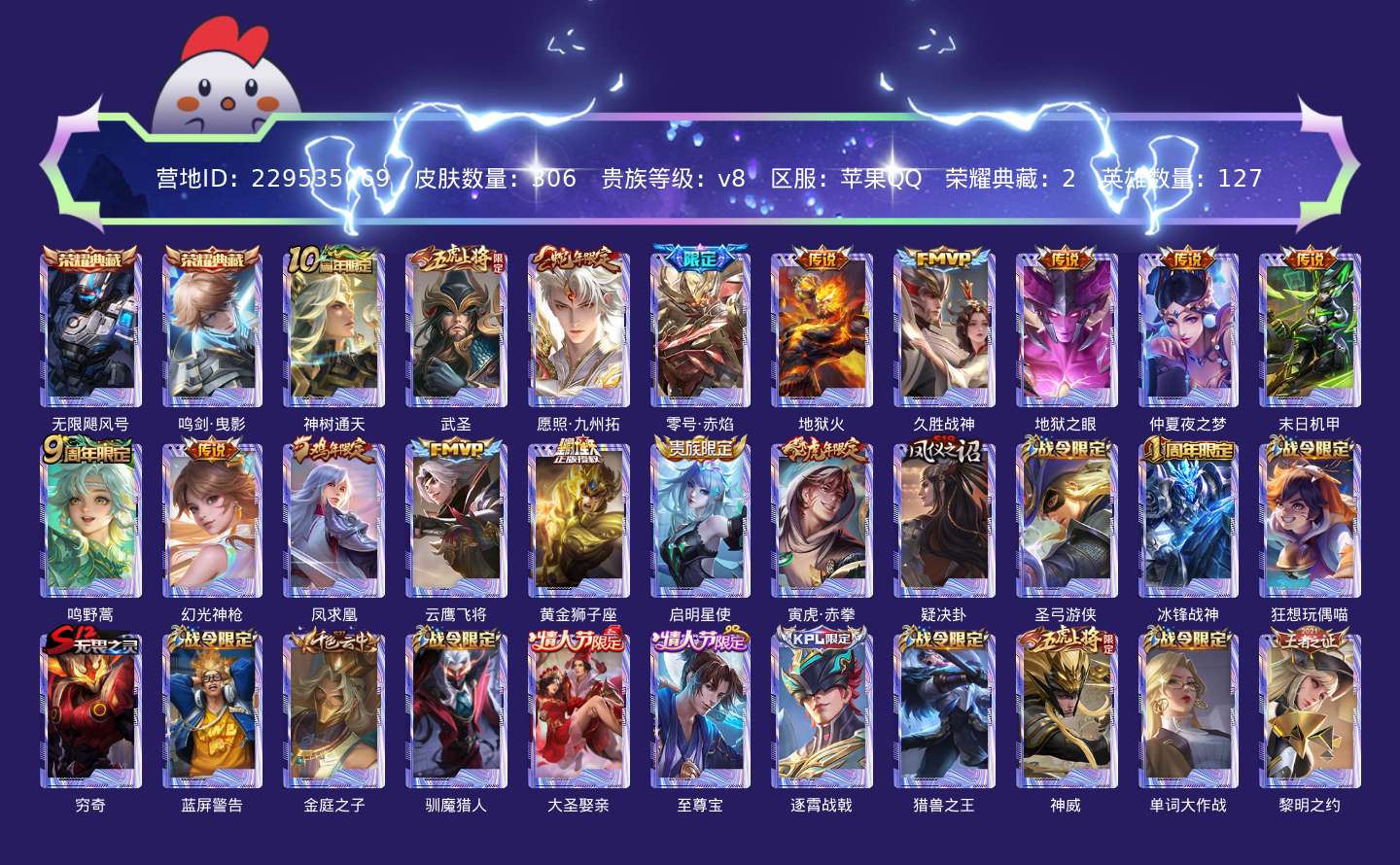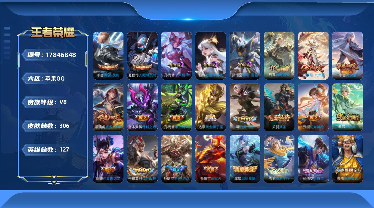 贵族等级:v8皮肤数:306传说品质16 生肖限定5 情人节限定3 荣耀典藏2 英雄数:127